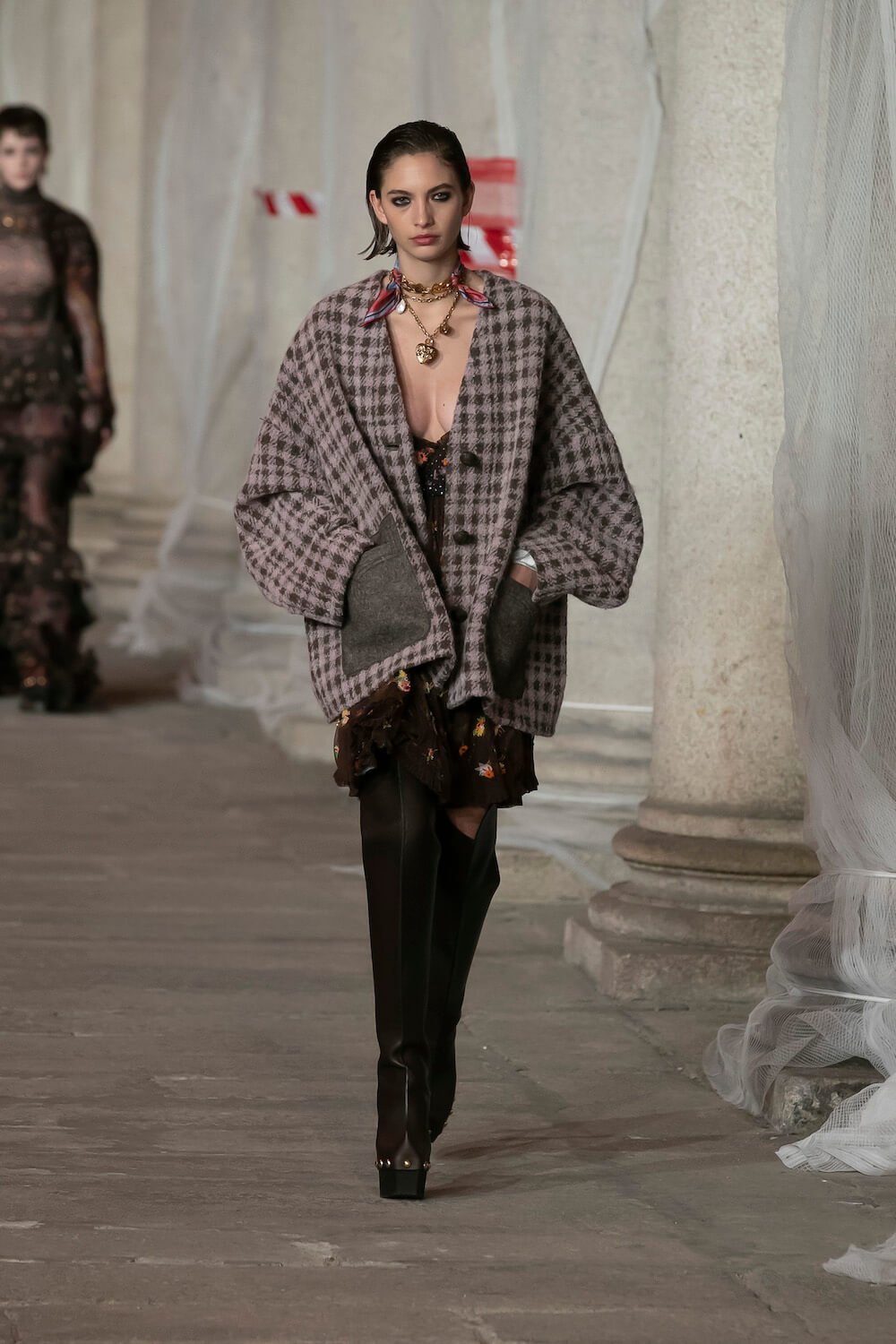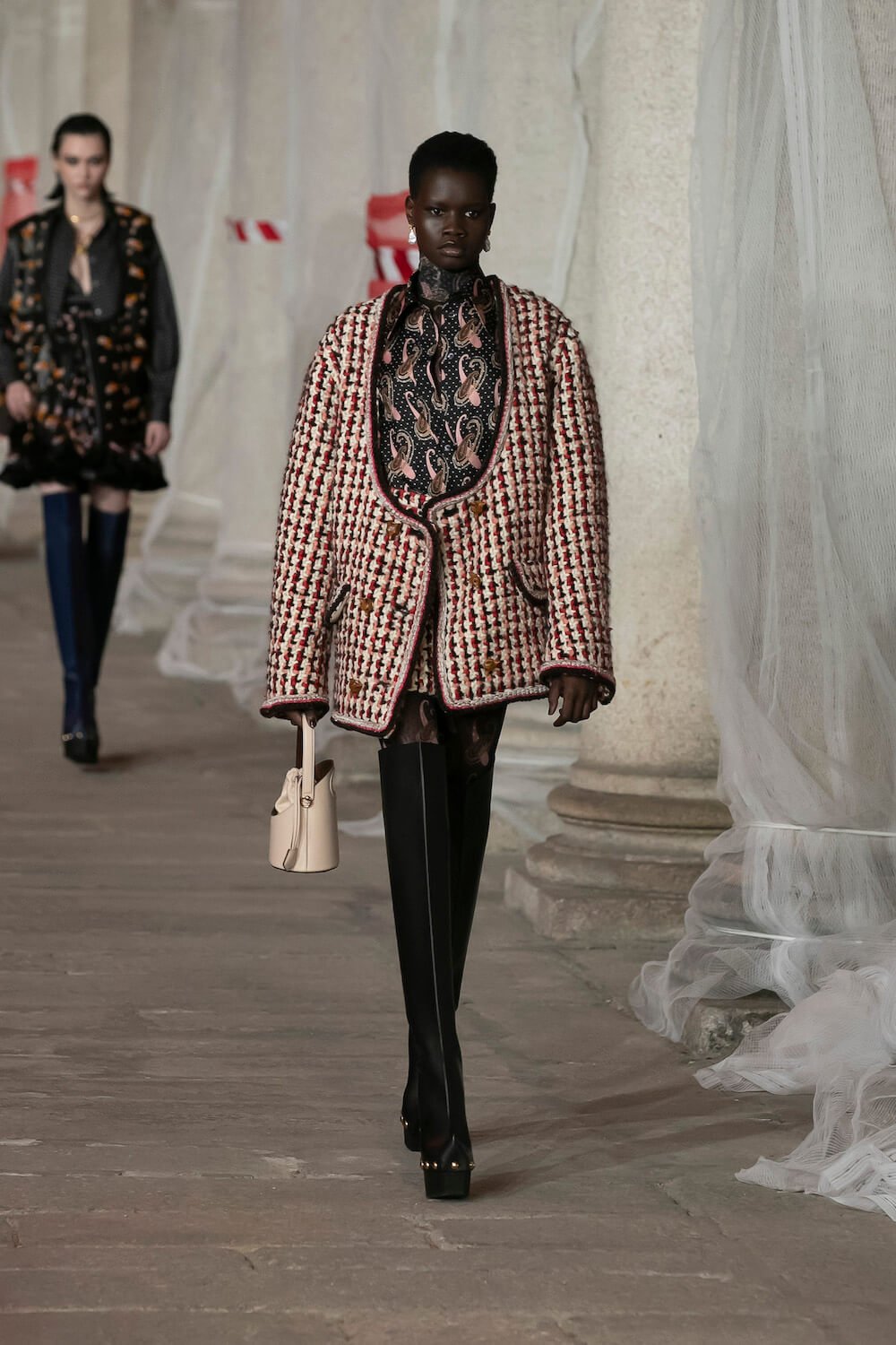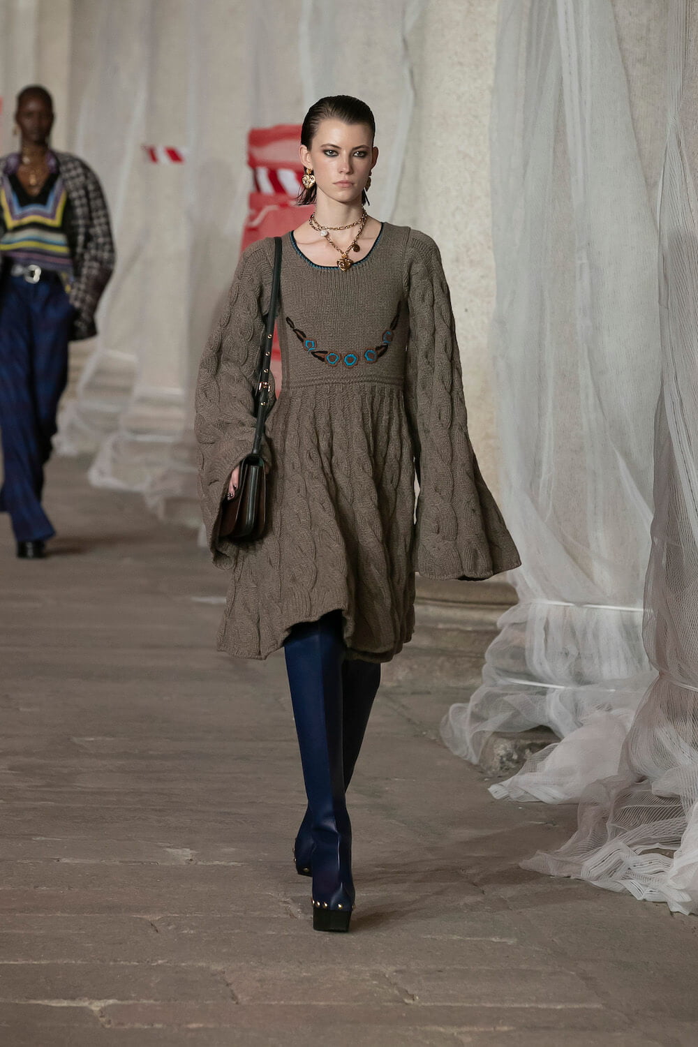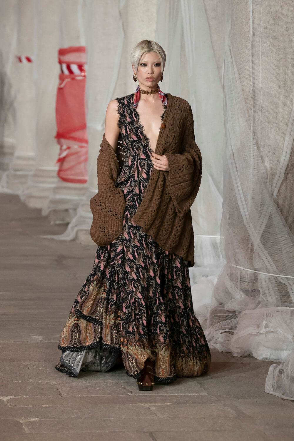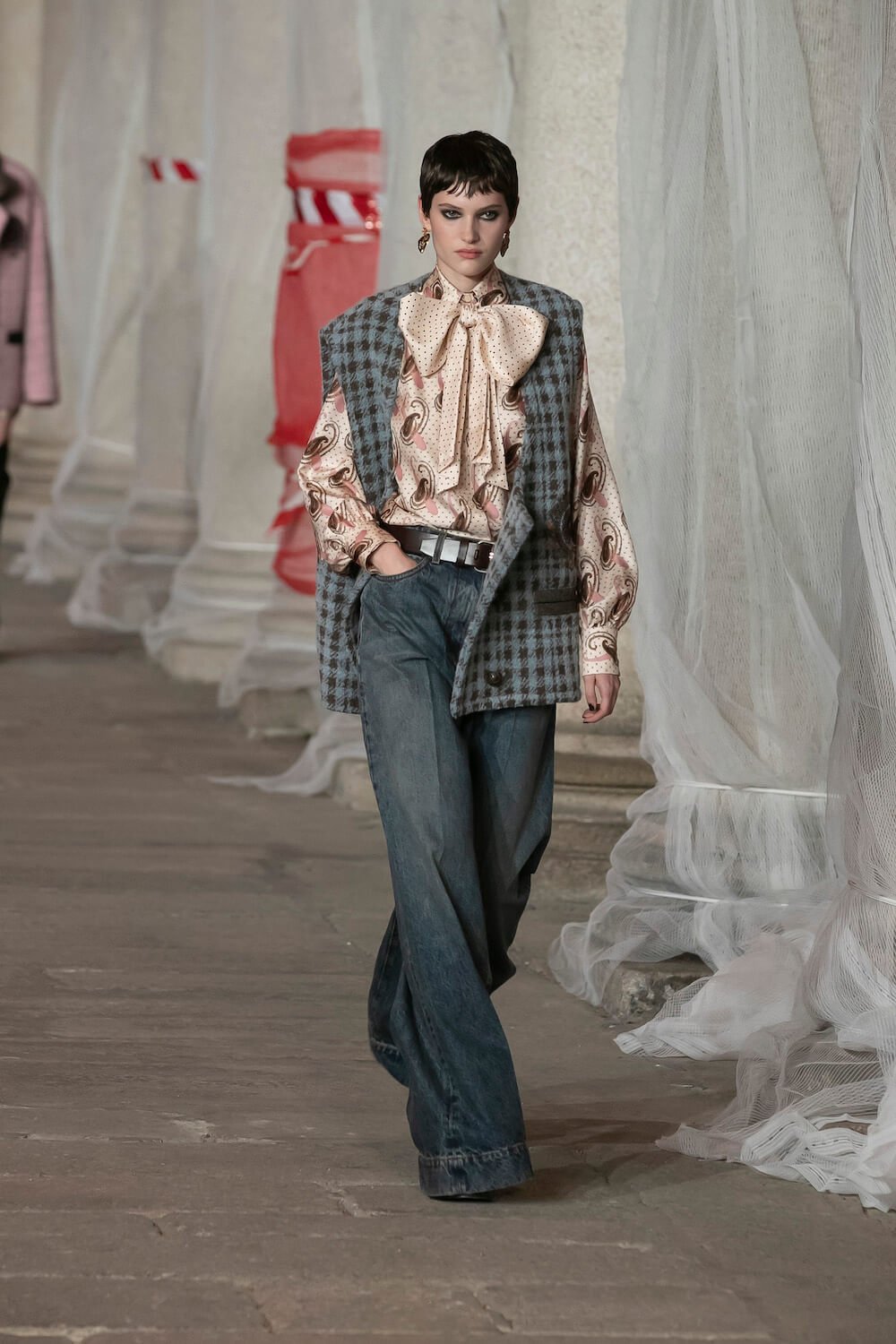Marching through an historic palazzo unmade into a construction zone – a physical manifestation of De Vincenzo’s radical exploration of the atelier – all the usual Etro fixings appeared at the AW23 show. Tartans, paisley and cravatteria motifs covered long flowing dresses and flouncy, frilled little numbers were paired with drooping, chunky argyle knits. Elsewhere genderless vests and matching trousers were percolated by billowing silk blouses. Opulent tailoring in beautiful brocards, slim pantsuits with elongated tailcoats and knit midi dresses swathed by checkered blankets were worn atop aladdin clogs that had been transformed into thigh-high boots and platform mary janes. Included in the collection came a triage of “Kind Knits”, striped jumpers that are part of a new, and expansive, see-now-buy-now upcycled capsule. This was a whole new kind of retro cool.
