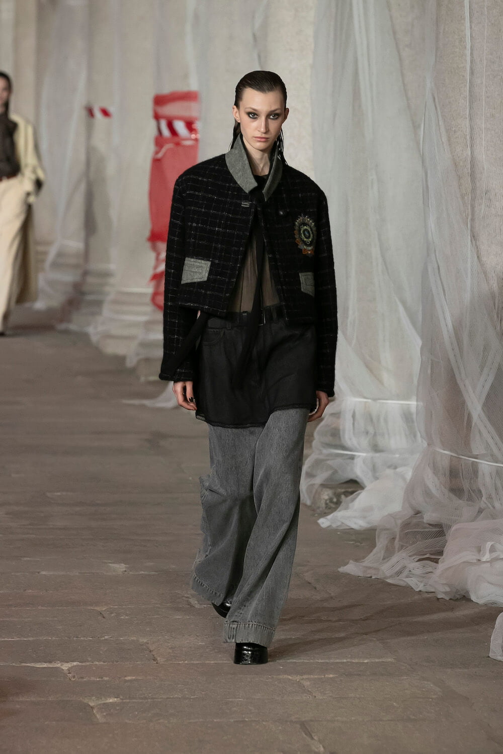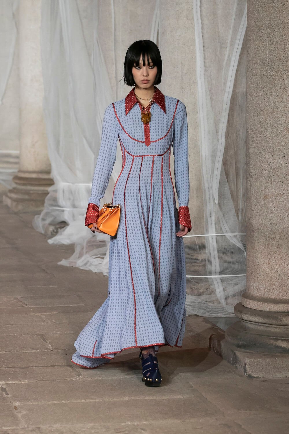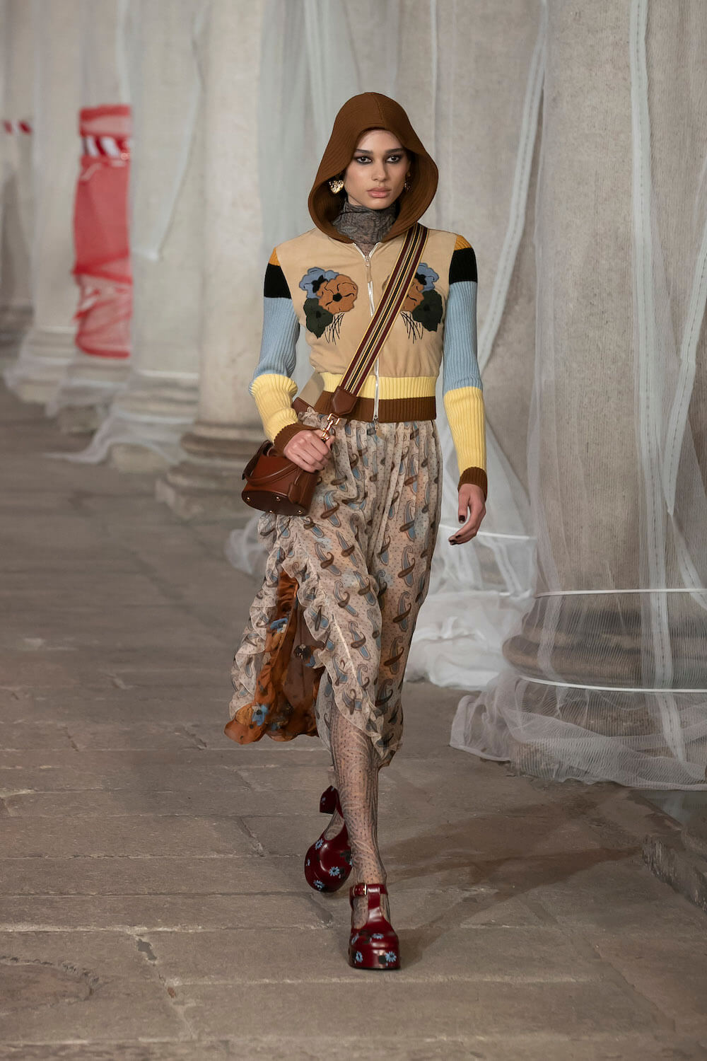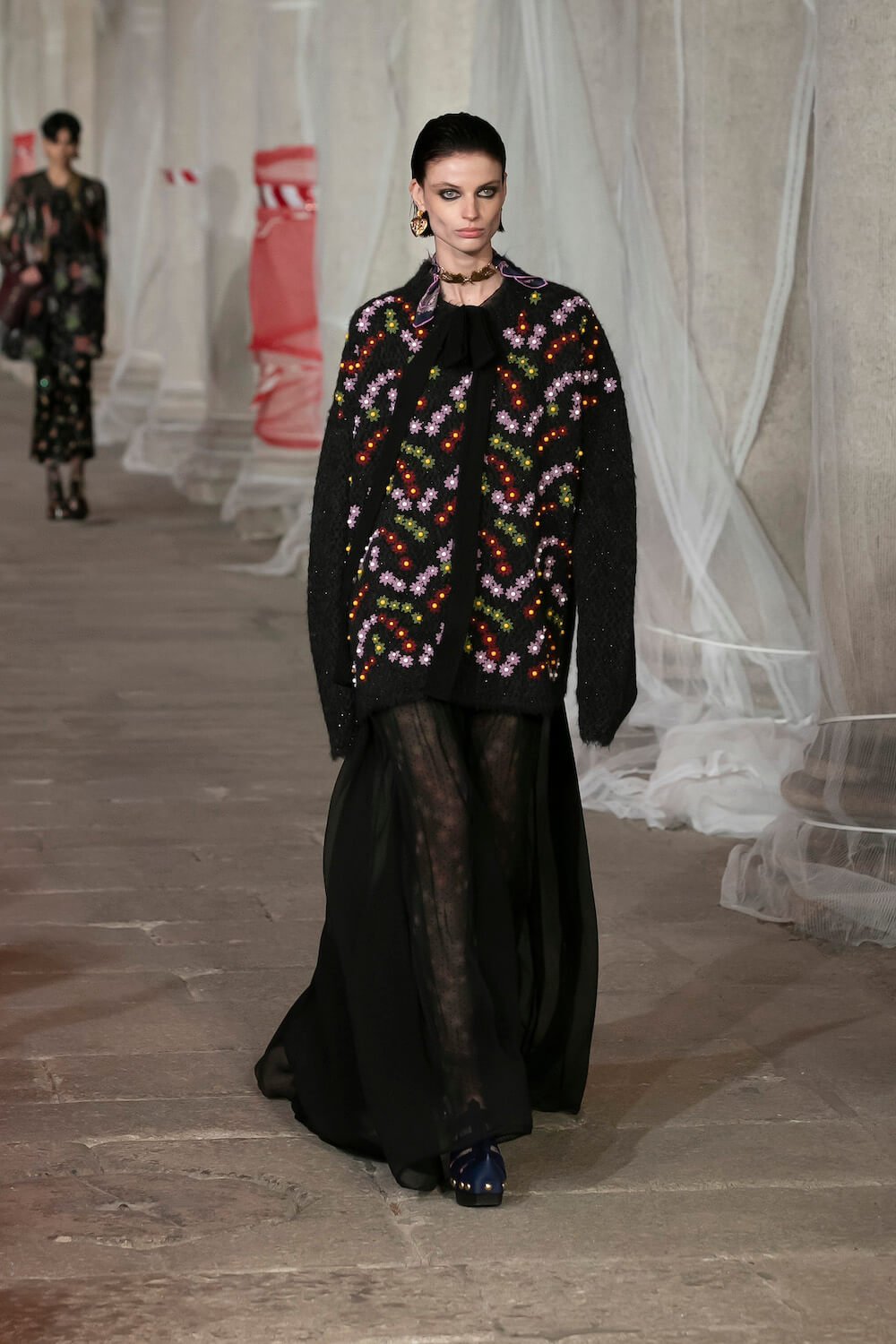 Marching through an historic palazzo unmade into a construction zone – a physical manifestation of De Vincenzo’s radical exploration of the atelier – all the usual Etro fixings appeared at the AW23 show. Tartans, paisley and cravatteria motifs covered long flowing dresses and flouncy, frilled little numbers were paired with drooping, chunky argyle knits. Elsewhere genderless vests and matching trousers were percolated by billowing silk blouses. Opulent tailoring in beautiful brocards, slim pantsuits with elongated tailcoats and knit midi dresses swathed by checkered blankets were worn atop aladdin clogs that had been transformed into thigh-high boots and platform mary janes. Included in the collection came a triage of “Kind Knits”, striped jumpers that are part of a new, and expansive, see-now-buy-now upcycled capsule. This was a whole new kind of retro cool.