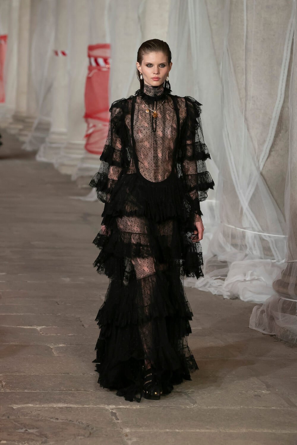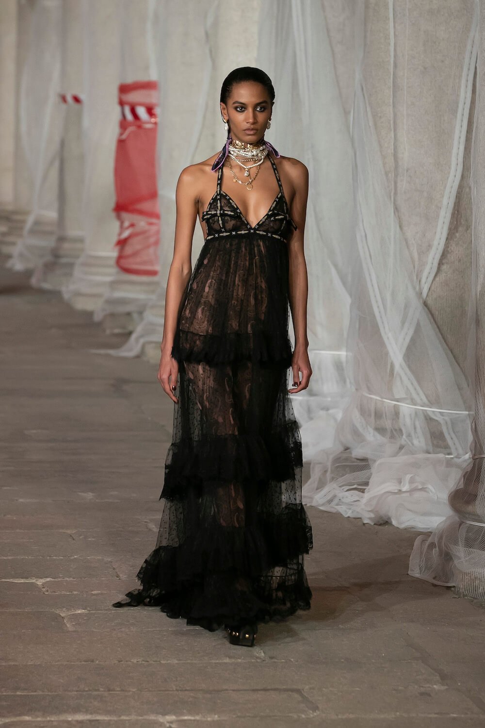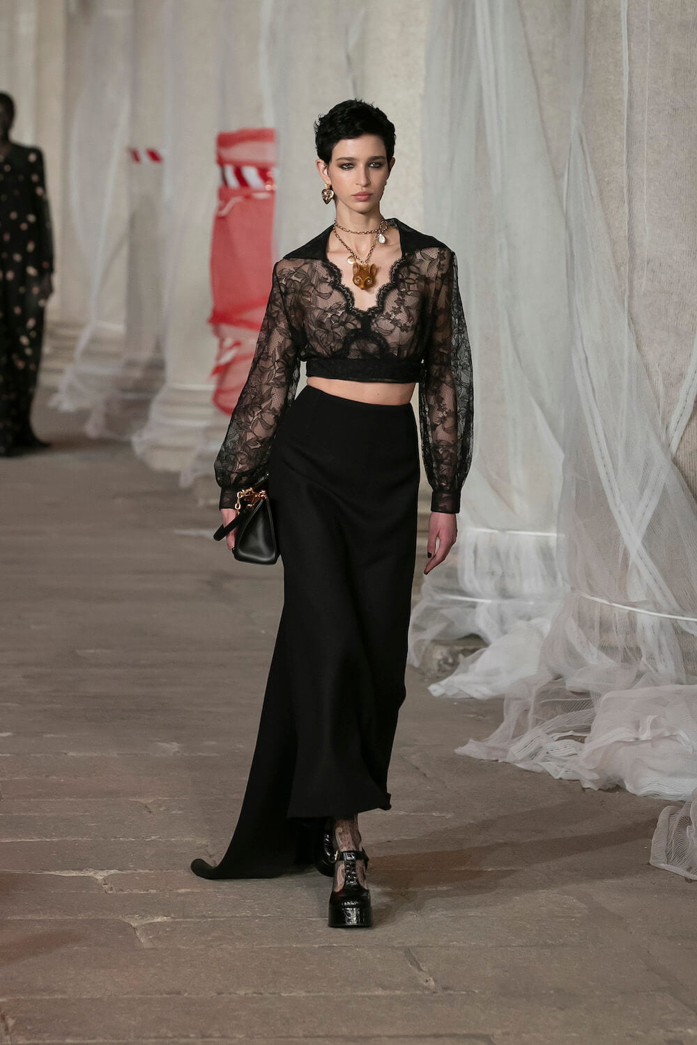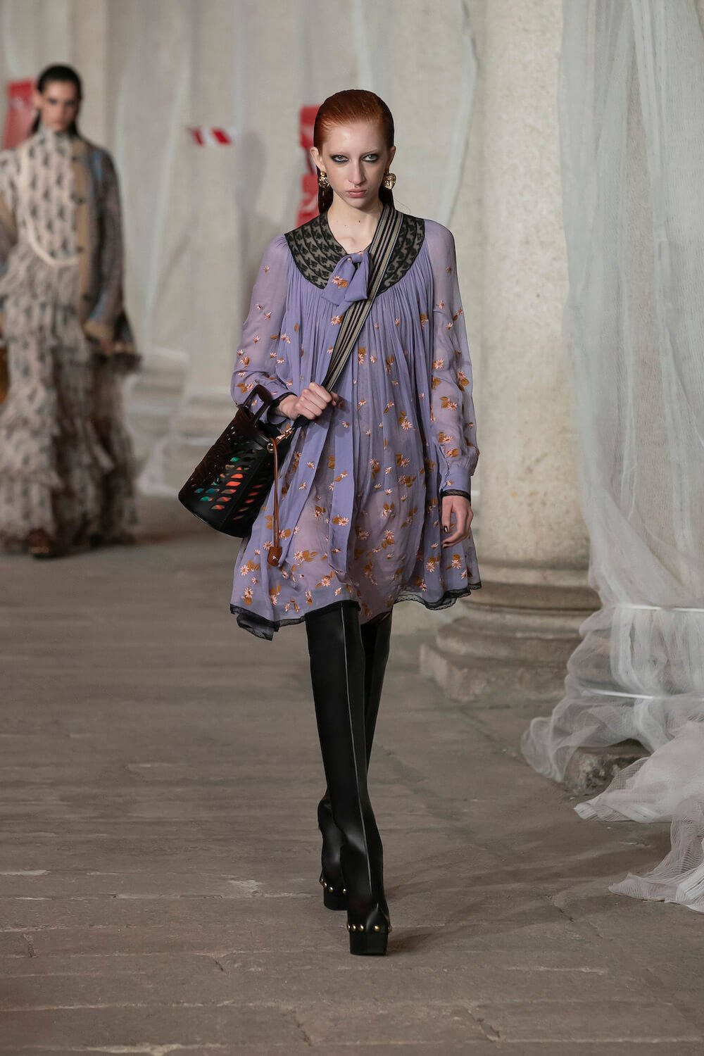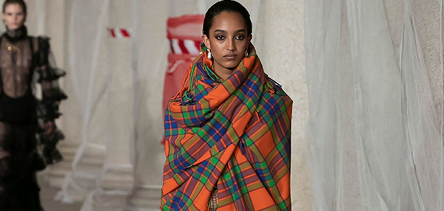 Marching through an historic palazzo unmade into a construction zone – a physical manifestation of De Vincenzo’s radical exploration of the atelier – all the usual Etro fixings appeared at the AW23 show. Tartans, paisley and cravatteria motifs covered long flowing dresses and flouncy, frilled little numbers were paired with drooping, chunky argyle knits. Elsewhere genderless vests and matching trousers were percolated by billowing silk blouses. Opulent tailoring in beautiful brocards, slim pantsuits with elongated tailcoats and knit midi dresses swathed by checkered blankets were worn atop aladdin clogs that had been transformed into thigh-high boots and platform mary janes. Included in the collection came a triage of “Kind Knits”, striped jumpers that are part of a new, and expansive, see-now-buy-now upcycled capsule. This was a whole new kind of retro cool.