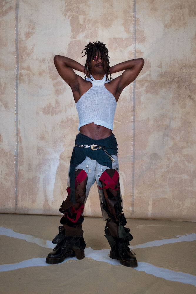 Then there’s newbie HRH, a London-based accessories designer (and former gymnast), who specialises in ultra-desirable, padded bags and purses in all shapes and sizes. She’s joined by Jawara Alleyne, a Central Saint Martins grad who looks to Caribbean mythology to inform his explosive menswear. Shredded trousers, hand-draped jackets and campy silhouettes, inspired by pirates, slash outmoded masculine dress codes in half, then quarters, then into a million pieces that are left helpless on the floor. En garde!