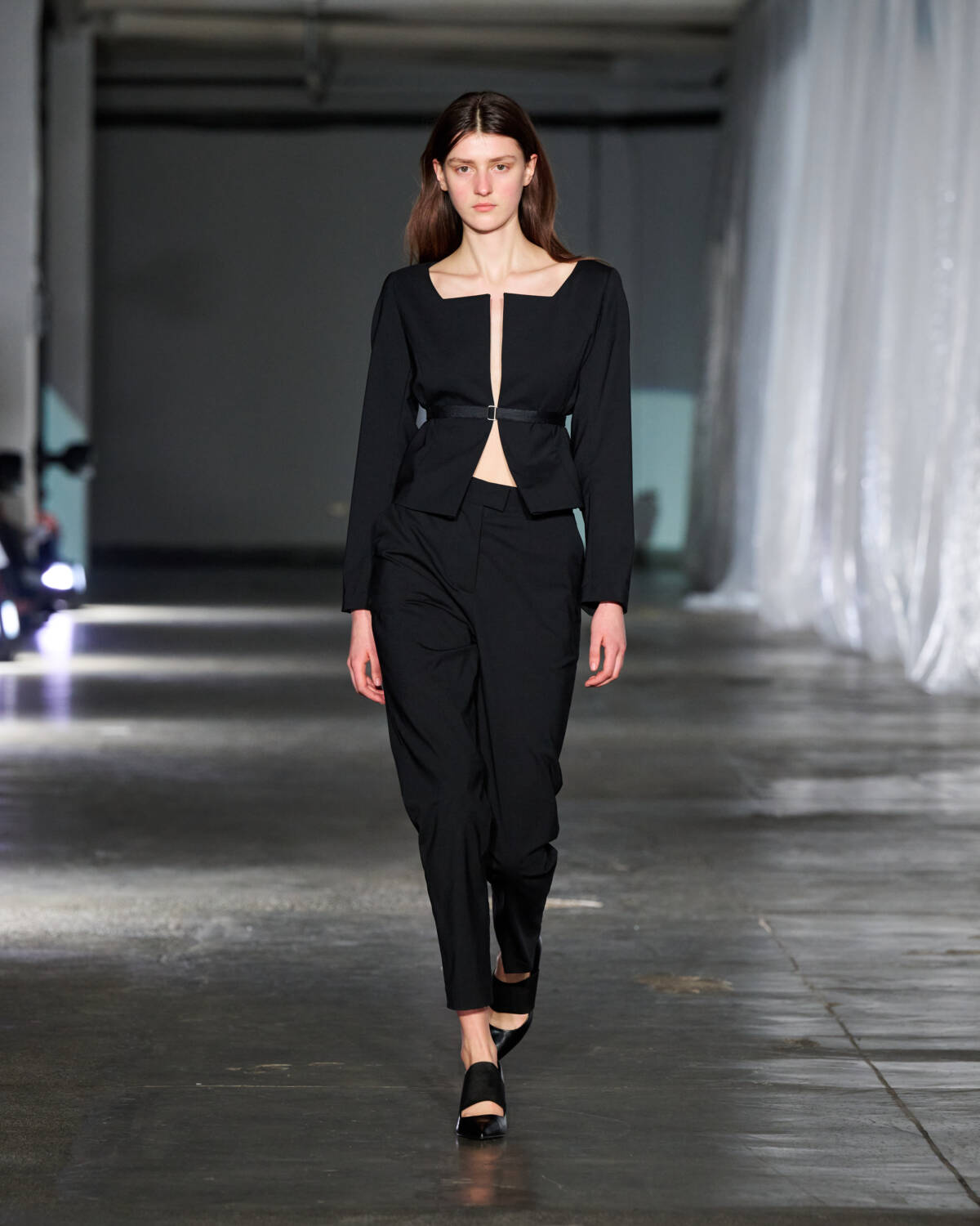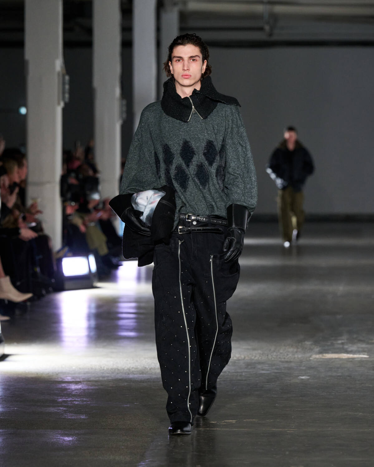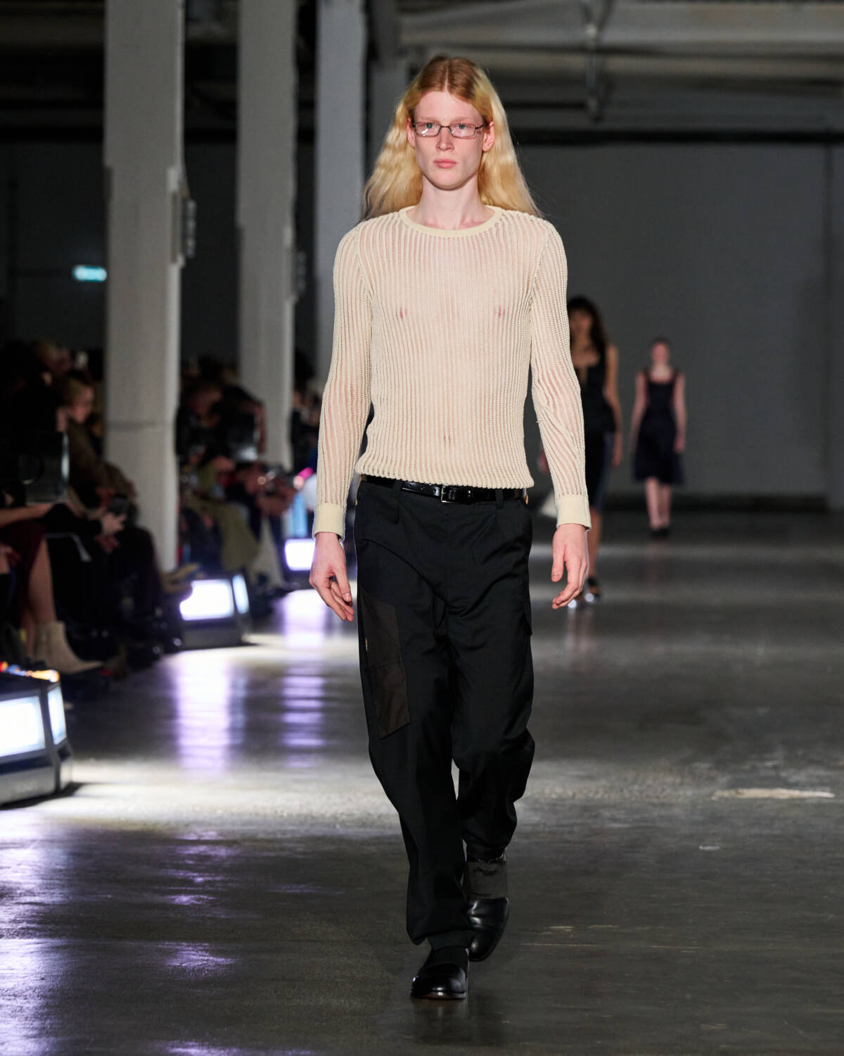 Also showing were designers Cameron Williams and Jebi Labembika of Nuba, who devote their label to the elegant wardrobes of their Caribbean and African mothers. They described their collection as being created in a dream-like state. Hooded, bias-cut tops danced across the natural contours of the body, while woollen overcoats migrated into scarfs that snaked around models’ necks. The pair’s approach to silhouette is forward-facing, both literally and in the metaphorical sense, with shrunken tailoring forcing models to walk with jutted shoulders. Ace stuff all round.