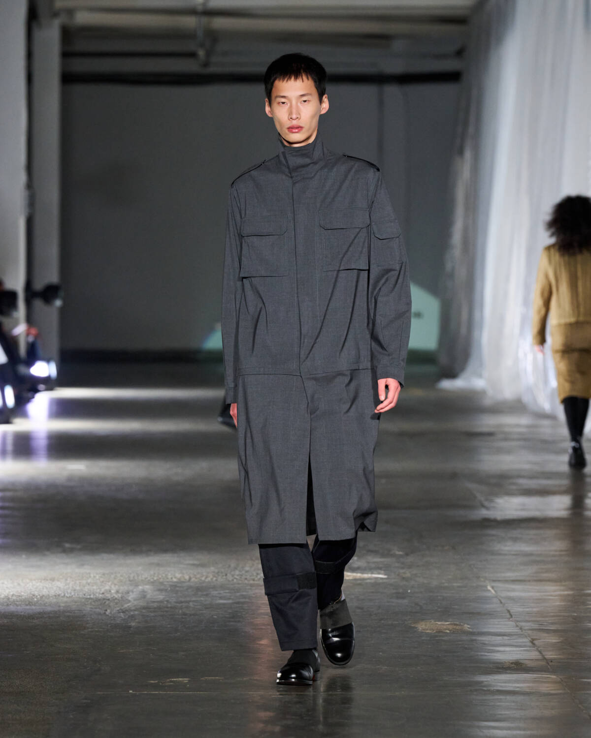 Taking his final turn on the Fashion East catwalk was Olly Shinder, who produced his most elevated outing to date. Having channelled sexed-up archetypes while queering hyper masc uniforms in seasons gone by, he shifted his utilitarian codes into more formal territory. There were hand-quilted silk organza skirt suits, military-style jackets extended into overcoats and calf-length shirt dresses. Add in wipe clean rain macs and roomy donkey jackets and you had a super shoppable wardrobe with subversive edge.