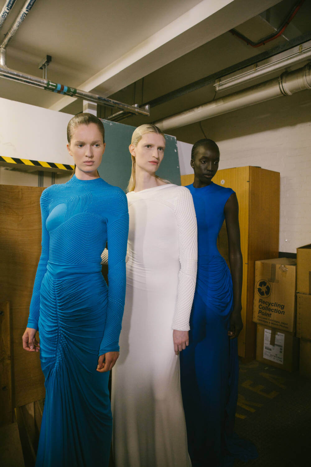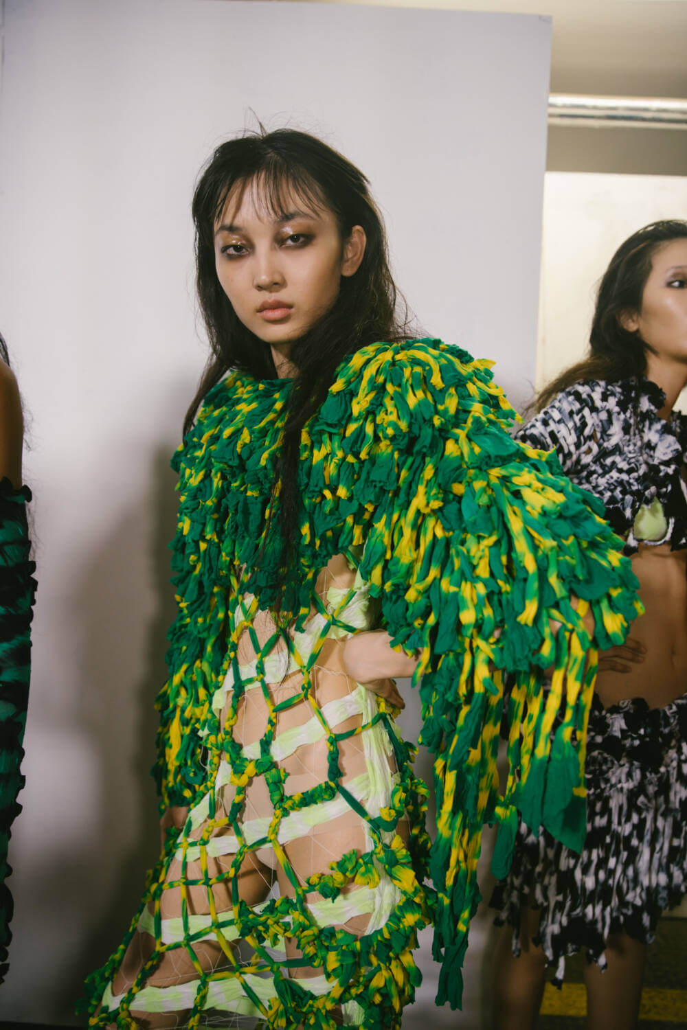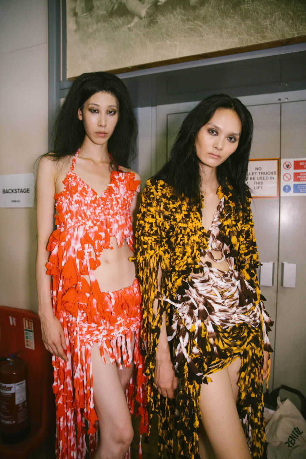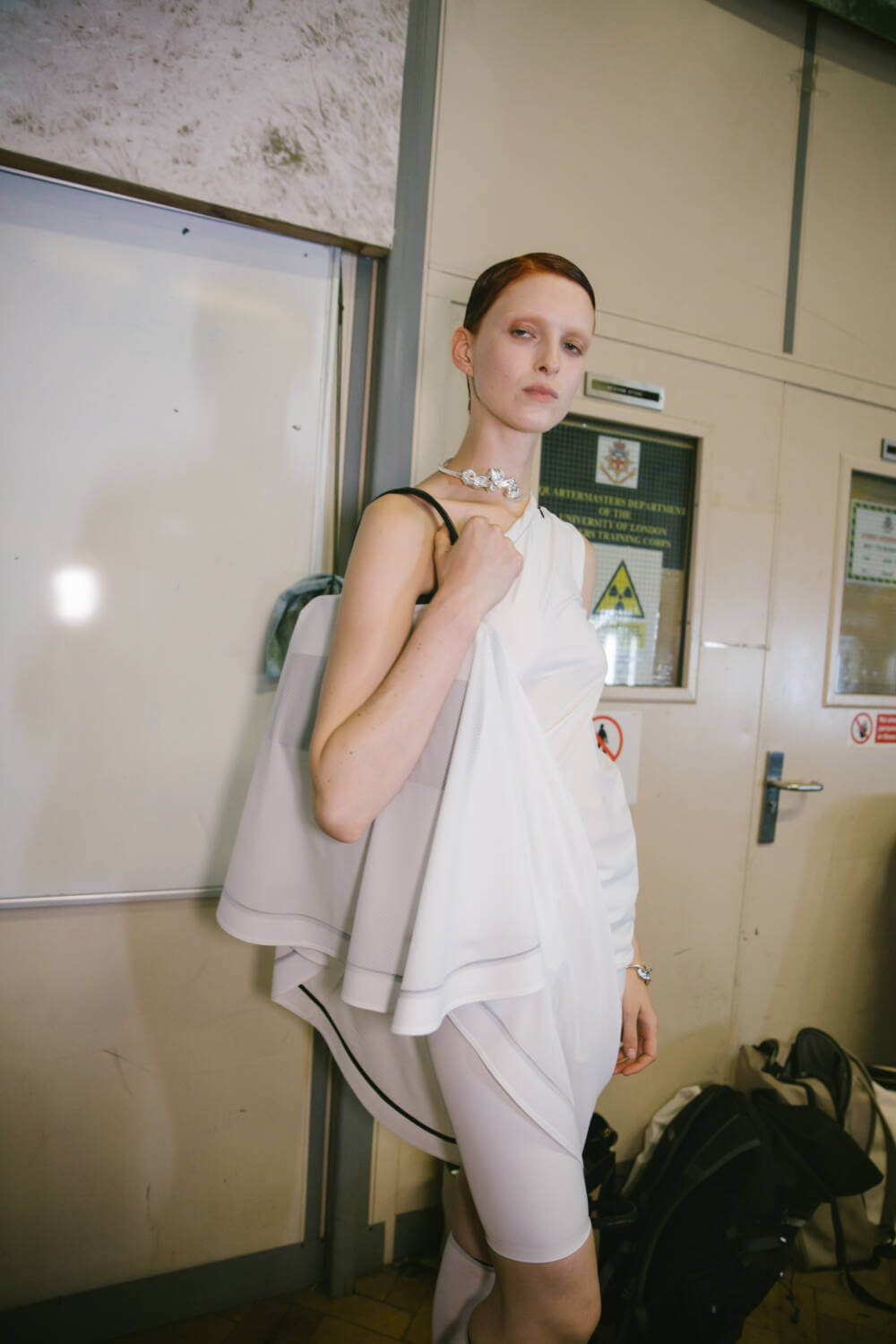 There’s an elegance to Johanna Parv‘s designs too. One that comes when form meets function and imagination – like the cycling shirt transformed into an elegant white zip jacket or the dress that transformed to it a top with an integrated handbag. Her pieces are elevated, and delight with clever design details. She cuts for an active, modern life and does it with great flair. As a bonus track, the Fashion East show ended with the return of Asai, a brand that embodies the flavour and energy of London fashion. His signature tie dye was slashed, shredded, knitted and woven into dance-til-dawn party dresses and too hot-to-handle beach looks which teetered on his high-heeled Timberland collab. Highly crafted, this ‘hot wok’ couture had all the flavour.