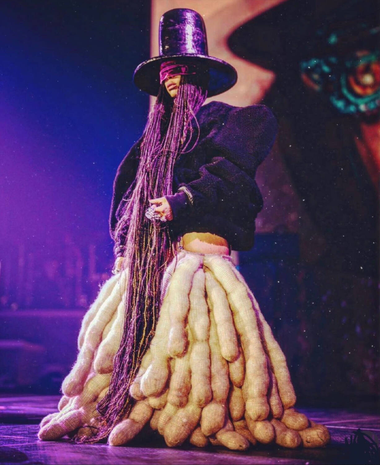 Creating garments for Erykah Badu is a starry-eyed dream for most young designers, but for Texas-born Myah Hasbany, it’s far from fantasy. “She actually went to my high school,” Hasbany says in our Zoom call, before going into the story of how they and the neo-soul legend met. “She wanted to audition dancers at my high school…So, me and my friend showed up in two of my massive, knit pieces.” Bumping into Badu in the corridors, they were invited to audition, shimmied their way through a “made-up dance routine”, got the dancing gig and have been in touch with the singer since, designing a number of her show looks over the years. A tale of serendipity but also unshakeable guts, the themes of Badu and Hasbany’s meet-cute echo the talent’s bold design language and creative ethos. Unperturbed by the expected norm, Hasbany also uses their creativity to convey necessary messages about body and gender dysmorphia and how to overcome them with confidence and acceptance.