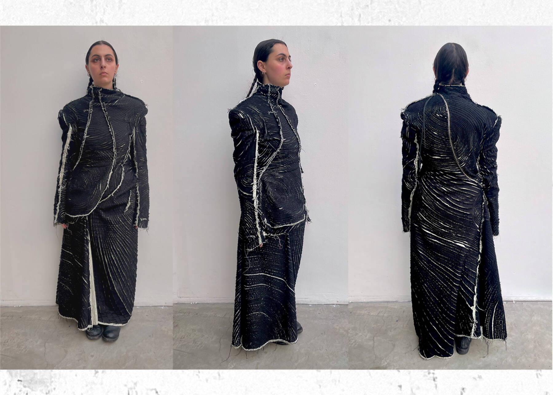 The drive to push boundaries is part of Hasbany’s practice from conception to execution, with textile development forming a core tenet of their work. “The techniques, fabric and stitches have existed for such a long time, but I think there’s still so much room for innovation within it,” they explain. “I think there’s so much to explore so I really want to keep doing that.” Alongside this progressive drive is a desire to bring fashion’s focus back onto craftsmanship. “[With the pieces] you can physically see someone has taken the time to make something amazing and [that they] work with their hands. I think we’re losing that a bit in fashion. I want to centre that again. [It’s better when] you buy something that you can see someone has taken their time with and [that they have] invested time into the thing you’re buying.”