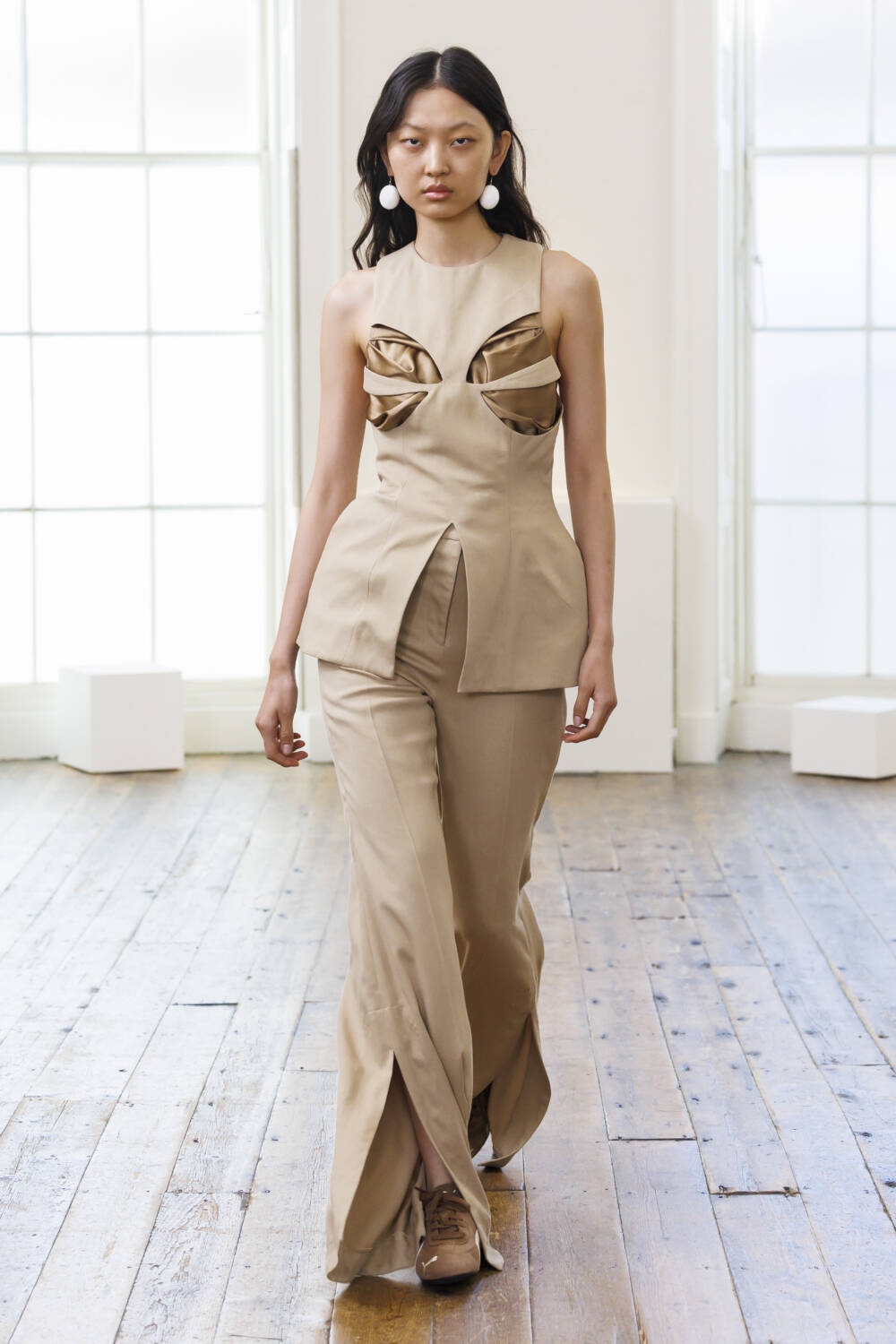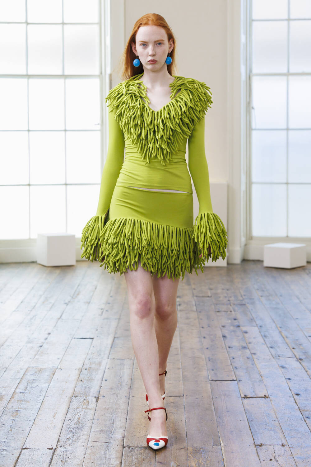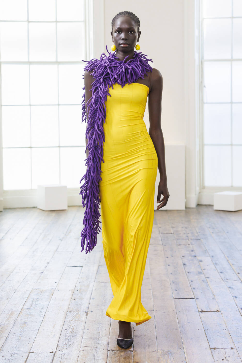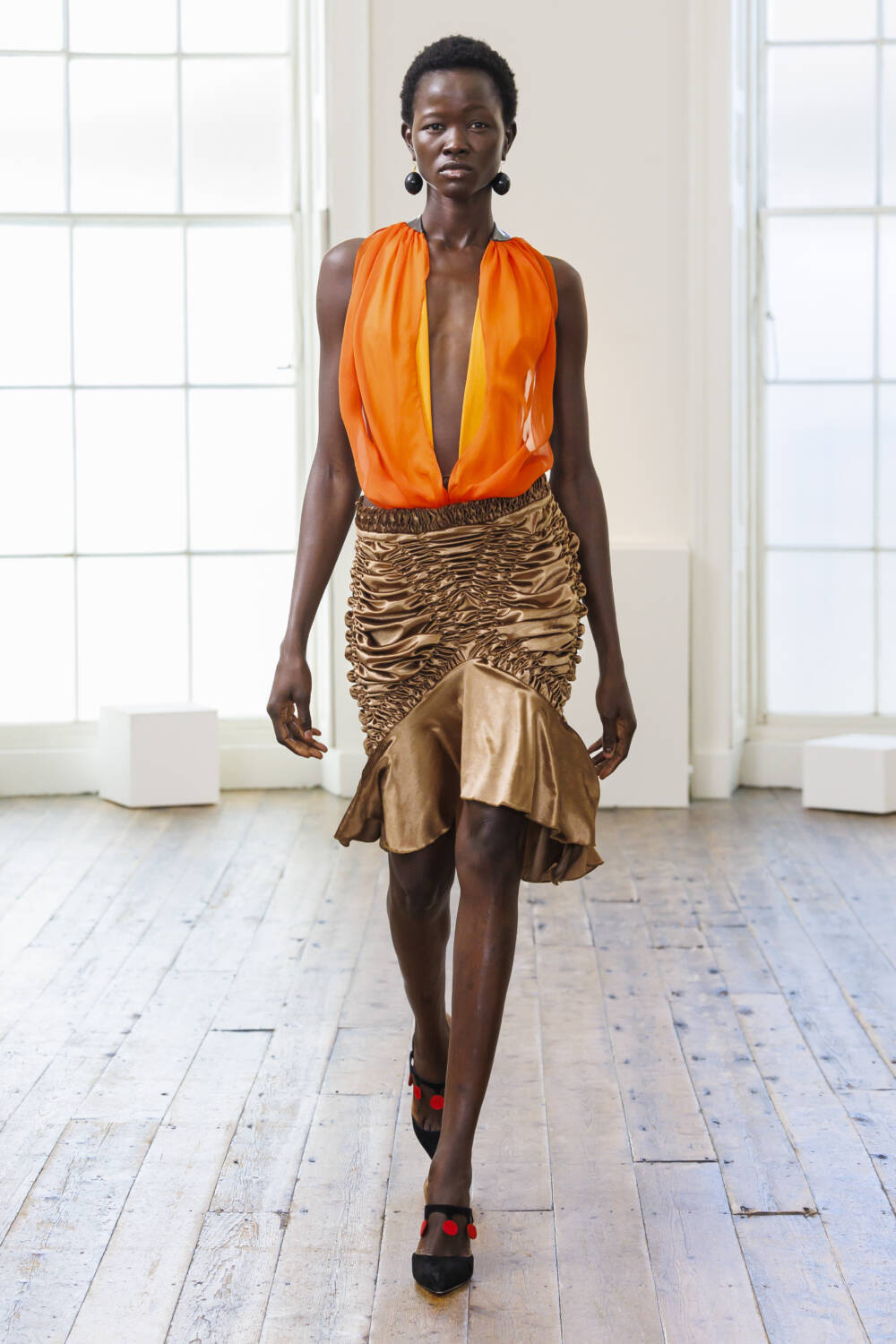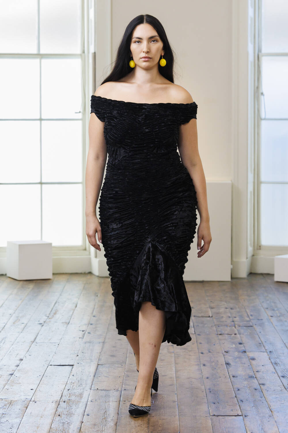 It’s hard not to get bummed out about a drizzly London summer. Thankfully Feben didn’t let July grey skies get the best of her. Instead of thinking about all the rain we’ve been burdened with recently, she decided to go about a play on words and call her collection Reign; built around the art of using “vulnerability to create strength”. Her muse for the season was Spanish flamenco dancer Antonia Singla, a master of the art form, who was also deaf her entire life. The designer proposed dresses with scooped necklines that flared out from the hips, while also using her signature ruching technique to create off-the-shoulder, body-hugging frocks that demand the attention of the dancefloor.
