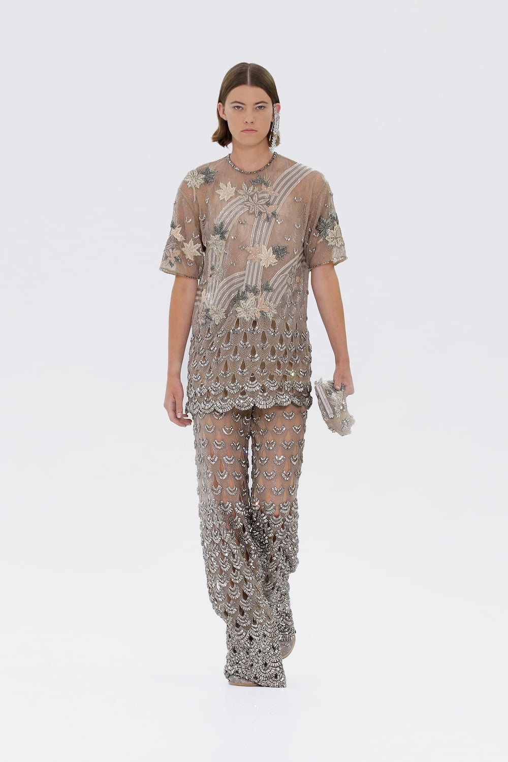 Kim Jones’ haute couture collection for Fendi began with a trip to Japan in March, before the borders had opened. “I managed to get in. I was so determined. I used to go six times a year. I love it so much,” he said during a preview. “We went to see a number of the suppliers we’ve always worked with on special projects, and I bought all these fragments of 17th-century kimonos. Just pieces of hand-painted silk fabric.” The antique pieces inspired him to contact a family of fabric-makers in Kyoto, who recreated and reinterpreted traditional Kata Yuzen motifs for the collection. Jones employed the patterns in long monastic column dresses that appeared like fragments pieced together, and in floral embroideries on transparent garments that included t-shirts, the haute couture way. “It’s pretty light. I wanted lightness in the clothes this season, also in terms of how the embroideries were done,” he explained. The show opened with a pair of tailoring looks constructed in the finest vicuna, a tactility Jones went on to evoke in long knitted dresses. “I wanted to have some light knitwear pieces for, you know, that jet-set lifestyle of the client. They can wear that on the plane and get off and still fabulous.” As the show progressed, his silhouettes became lighter and lighter until the dresses became almost embroidered overlays floating on the skin. “I love the colours,” Jones said of his earthy tones and muted pastels. “I’m really happy with it.”