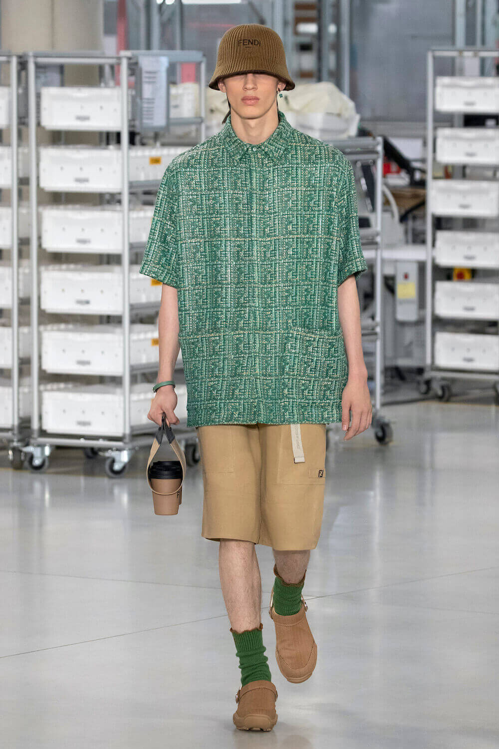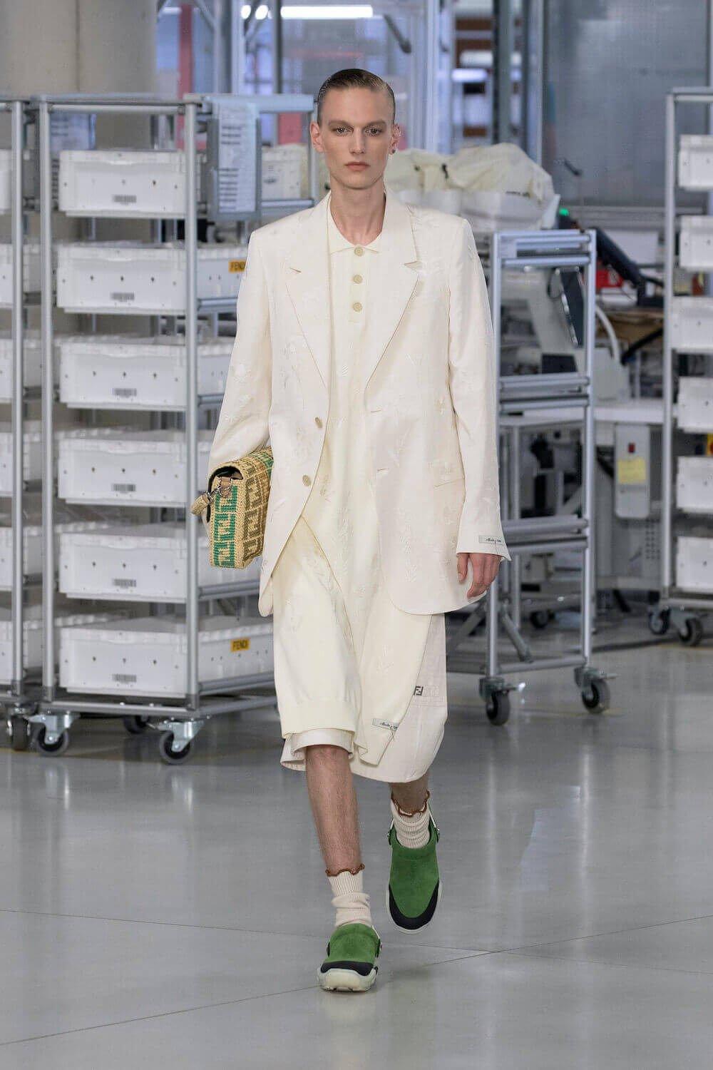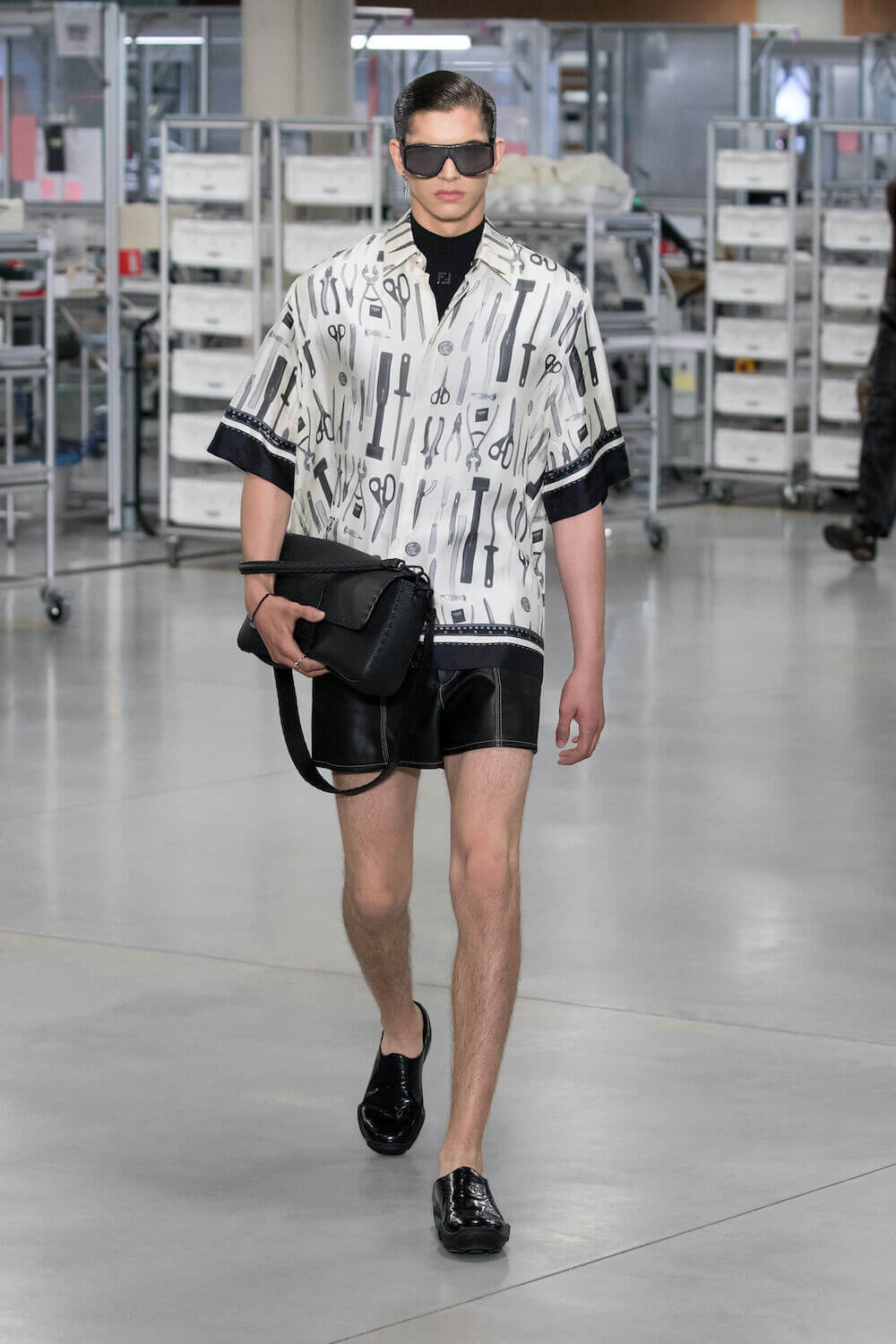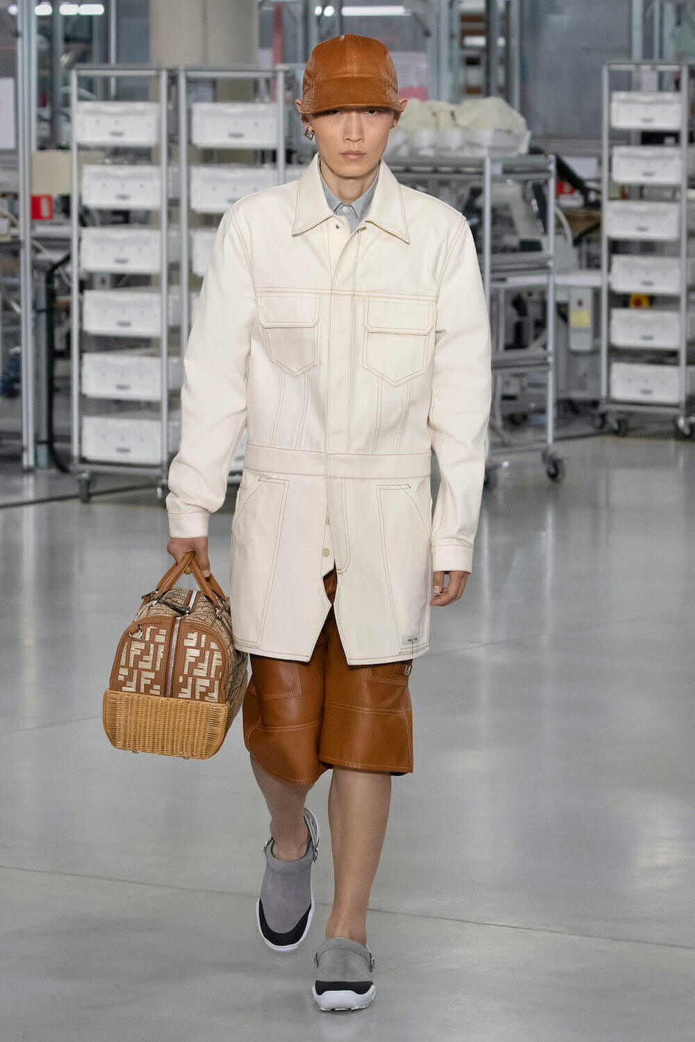 Models carried lavish briefcases, lunch box-inspired bags and Fendi-branded coffee cup holders as they wore on-the-money tailoring, top-stitched shorts and jackets, and silk shirts laden in a tool-kit print. One elongated shirt mimicked a toile; ivory in colour with pseudo penciled markings, whilst a recurring shoe silhouette (part clog, part sneaker, with a swivel heel strap and molded sole) was fit for a day’s graft.