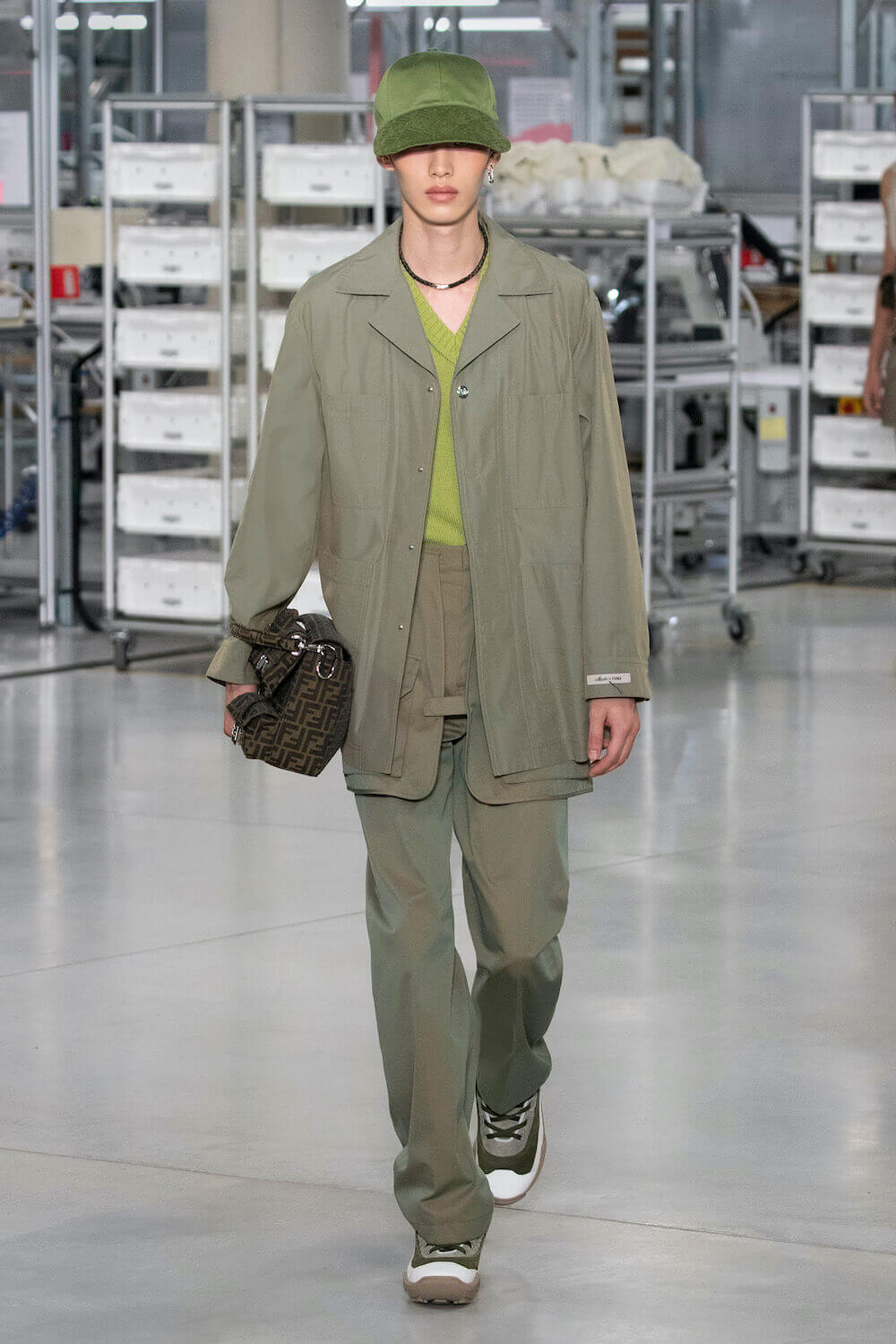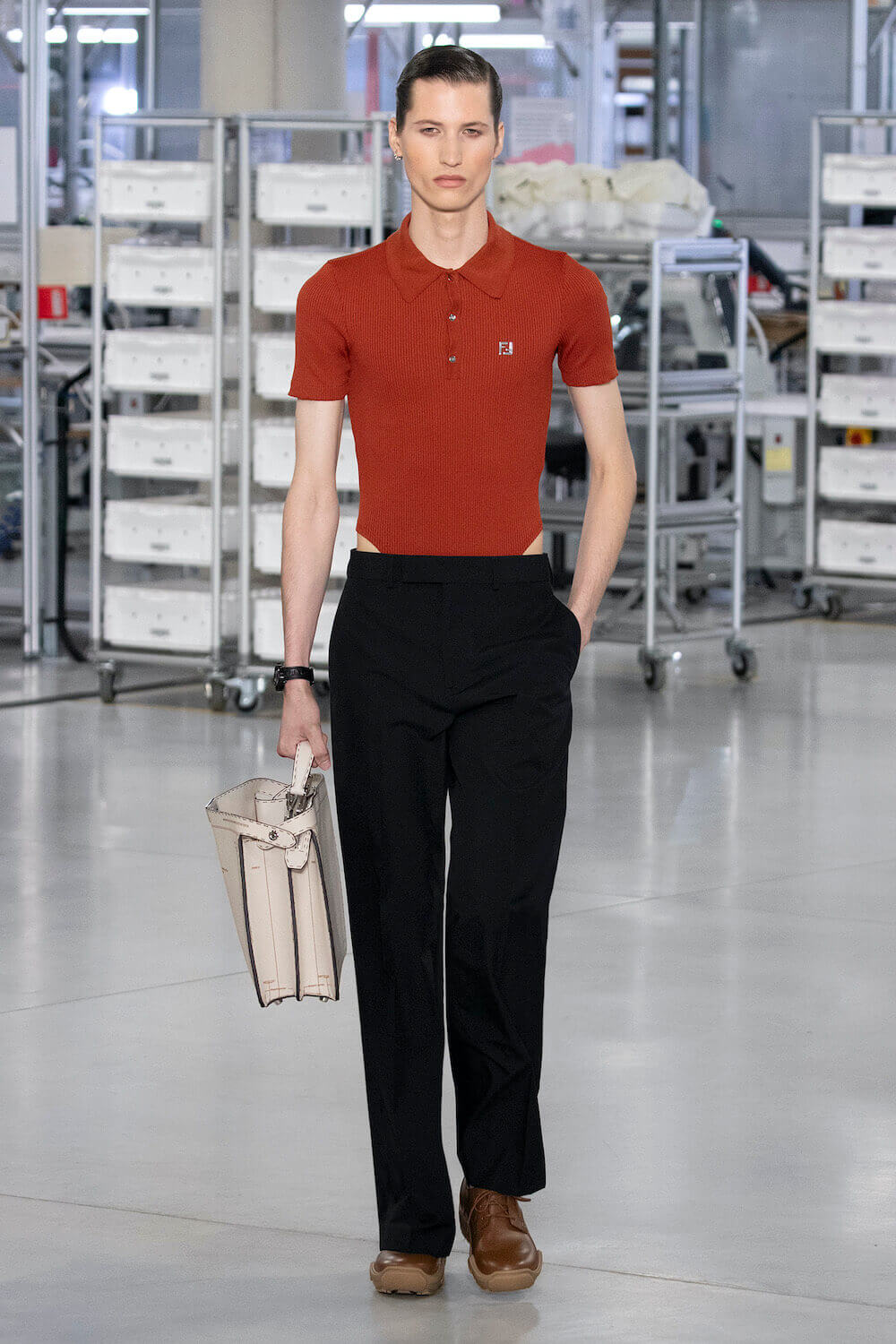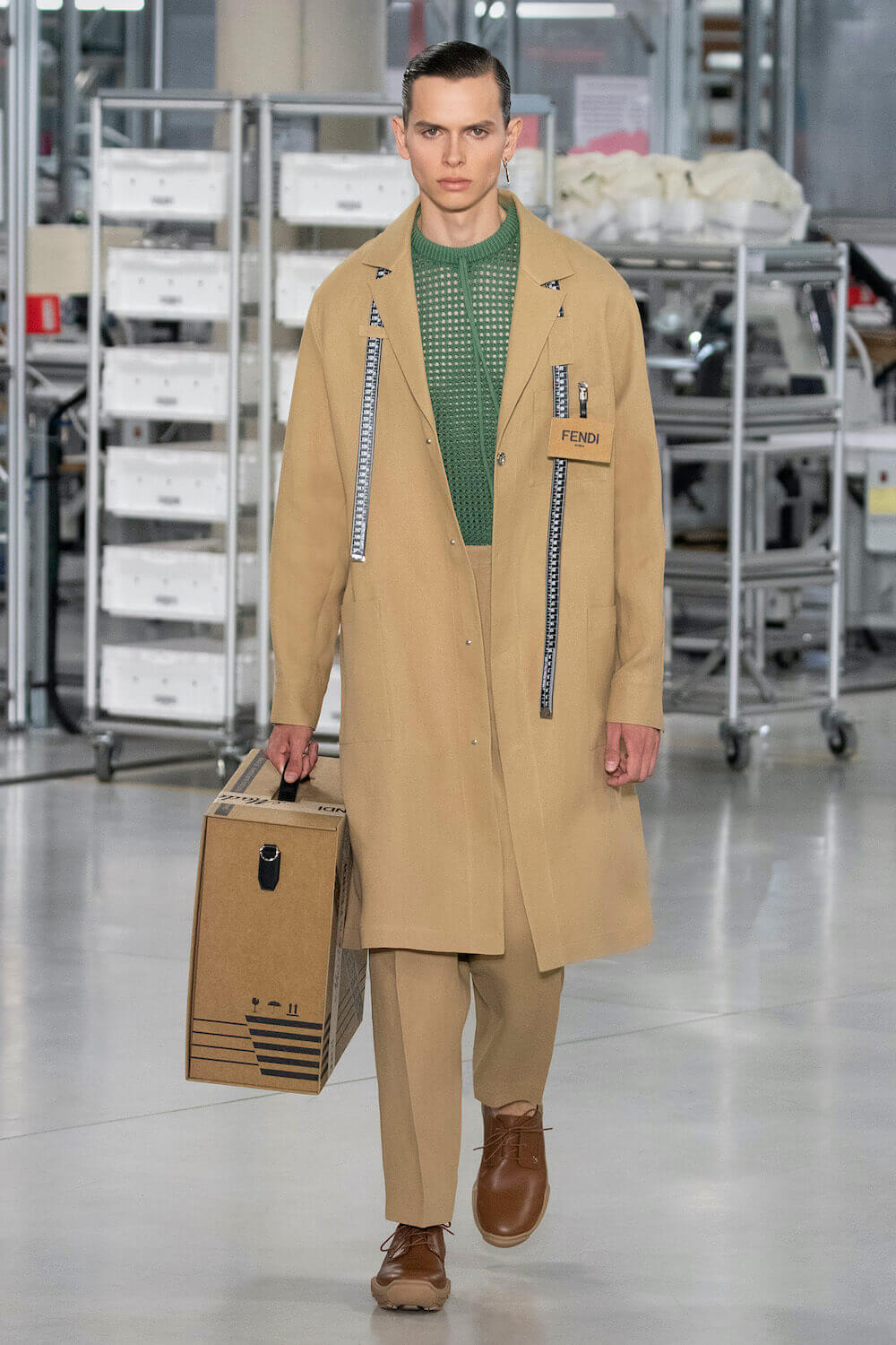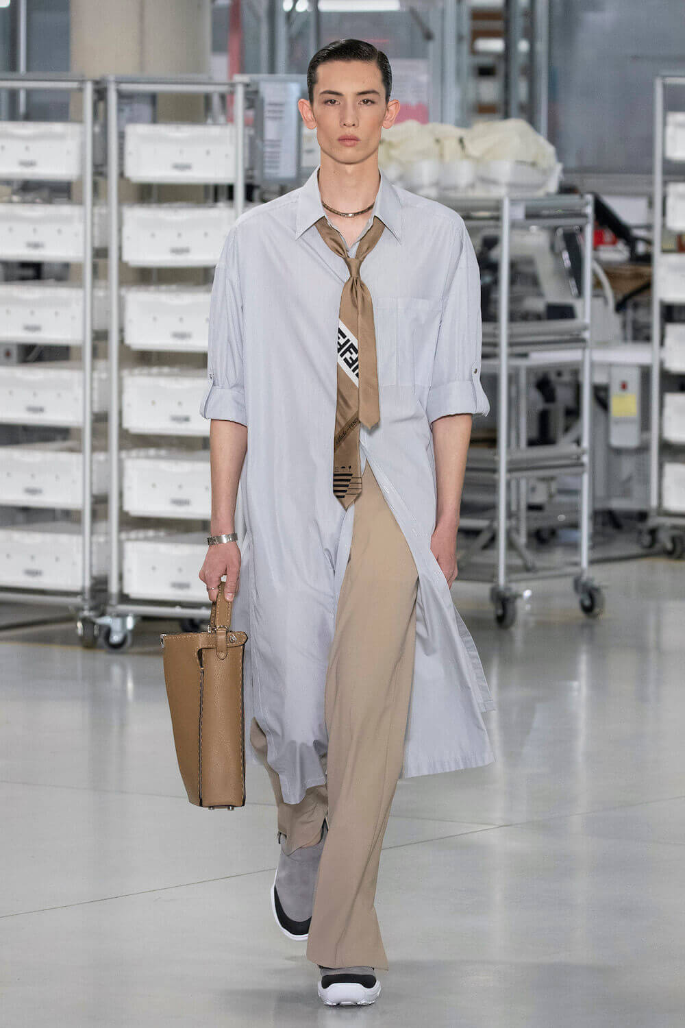 Models carried lavish briefcases, lunch box-inspired bags and Fendi-branded coffee cup holders as they wore on-the-money tailoring, top-stitched shorts and jackets, and silk shirts laden in a tool-kit print. One elongated shirt mimicked a toile; ivory in colour with pseudo penciled markings, whilst a recurring shoe silhouette (part clog, part sneaker, with a swivel heel strap and molded sole) was fit for a day’s graft.