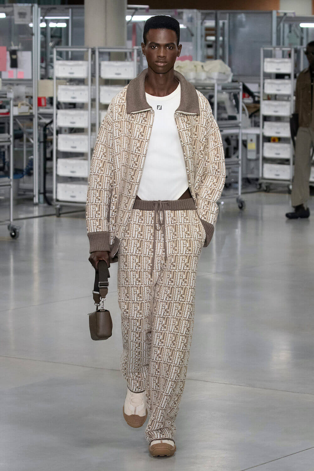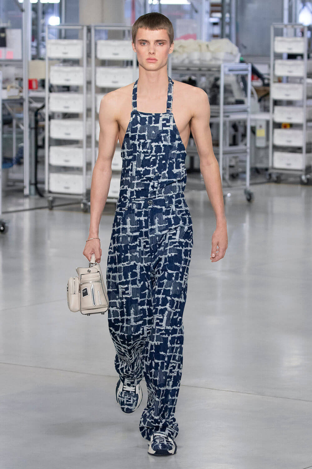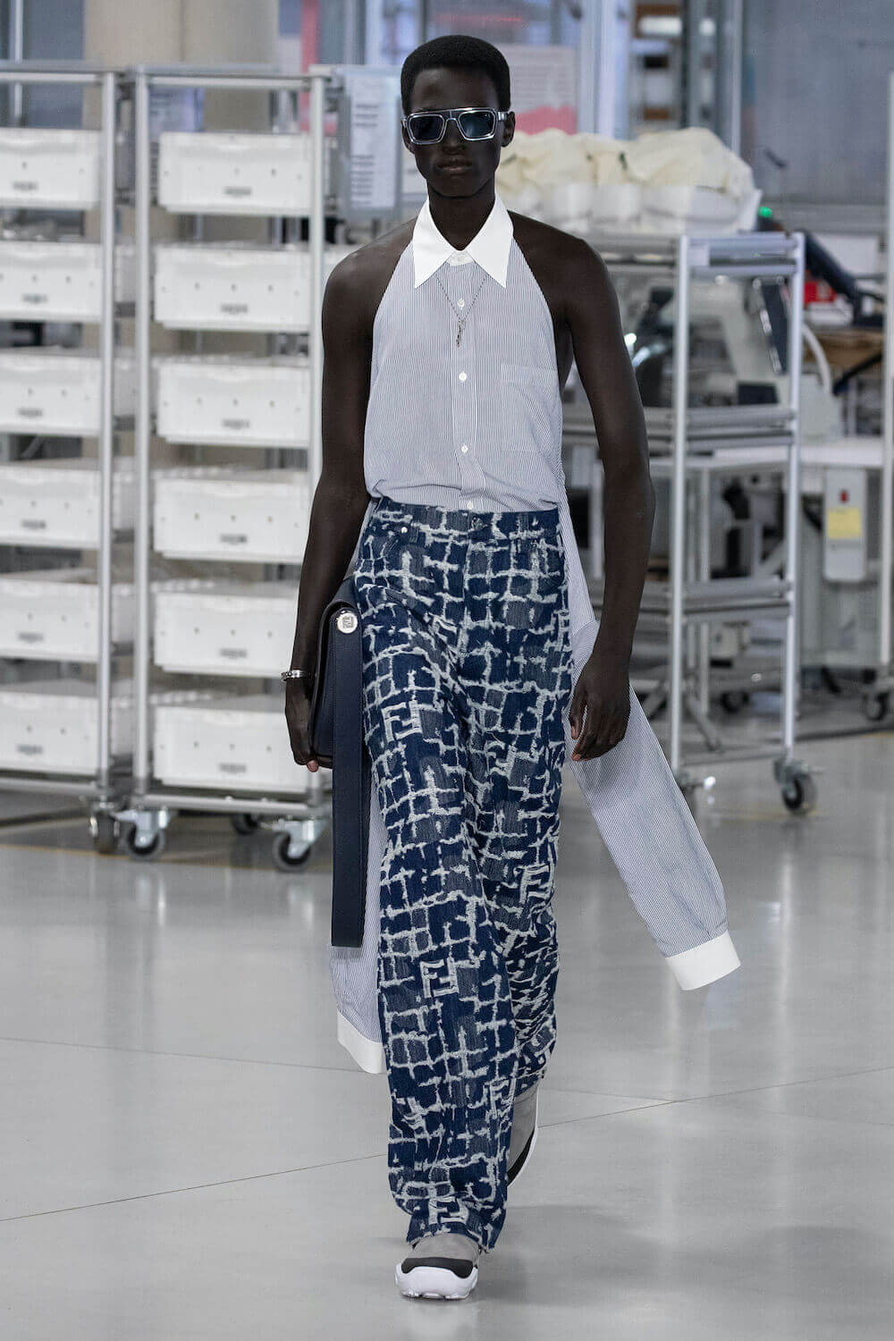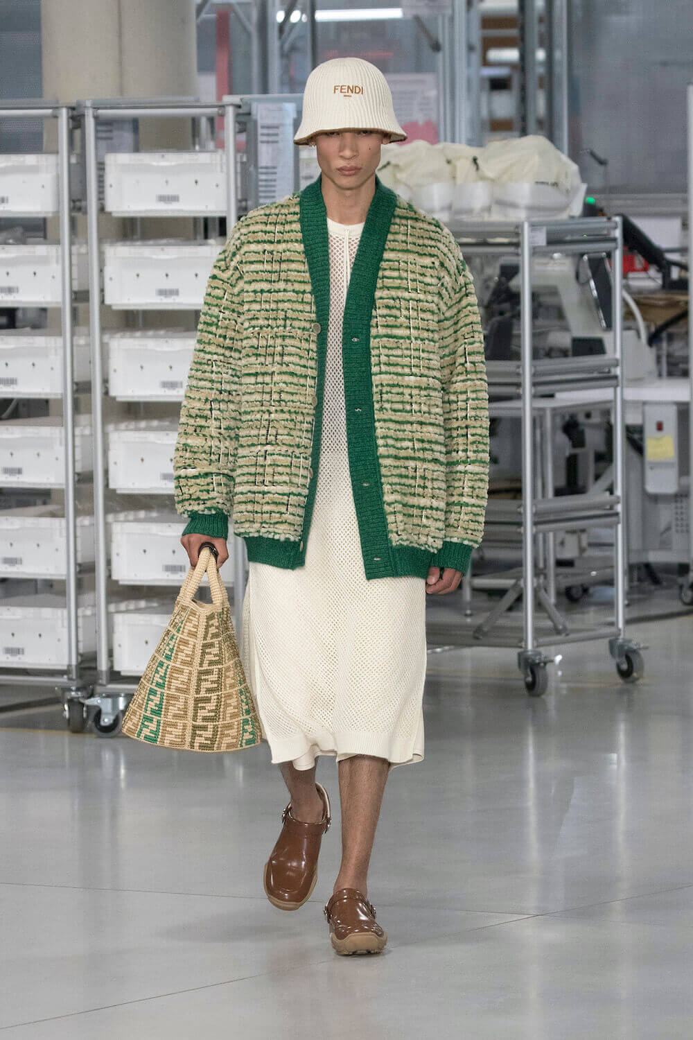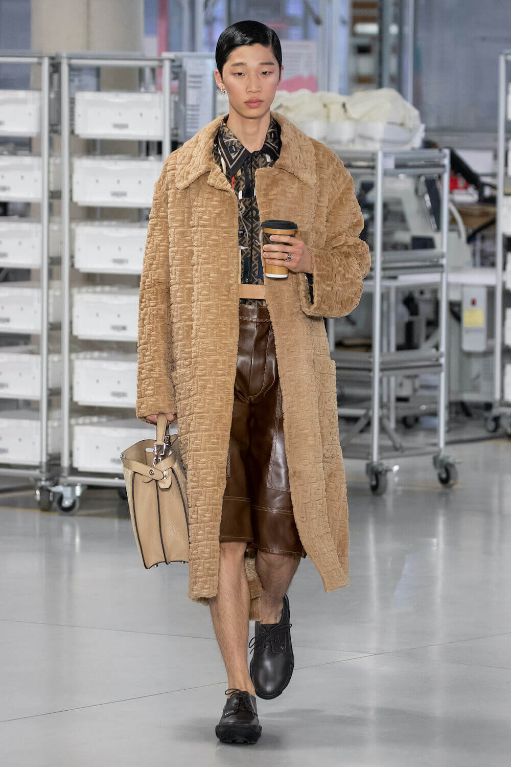 Models carried lavish briefcases, lunch box-inspired bags and Fendi-branded coffee cup holders as they wore on-the-money tailoring, top-stitched shorts and jackets, and silk shirts laden in a tool-kit print. One elongated shirt mimicked a toile; ivory in colour with pseudo penciled markings, whilst a recurring shoe silhouette (part clog, part sneaker, with a swivel heel strap and molded sole) was fit for a day’s graft.