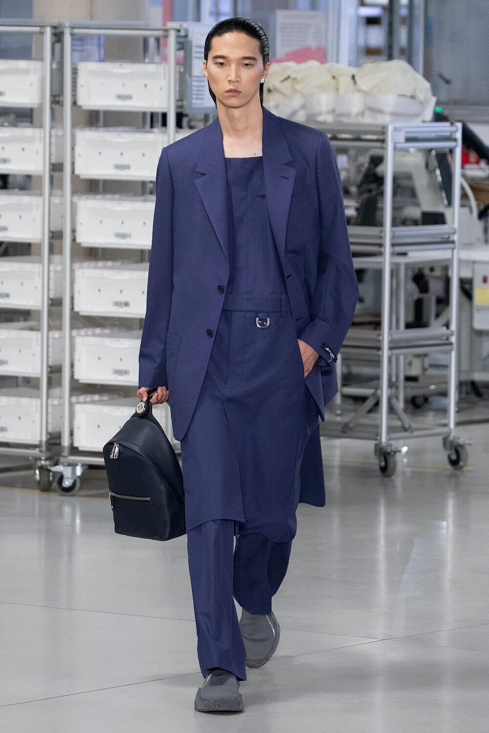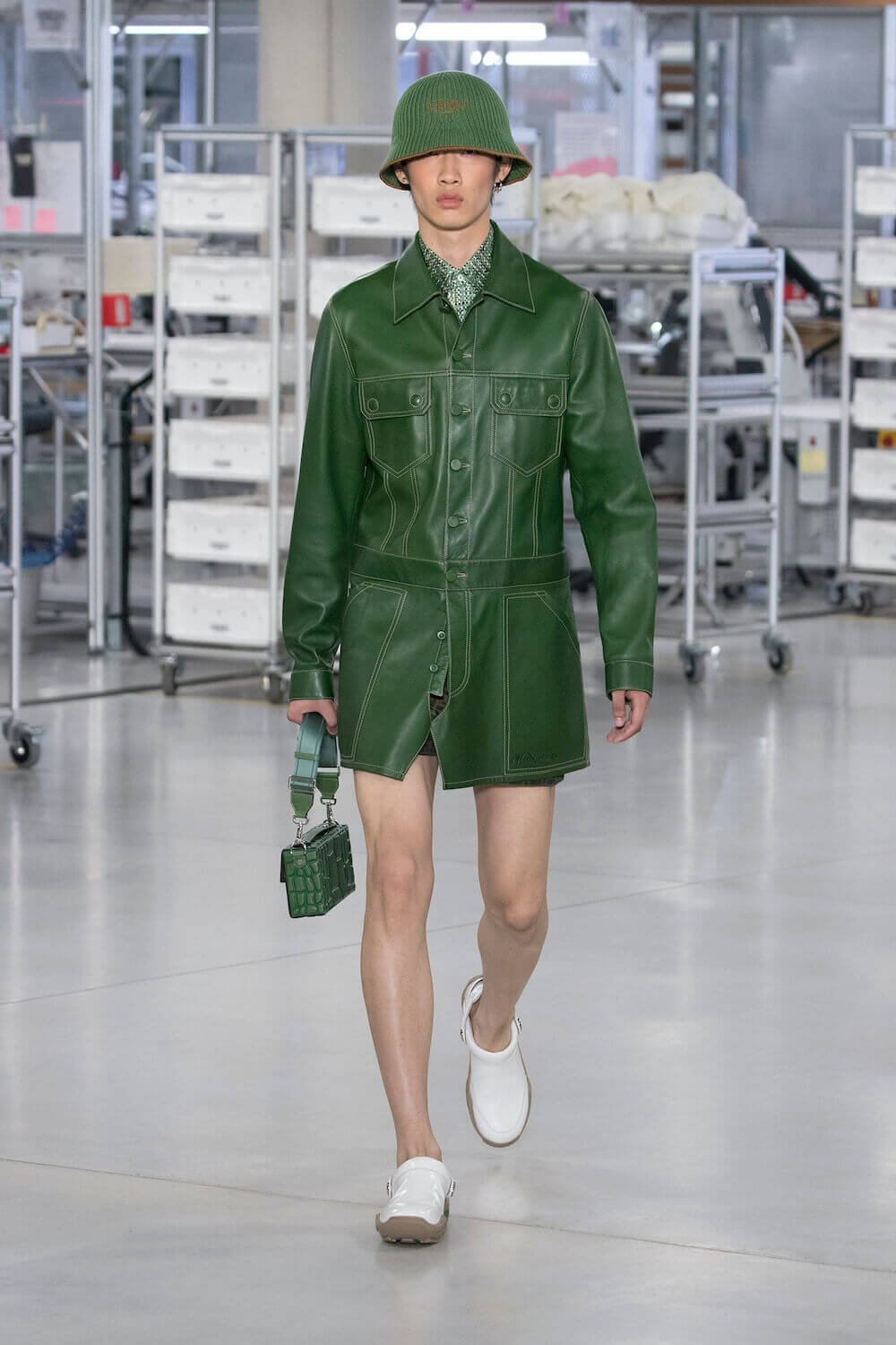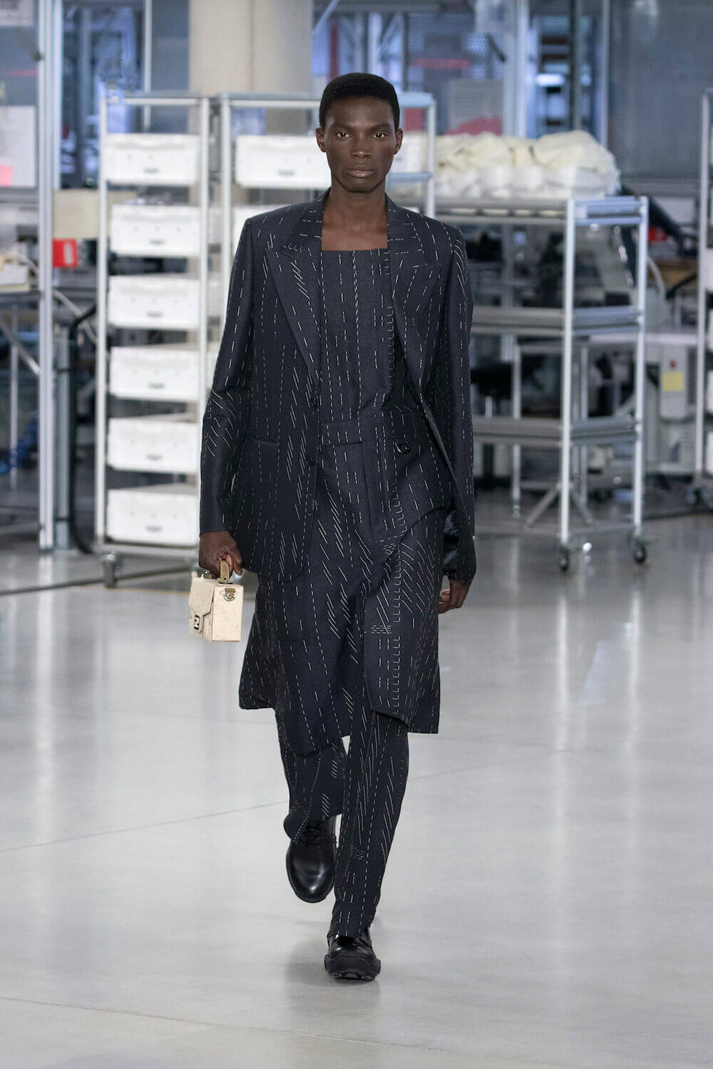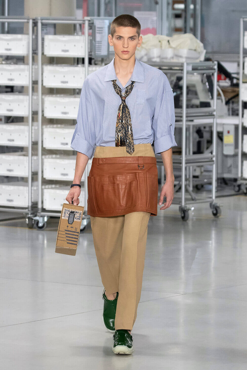 Models carried lavish briefcases, lunch box-inspired bags and Fendi-branded coffee cup holders as they wore on-the-money tailoring, top-stitched shorts and jackets, and silk shirts laden in a tool-kit print. One elongated shirt mimicked a toile; ivory in colour with pseudo penciled markings, whilst a recurring shoe silhouette (part clog, part sneaker, with a swivel heel strap and molded sole) was fit for a day’s graft.