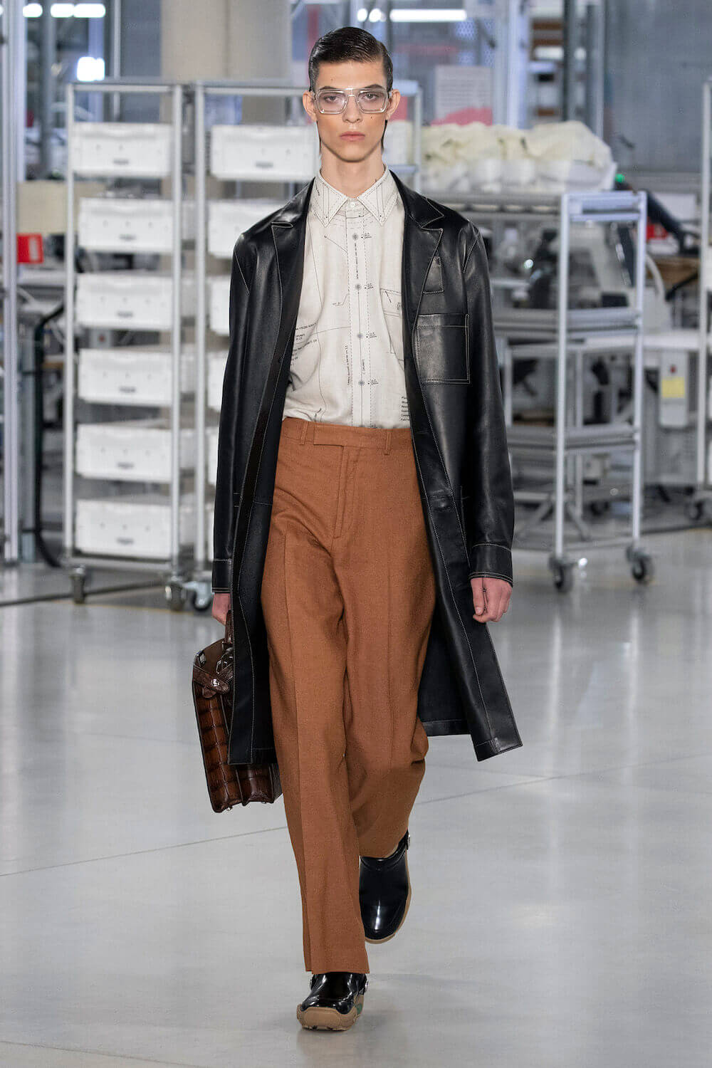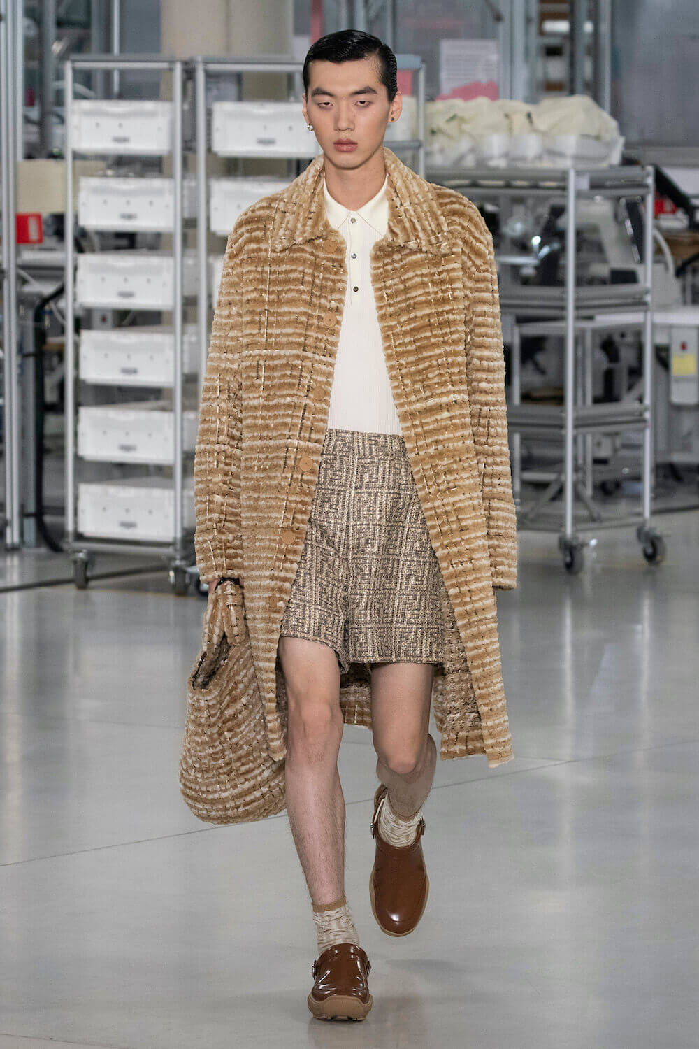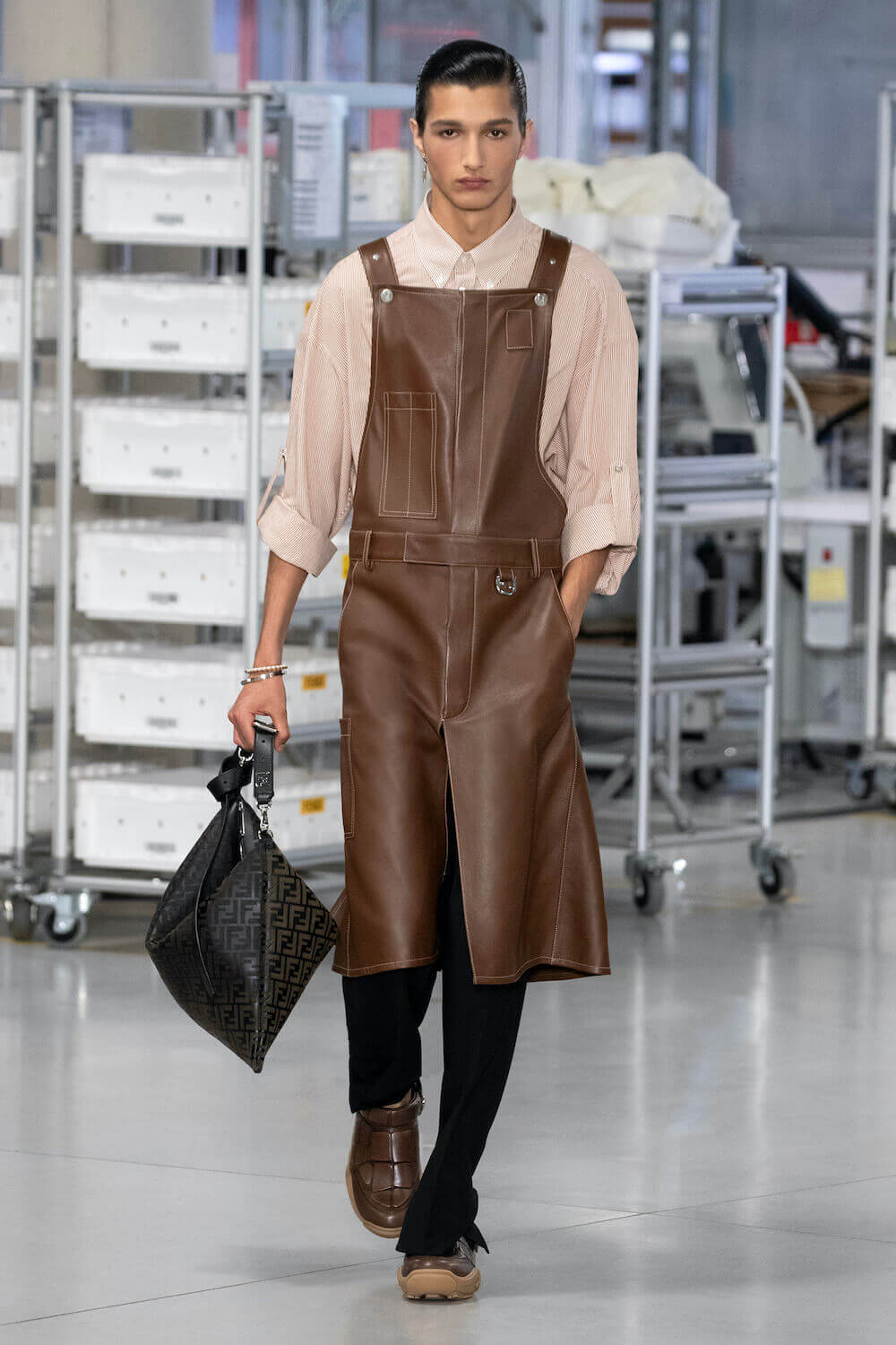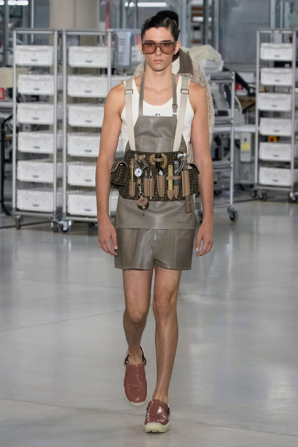 Fendi’s staffers laser-etched leather and hammered away at what would soon become the next batch of Peekaboos and Baguettes, as Venturini Fendi celebrated the craft-first approach of her family’s business with elevated, utilitarian-inspired togs (her grandmother, Adele Fendi, trained in leather craftsmanship in Florence nearly 100 years ago). The designer smartened up traditional elements of a working man’s wardrobe: kitted out utility belts became leather mini-skirts worn over short-shorts and slacks, and nicely done office shirts and car coats came with incisions designed to house a measuring tape. Nifty, no?