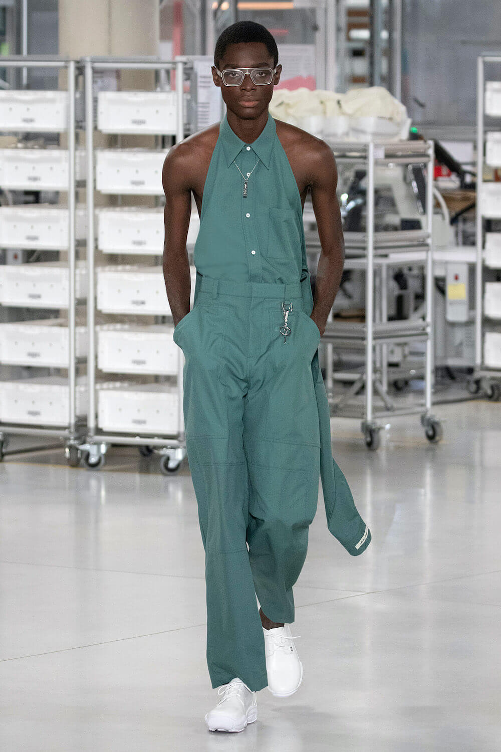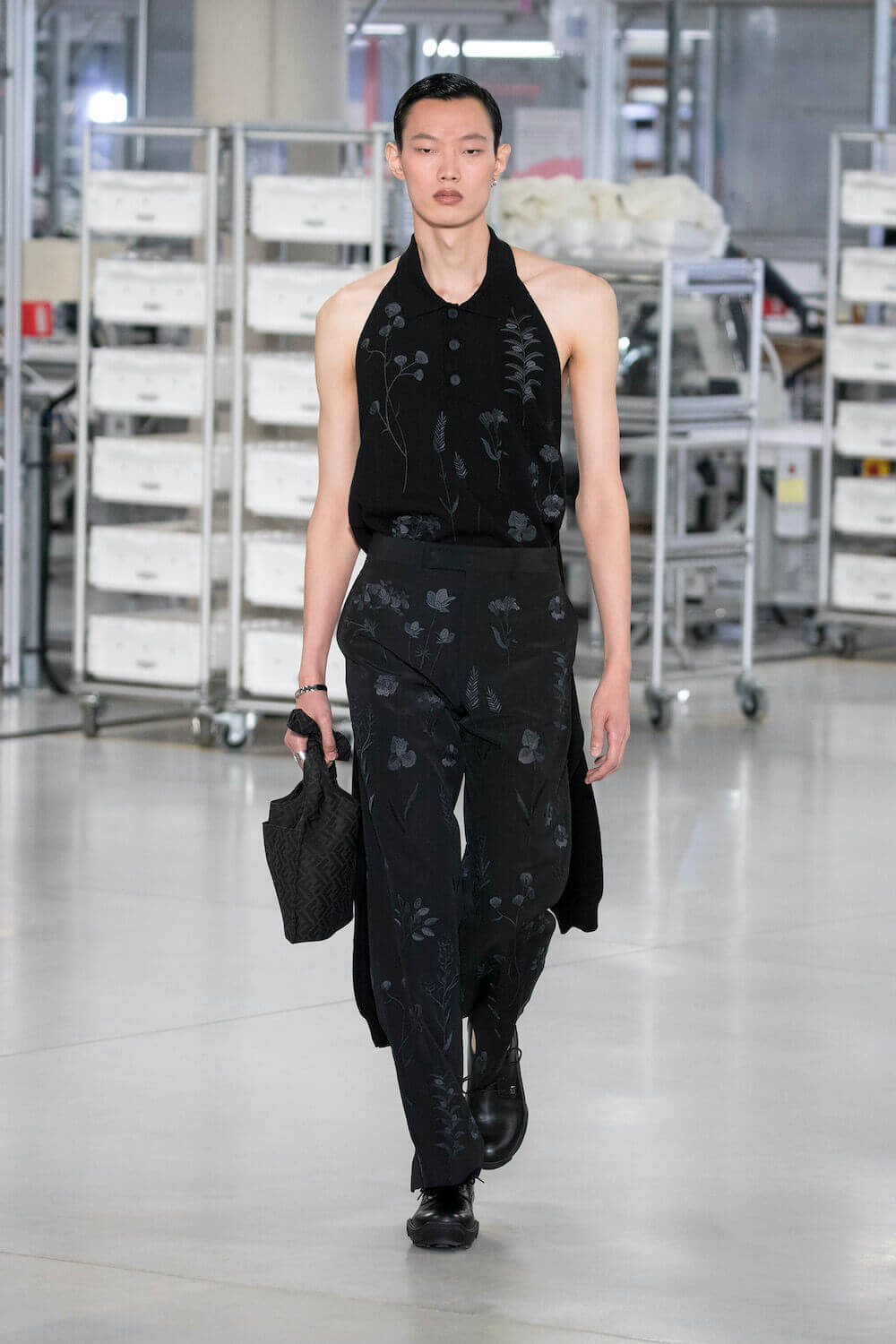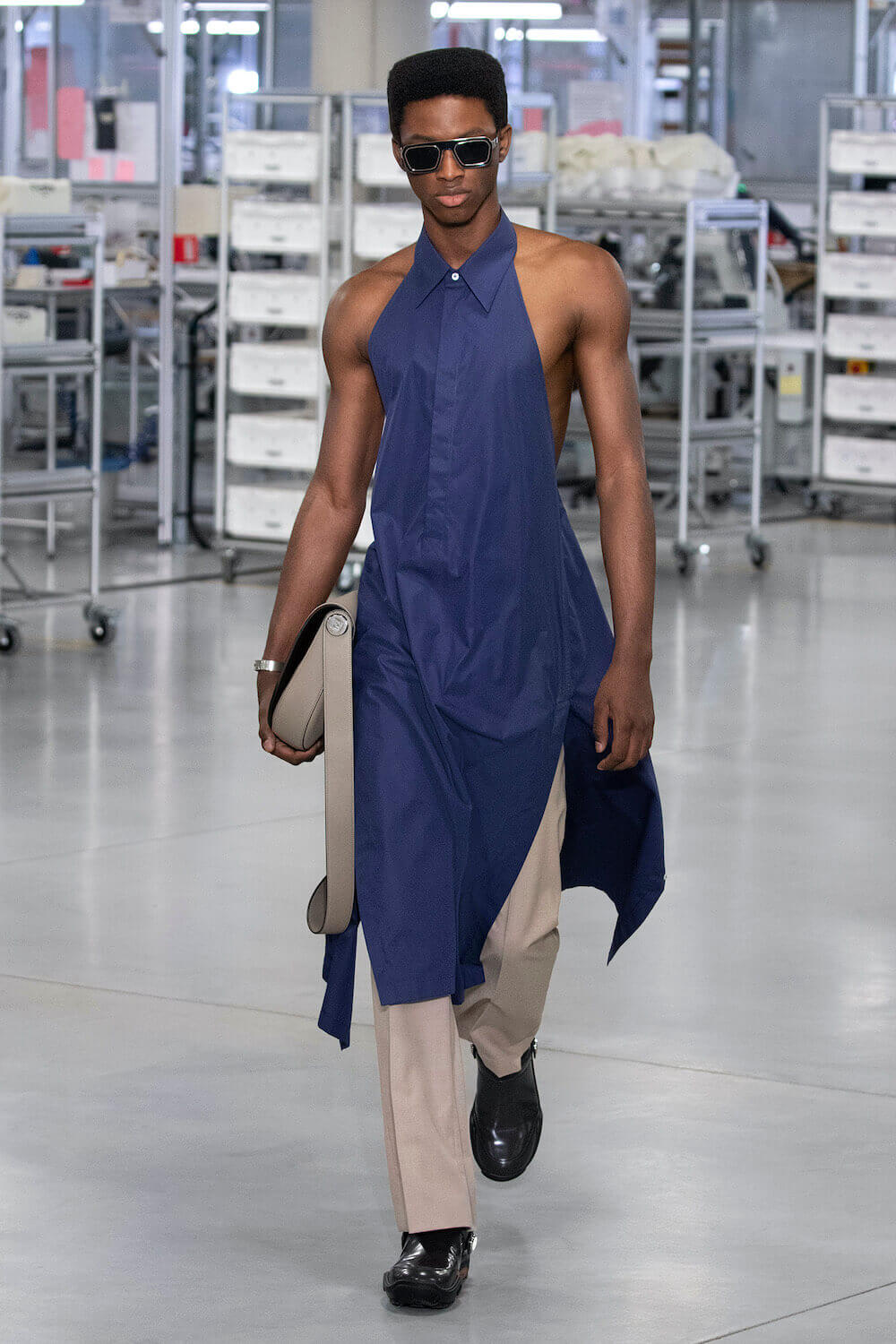 Throughout, Venturini Fendi provided a sensual spin on men’s classics. Ribbed knitted polos clung to the body with sensual cut outs at the waist; crocheted vests came fashioned from nettle fibre wool; and halterneck shirting, both sleeveless and backless, migrated into apron-style dresses.