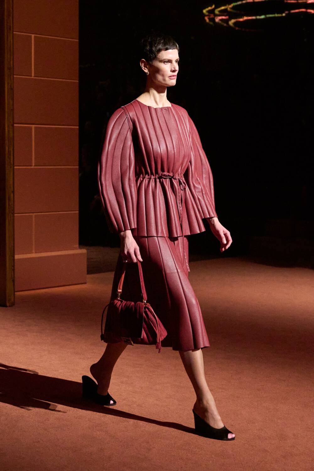 Their exceptional skills were also on display in the leathers the house specialises in. Eel skin and leather macs and car coats looked sumptuous. Suede oversized shirts were supple and velvet soft. Adding to the softness, were knits with a fit and flare femininity, and tweedy tailoring, sprinkled with crystal embellishments. Almost every model carried a bag, some carried clusters of the house’s famed baguettes.