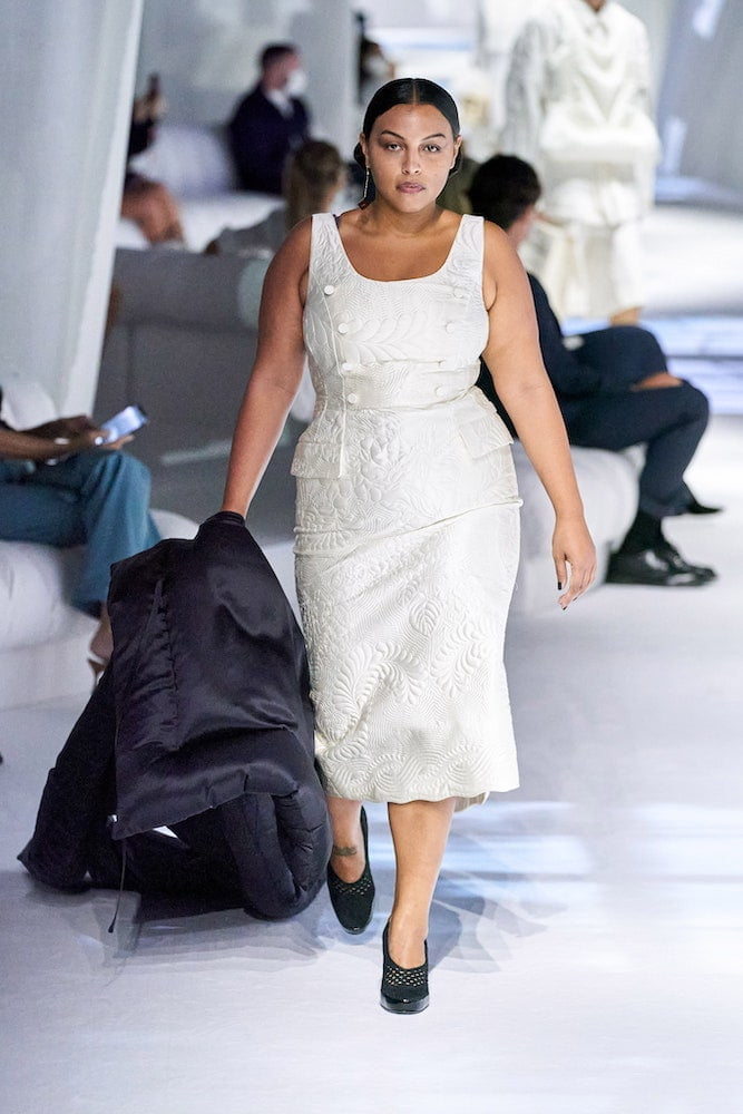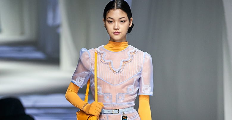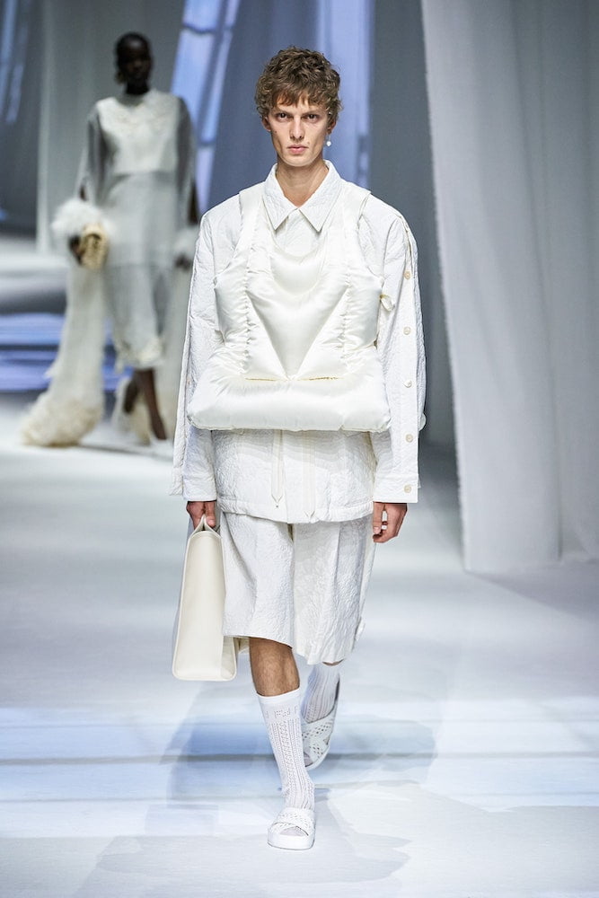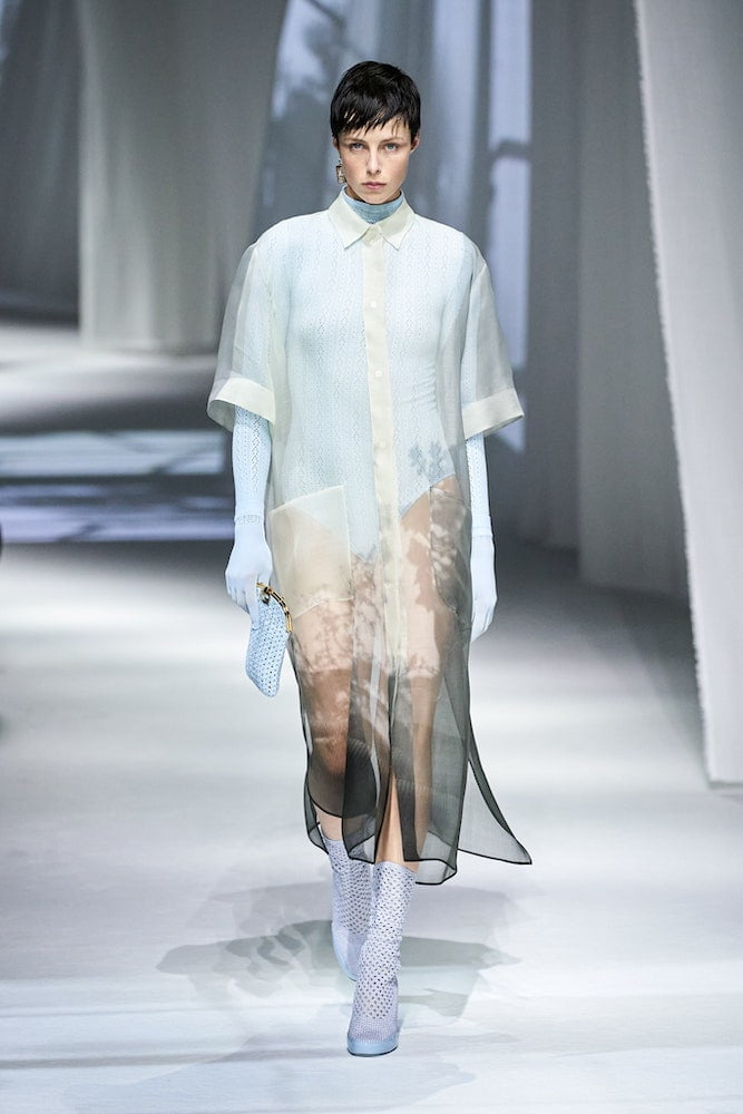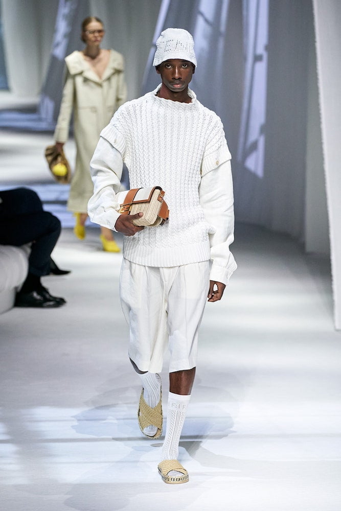 “Fendi workmanship applied under surreal circumstances,” said the designer of her strong desire to celebrate Italy’s hand-made heritage after Covid. As well as challenging Fendi’s in-house ateliers with lattice-work furs and jour d’echelle ladder-work, she reached out to the country’s craft community for the Hand in Hand Baguette project, which sees Fendi collaborate with local artisans across Italy. Close-up shots on the live catwalk feed, showed just how stunning the results are. Handcrafted in Abruzzo, a sheer Baguette was constructed in tombolo aquilano sugar-coated lace, a technique refined by Benedictine nuns since the 15th century. From the Marche region, came a structured Baguette woven in strands of natural willow, inspired by the baskets of local fishermen. Both are collector’s items and instant heirlooms.