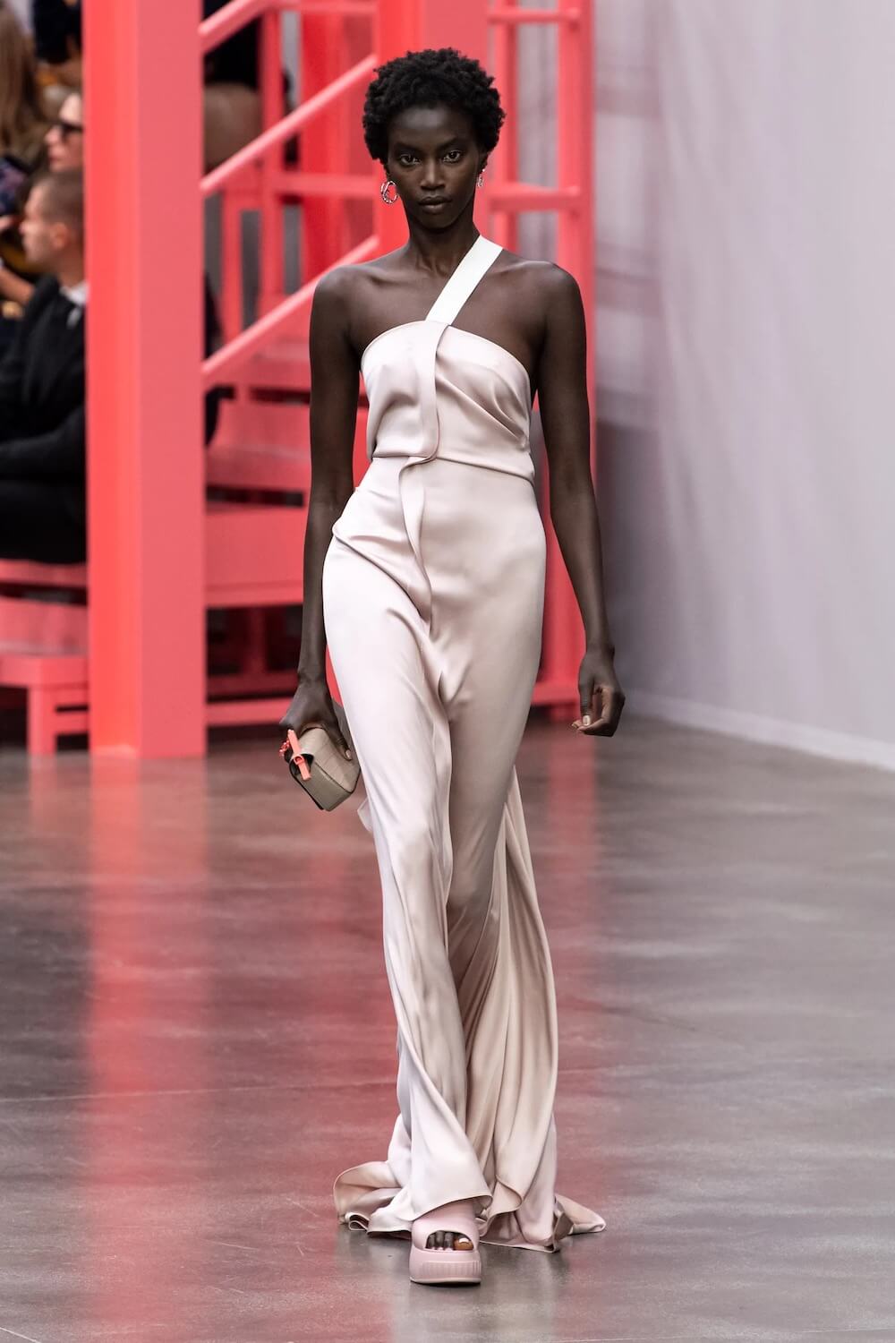 But those slouchy satin pieces in ice cream shades, were only part of the story. Jones focused too, on tailoring. Leaning into his precision menswear, he showed exquisitely cut coats and jackets, with integral satin obi belts. It was an idea carried over from couture. Speaking of which, a couture garment is as beautifully crafted on the inside as the out, and in another nod to Fendi’s haute heritage, Jones fashioned ‘inside out’, skirts with that covetable Fendi label on show.