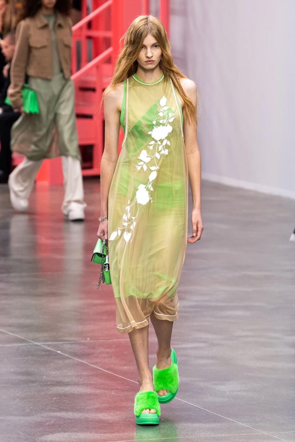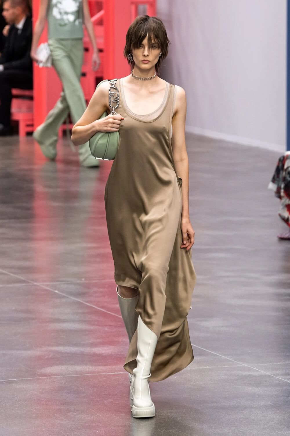 After this show, who doesn’t want a pair of slouchy satin cargo pants worn with a fluttering racer back vest and rubber-soled Fendi wedges? Past, present and future coexist for Jones, who looked at Karl Lagerfeld’s Fendi collections from 1996-2002 and found himself fascinated by the era’s blend of minimalist ease and pop cultural pizazz. It’s about continuity,” said Jones of his archive excursions, “I am interested in looking at things that Karl has done, and seeing how we can develop them – both visually and technically.” A double F logo from 2000 was ripe for reanimation as was a floral print that shot through the collection.