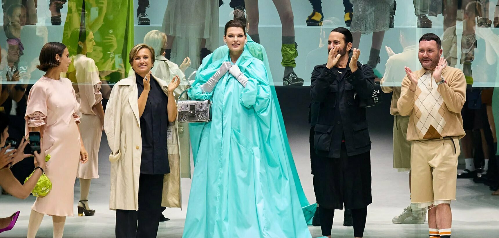 Though it was of course Linda Evangelista who provided the real showstopper, joining Jones, Jacobs, Delfina Delettrez Fendi and Silvia Venturini-Fendi to take a bow, making her catwalk comeback wearing a Tiffany blue opera coat and a silver Baguette as arm candy. Fashion loves its “moments”, but this felt truly monumental.