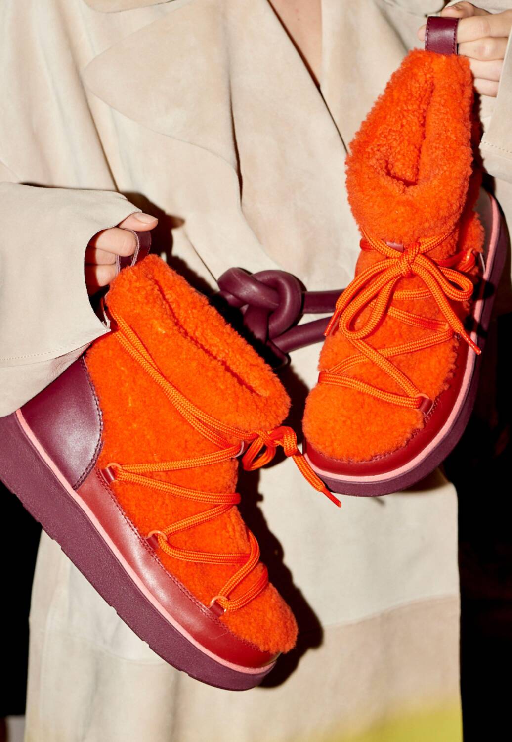 Last, but by no means least, the Gen-FF Curly-Shearling Crisscross-Lace Ankle Boot is a sporty style winter boot with a cosy shearling upper, and it’s available in all-black, black and blue with a plum sole, chartreuse, olive and army green, and tangerine and rose with a plum sole. Trekking through city slush on your way to work? Heading back to the chalet for aprés-ski after ripping up the mountainous terrain? These boots were made for walking you to your destination, whatever it might be, and keeping you comfy and protected from the cold from day to night.