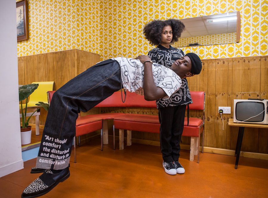Looking to the seminal photography of Dave Hendley – who captured rude boy culture both in Jamaica and the UK during the late 1970s – Lambert and Maidoh created their own interpretation of the Fred Perry Shirt; splicing the torso with crochet inserts in yellow, grey and red. Also up for grabs are knitted t-shirts in punchy stripes, bowling shirts in boxy cuts and a cracking pair of turn-up jeans stamped with the quote, “Art should comfort the disturbed and disturb the comfortable’. “We love it when a piece has a rich story to tell so we can bring this to the modern day and live in the future,” explain the duo. “With the Fred Perry archive, it’s like we’re kids in the candy store.”