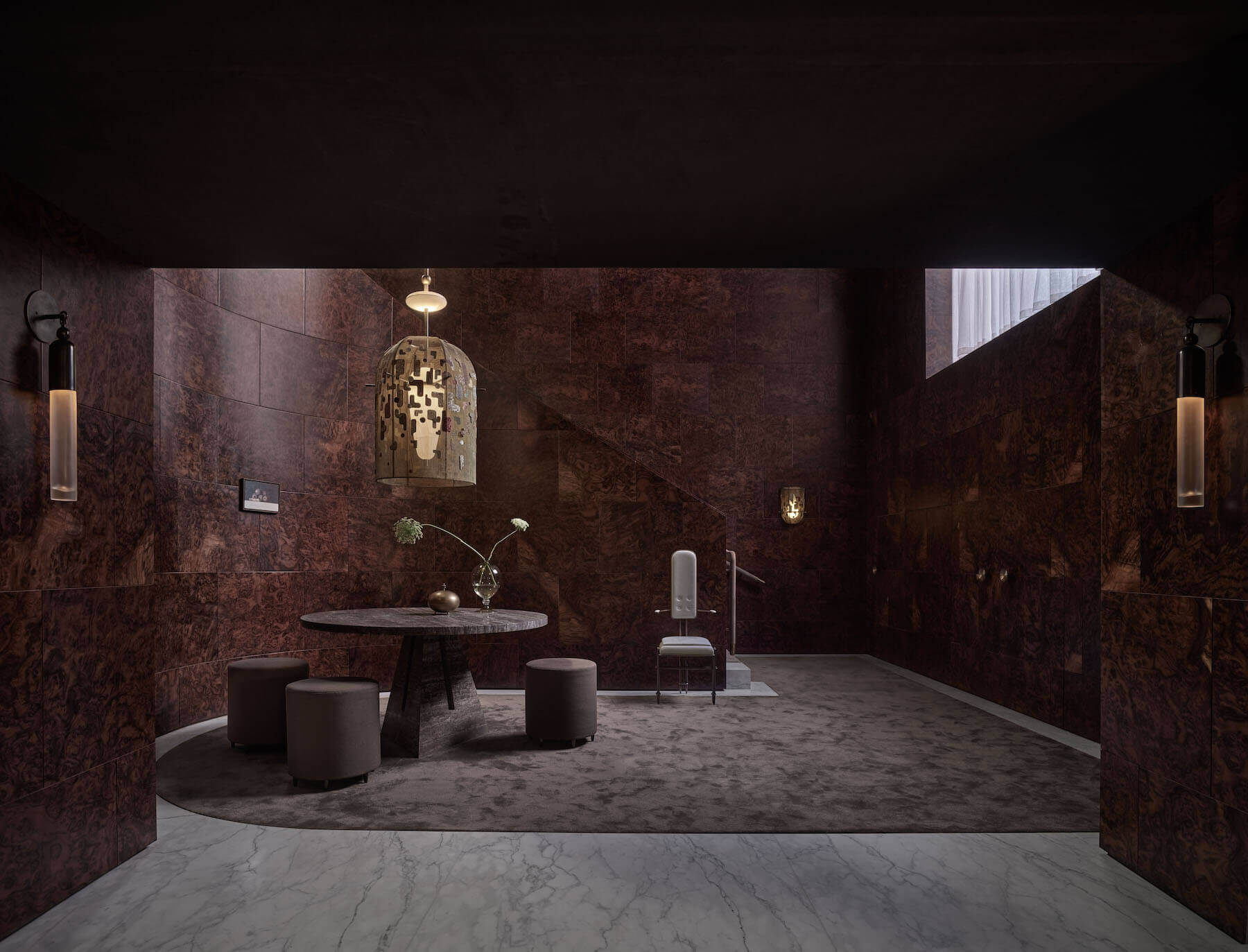 The steps give way to the lower ground floor Lounge, an utterly immersive room that feels like a luxe private member’s club and is entirely veneered in bronze mirror. Ruled by a generously-sized sofa as well as the studio’s elevated library of materials and finishes for your browsing pleasure, it invites those who enter to linger for a little while.