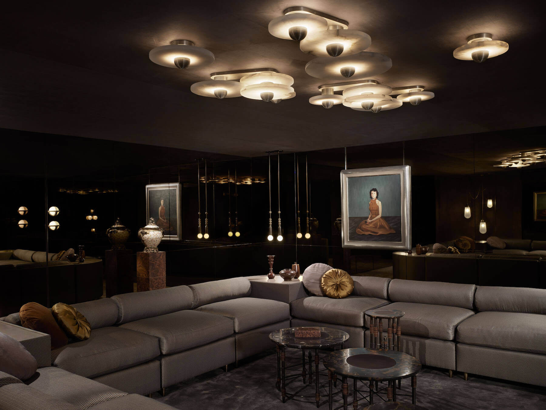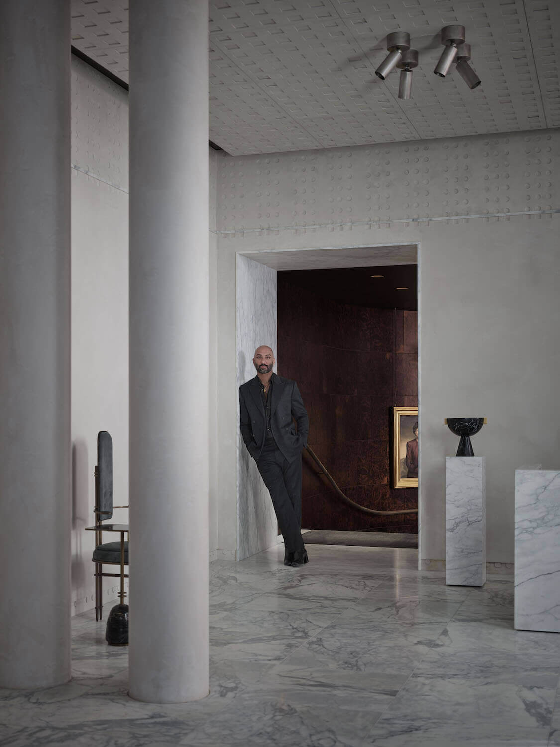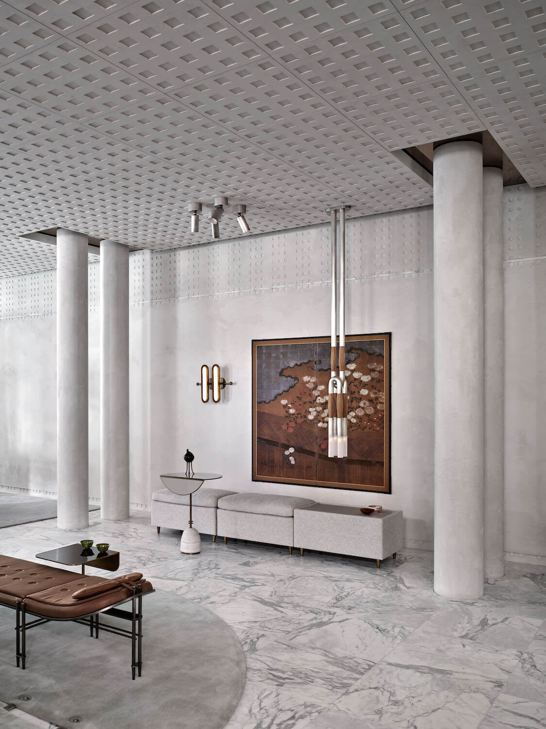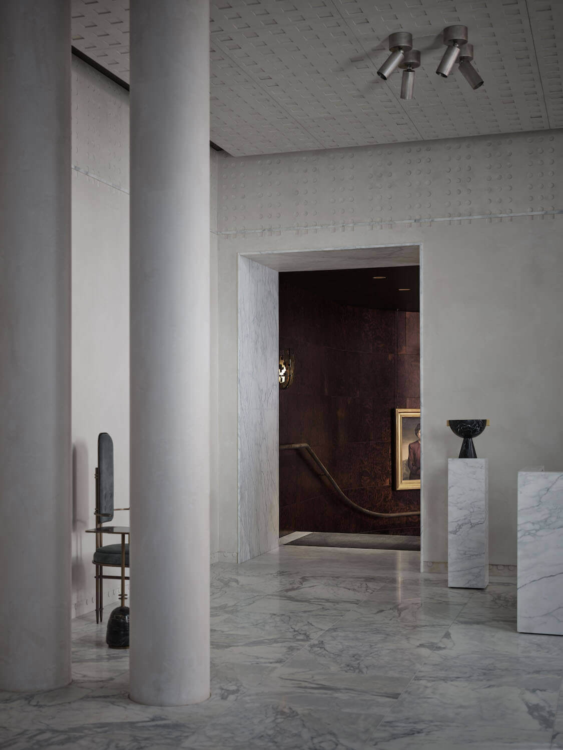 Formerly a Christopher Kane boutique, the historic Grade II-listed space at 7 Mount Street – acquired by the studio in 2021 – dates back to the 1890s and encapsulates 3,200 square-feet of Apparatus lighting, furniture and objects strategically splayed through the rich Italian Calacatta Classico marble and subtle, hand-trowelled plaster walls and flooring. “Because the building is Grade II-listed, we’ve built an entire shell inside the original architecture to not interfere with its integrity,” says Hendifar. “Some of the original classical ornamentation is reinterpreted in the plaster work on the walls and ceilings on the ground floor in a way that is distilled and expressed through an Apparatus lens.”