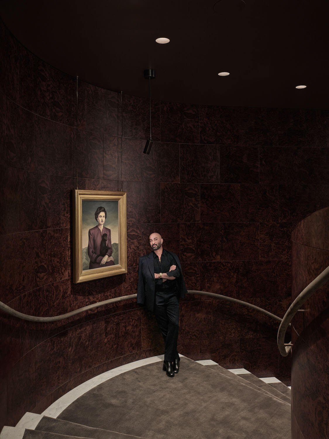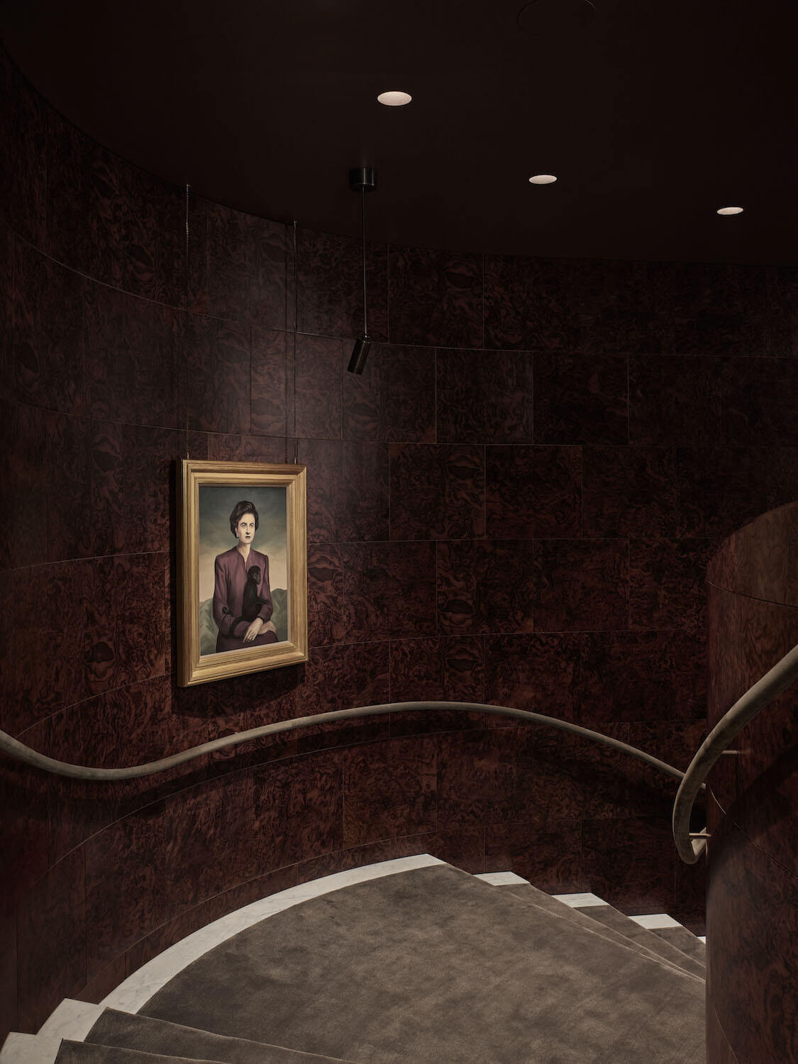 A property rendered in grand red brick and Portland stone, you’ll enter through a vestibule sheathed in patinated brass into the main gallery space. Set across two dramatically scaled floors punctuated by a series of imposing columns set within a bronze mirror border, the levels are bound together by an opulent burl-lined staircase complete with textural suede balustrade – a nod to the restrained, modernist beauty of Eltham Palace’s alluring stairwells in South London and Villa Necchi Campiglio in Milan, which were both constructed in the 1930s. Also bordered by bronze, a vast suspended internal ceiling lends the space a subtly extraterrestrial atmosphere of a spacecraft.