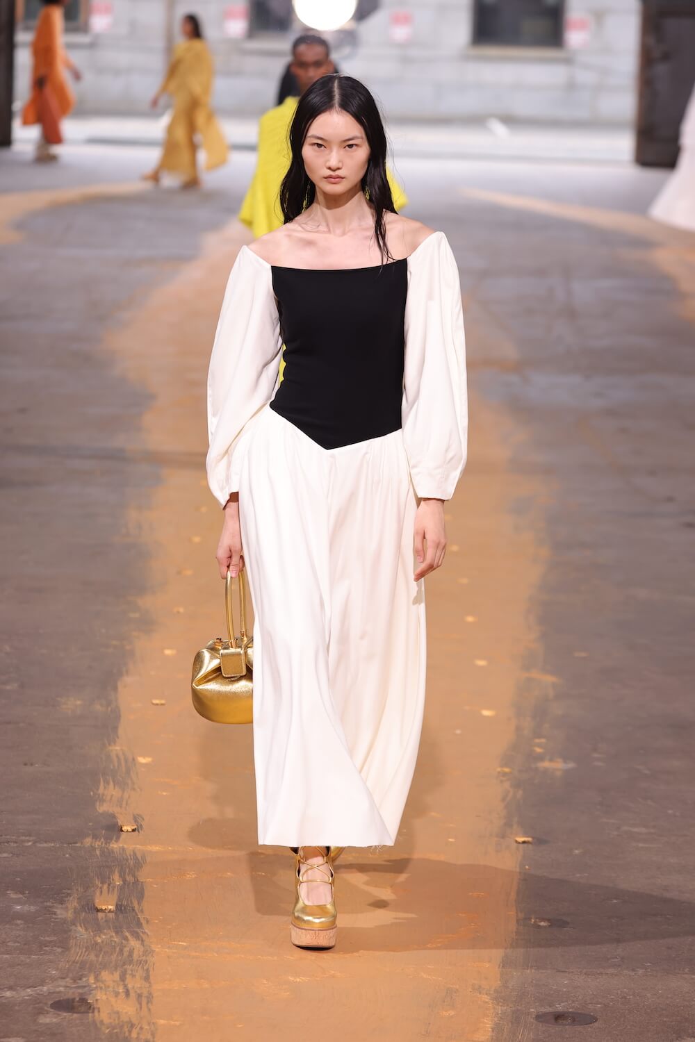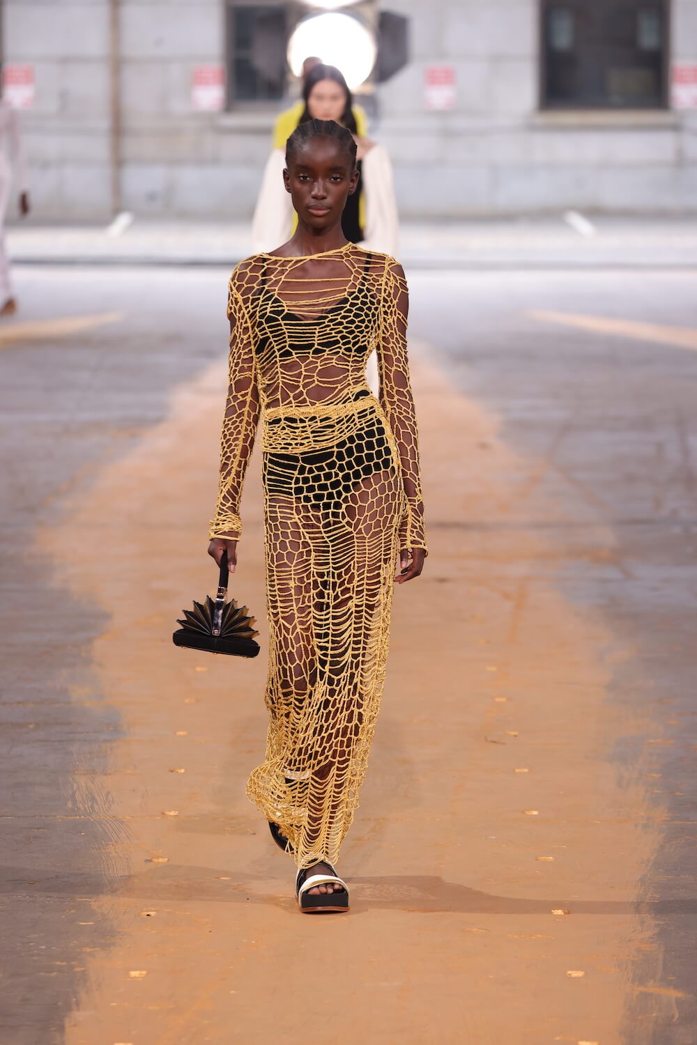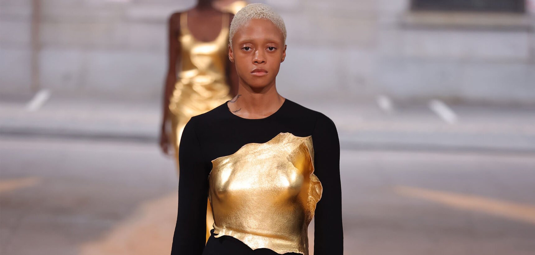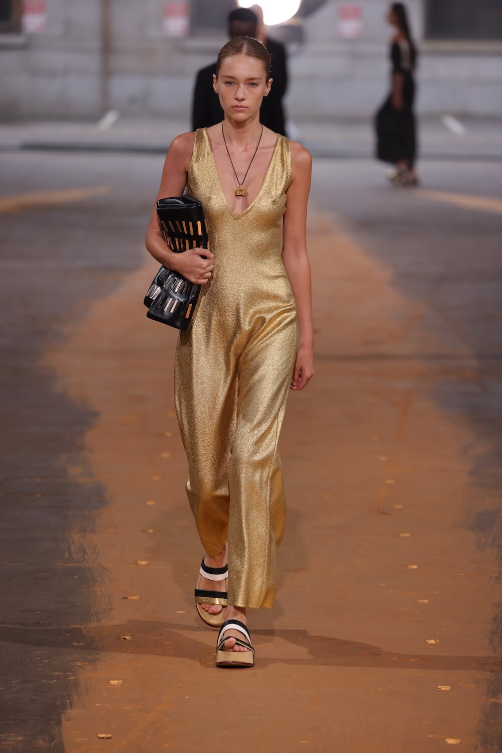 Opening with an array of black jersey gowns fixed with contoured gold nappa on raw-edge vachetta leather, slithering open spaces that permeated silk ladder-stitch knit dresses and frocks printed with ionic greek-columns, Gabriela Hearst’s latest edit immediately felt very Athena, Goddess of wisdom and war – except it wasn’t, it was Sappho. Sappho was an Ancient Greek poet who not only composed nine books but also shed light on our incompatible relationship with the Earth as well as women’s hardships and sexual preferences, wielding her words like a culture-disrupting weapon way before it was cool.