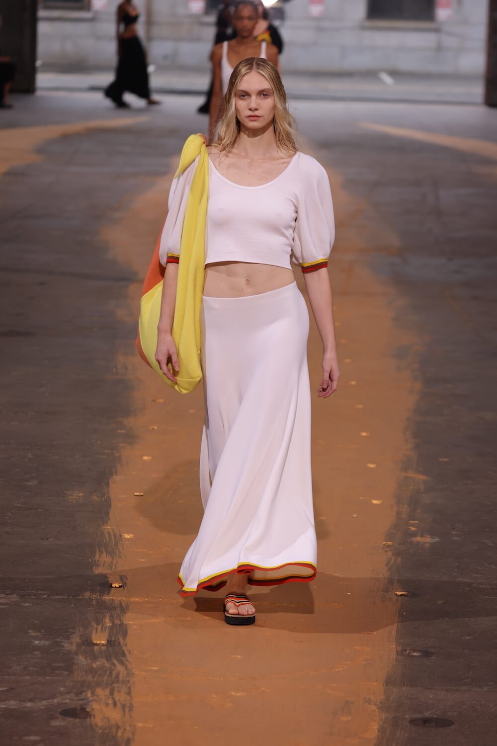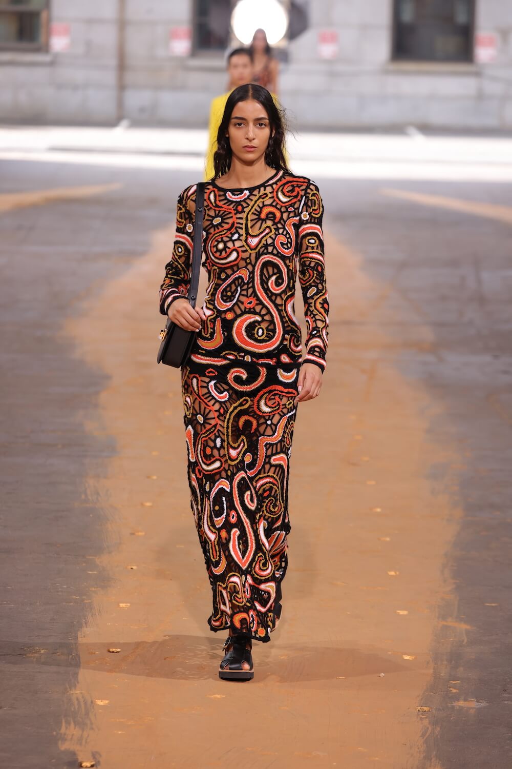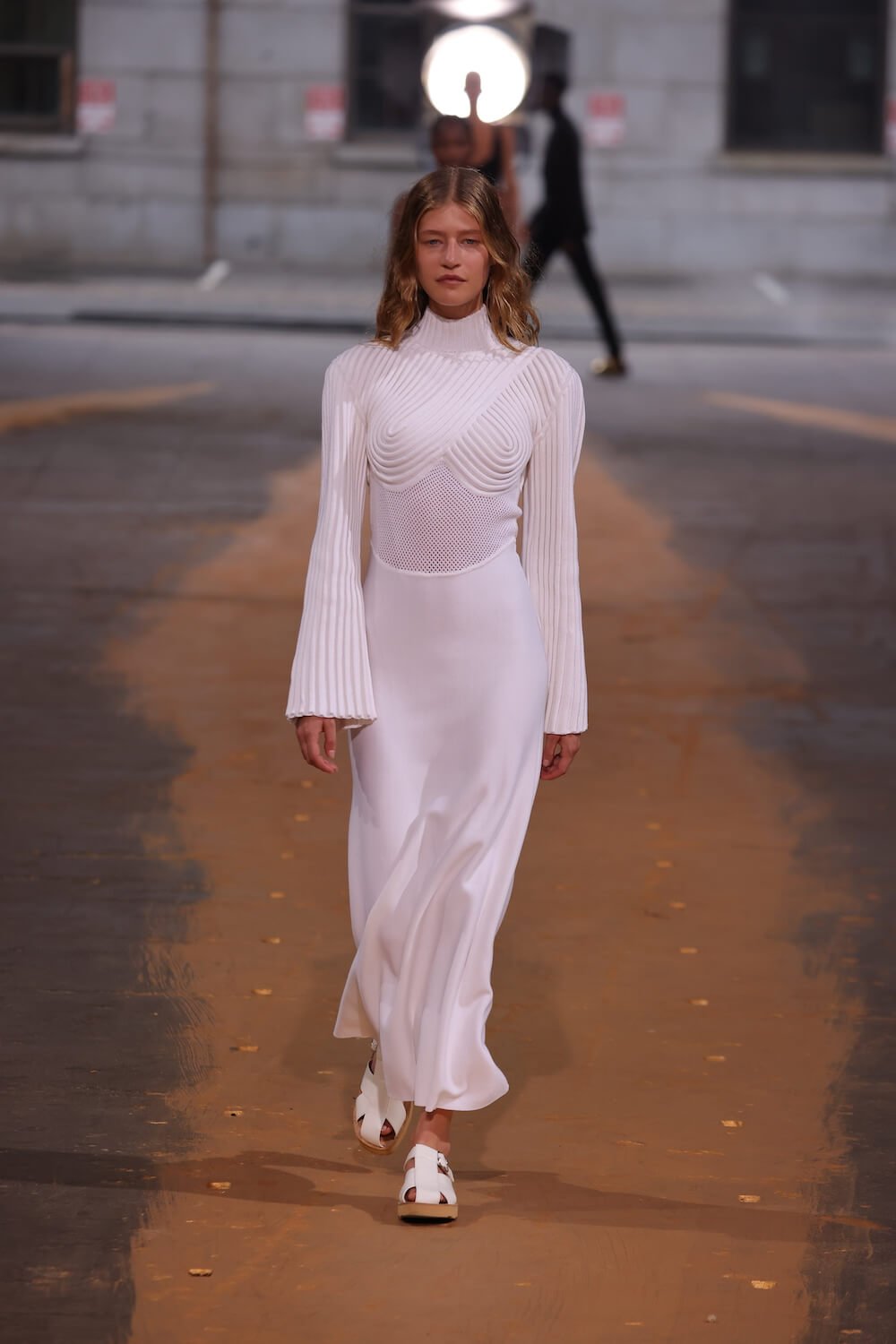 Opening with an array of black jersey gowns fixed with contoured gold nappa on raw-edge vachetta leather, slithering open spaces that permeated silk ladder-stitch knit dresses and frocks printed with ionic greek-columns, Gabriela Hearst’s latest edit immediately felt very Athena, Goddess of wisdom and war – except it wasn’t, it was Sappho. Sappho was an Ancient Greek poet who not only composed nine books but also shed light on our incompatible relationship with the Earth as well as women’s hardships and sexual preferences, wielding her words like a culture-disrupting weapon way before it was cool.