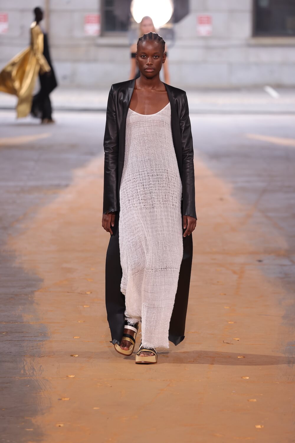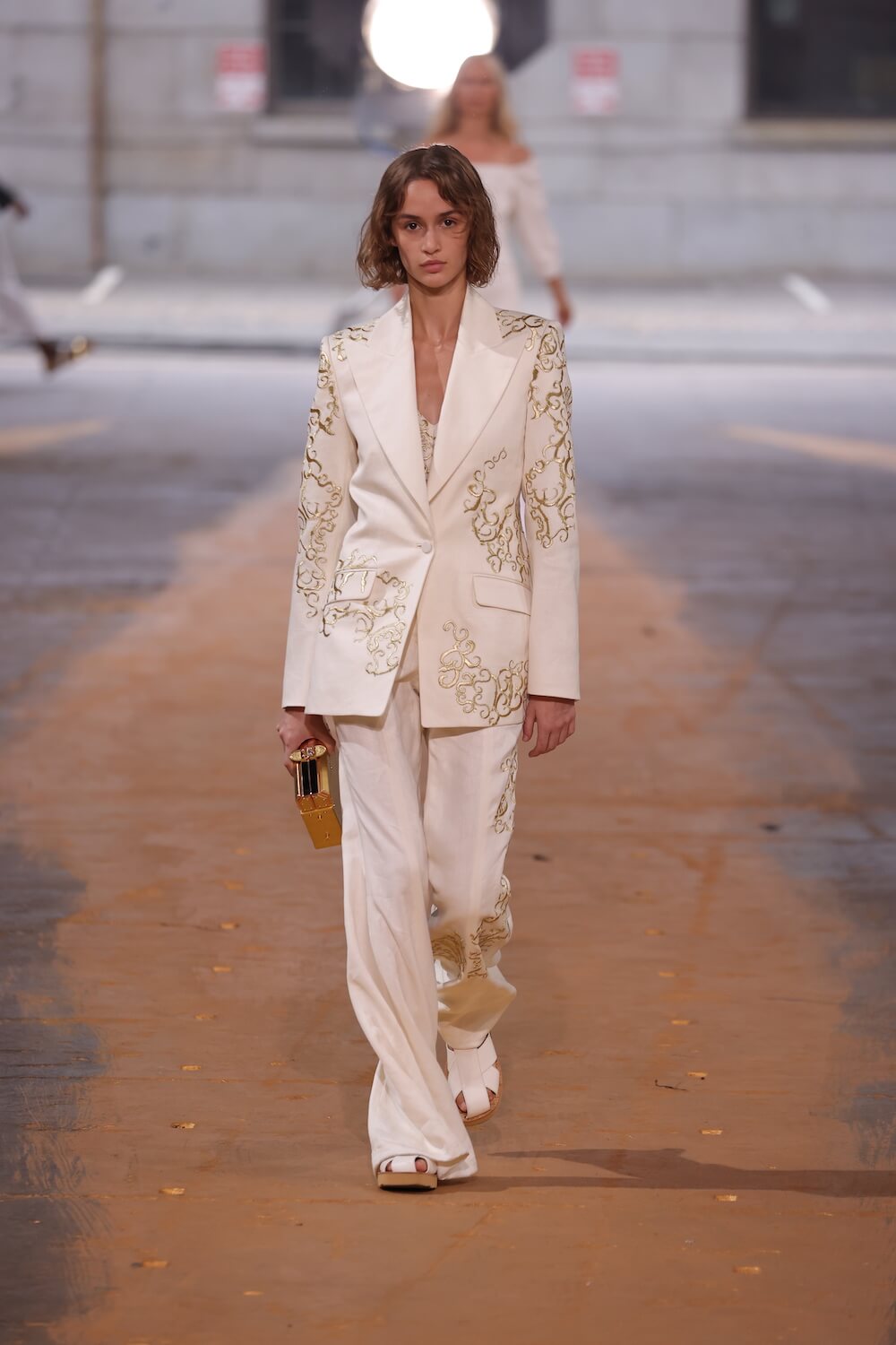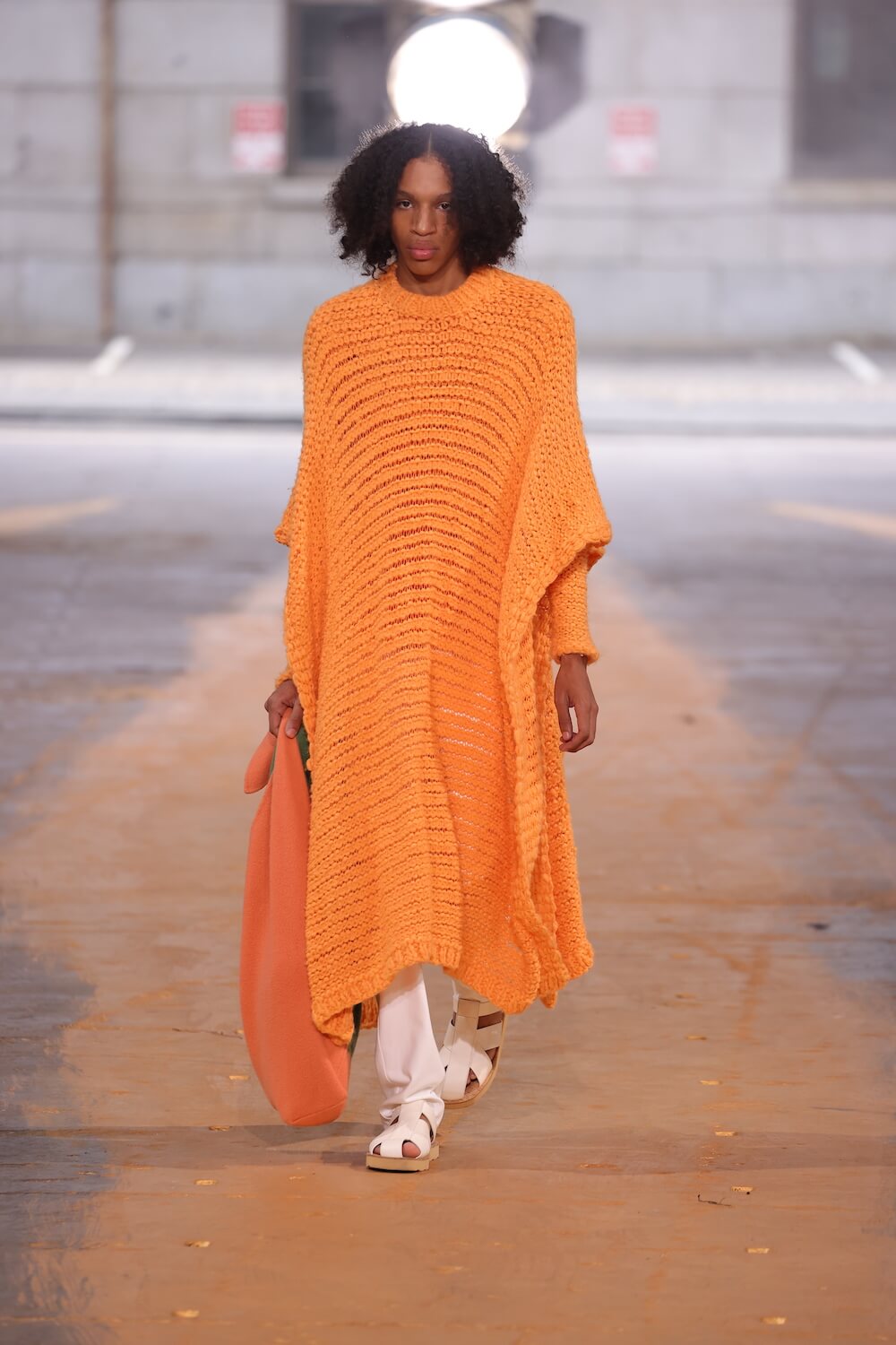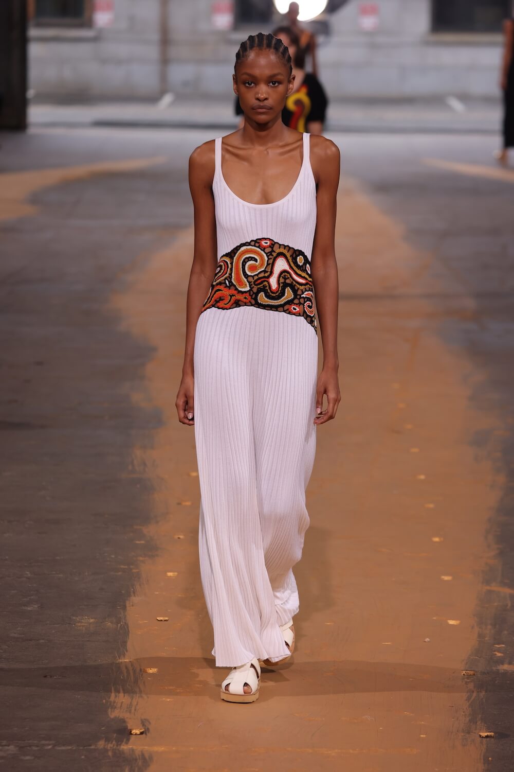 Opening with an array of black jersey gowns fixed with contoured gold nappa on raw-edge vachetta leather, slithering open spaces that permeated silk ladder-stitch knit dresses and frocks printed with ionic greek-columns, Gabriela Hearst’s latest edit immediately felt very Athena, Goddess of wisdom and war – except it wasn’t, it was Sappho. Sappho was an Ancient Greek poet who not only composed nine books but also shed light on our incompatible relationship with the Earth as well as women’s hardships and sexual preferences, wielding her words like a culture-disrupting weapon way before it was cool.