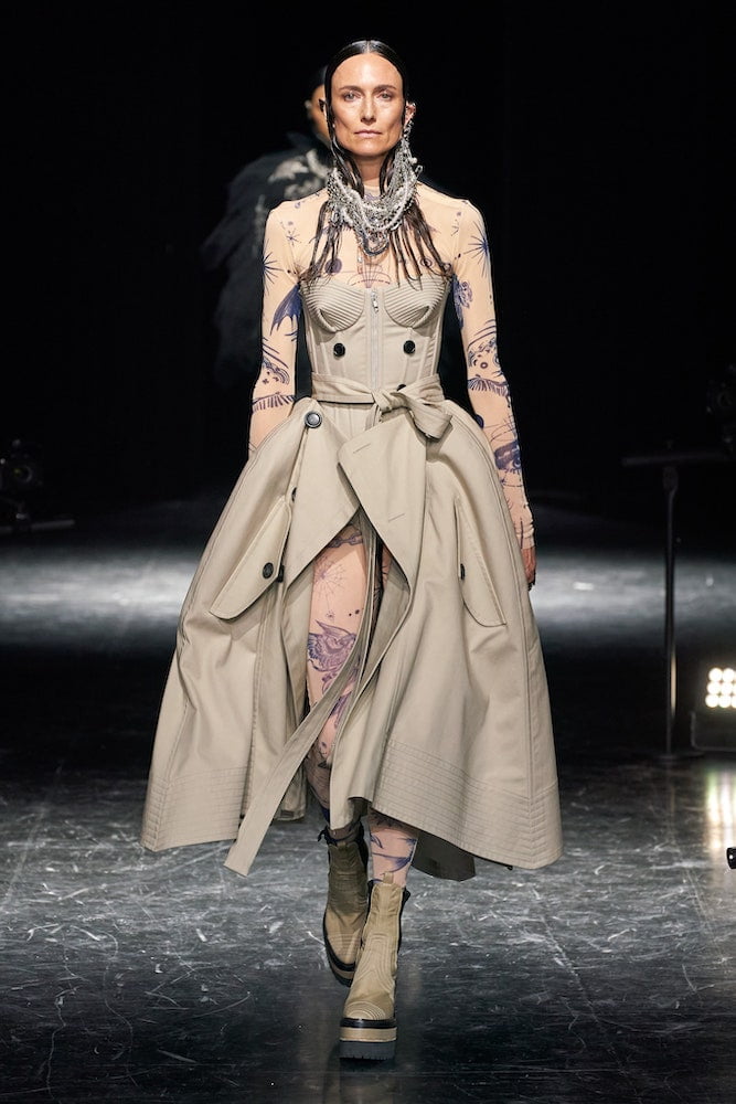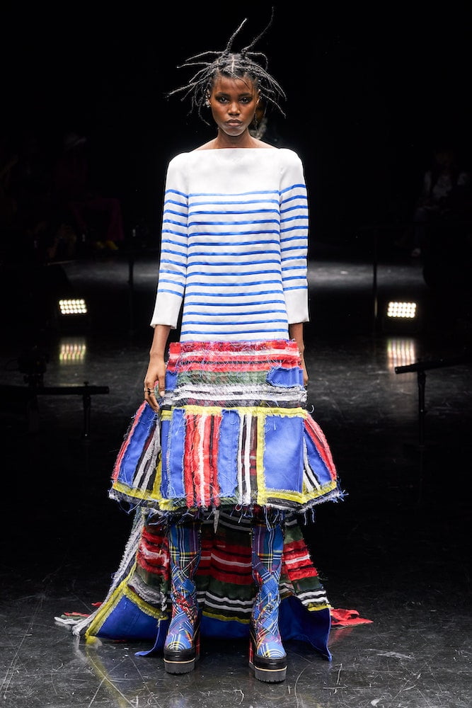 The collection she created was to have been shown last July but was postponed due to the pandemic, something which Abe now sees as a blessing as it gave her more time to work on it. Melding her own hybrid techniques with Gaultier’s couture cannon Abe created a stunning collection. It was Gaultier but seen through a fresh lens. She sculpted crinolined trench dresses with pointy busts, layered deconstructed pinstripes over tattoo bodysuits, melded pink satin corsetry and tailoring (a la Madonna’s Blonde Ambition), repurposed old jeans into sweeping frock coats, created Breton stripes from layer upon layer of tulle and produced a version of the Tibetan themed 1994 look that Björk famously wore on the Gaultier runway.