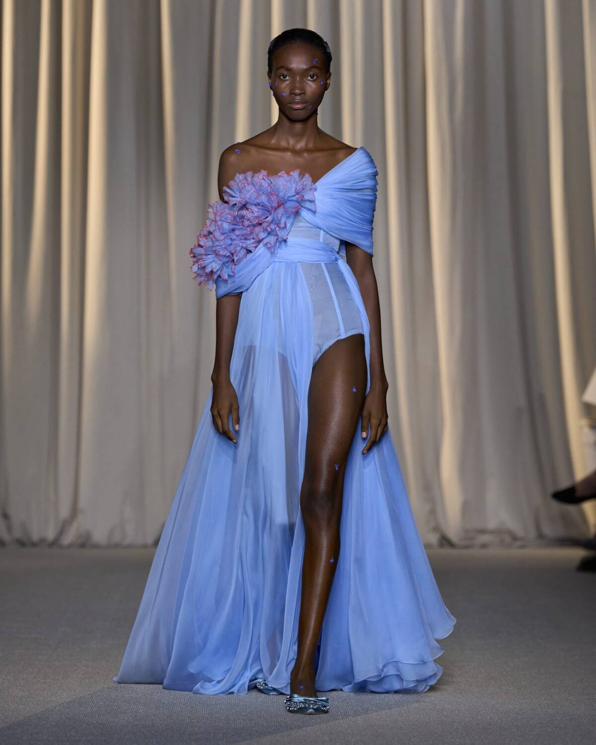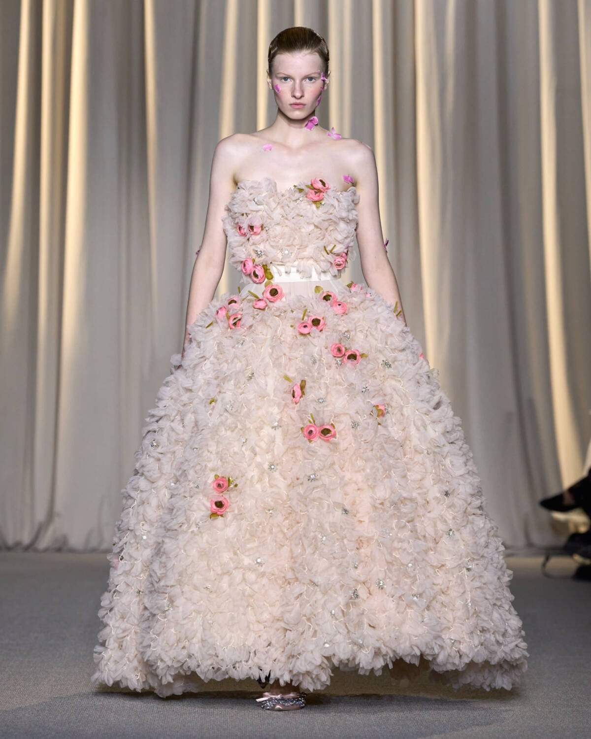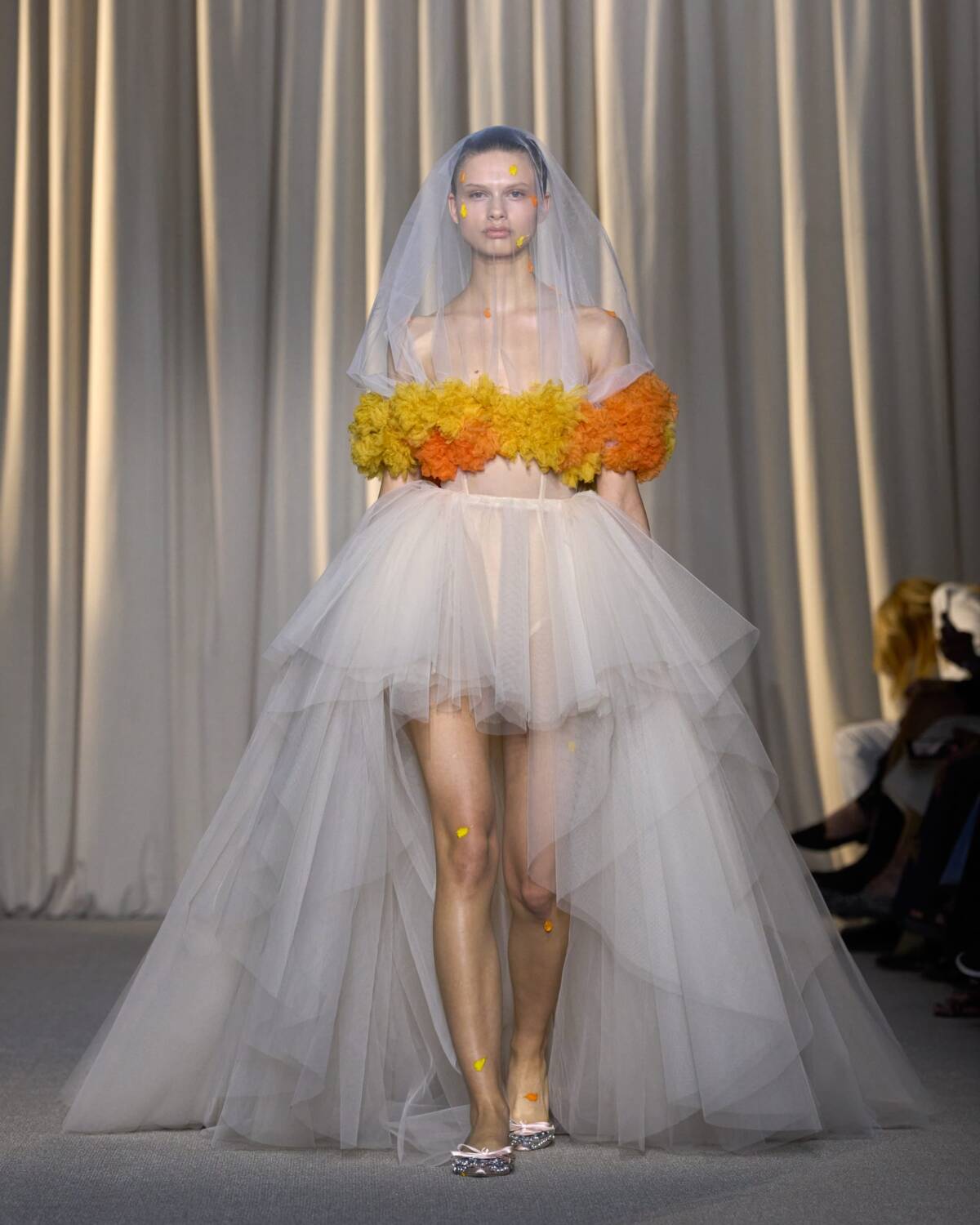 Some models sported floor-sweeping frocks, their faces painted periwinkle or pink and shrouded by draped hoods. Others stepped out in heaps and heaps of silk, chiffon, tulle, gossamer, organza and muslin, elevated with hand-done embroidery and trains crafted for swooping out of rooms in drastic fashion. Marigolds, carnations and peonies danced across the opulent ball gowns, bringing a truly summery feel to the range, wherein each look was named for a flower, bouquet or gemstone.