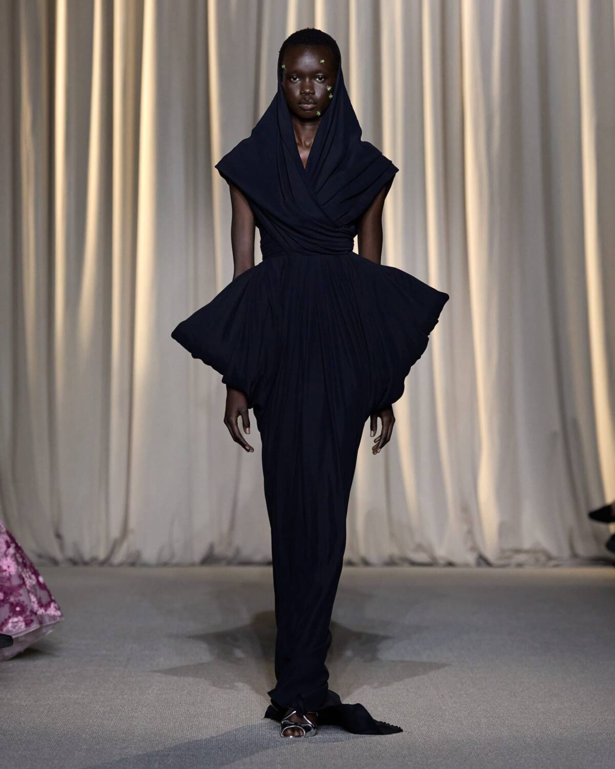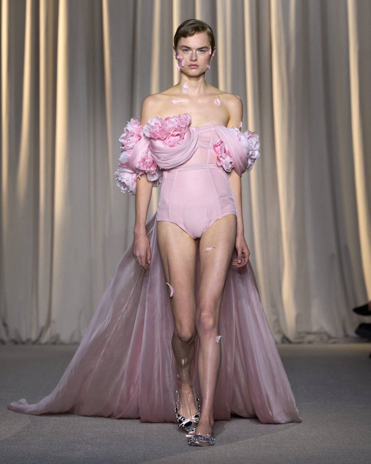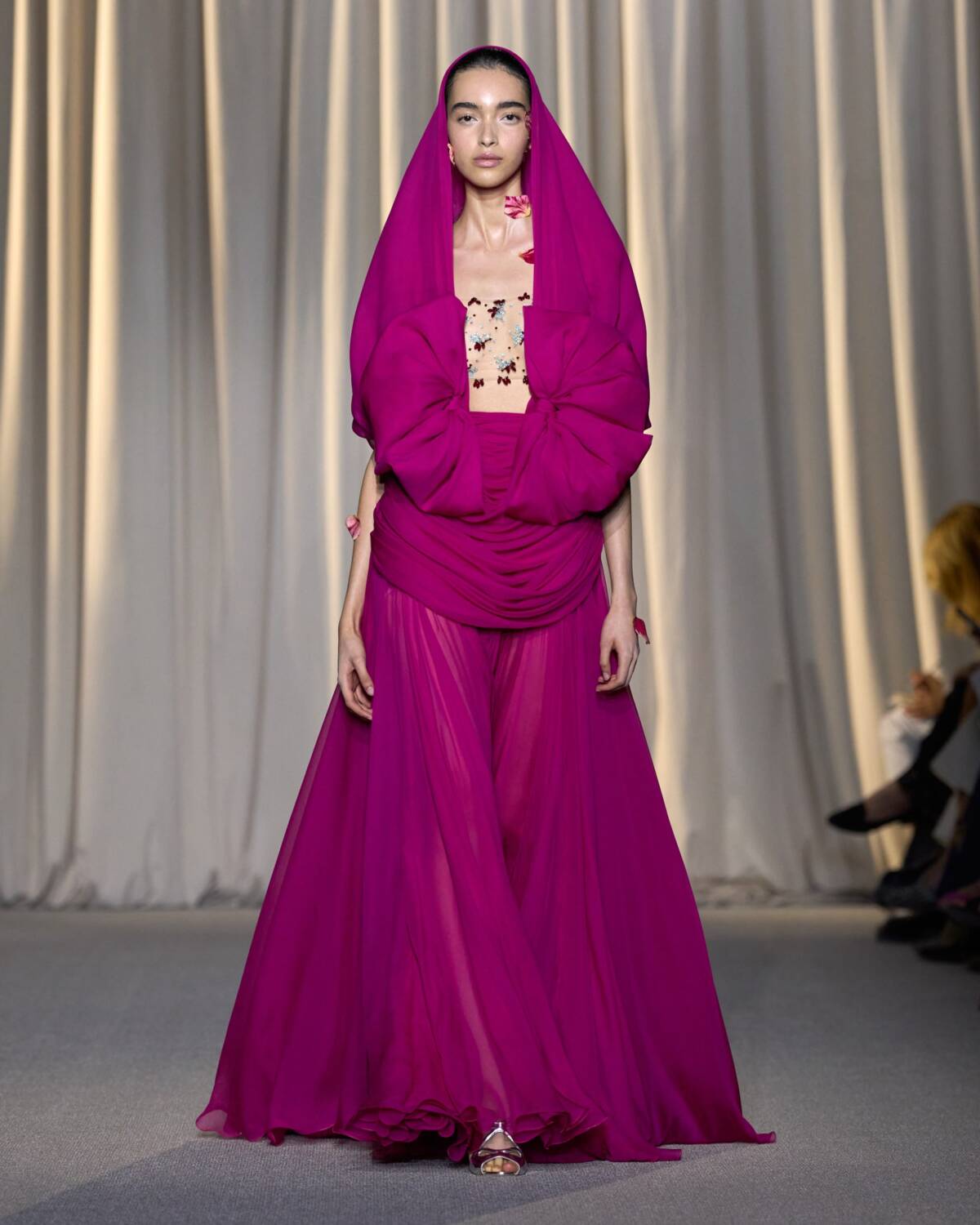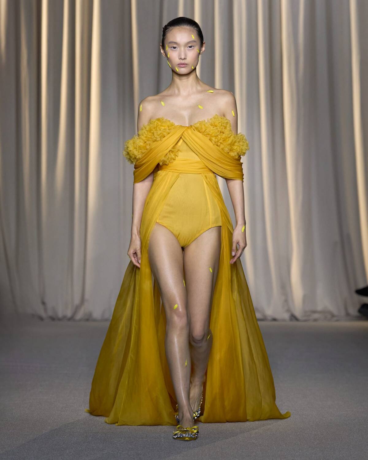 Some models sported floor-sweeping frocks, their faces painted periwinkle or pink and shrouded by draped hoods. Others stepped out in heaps and heaps of silk, chiffon, tulle, gossamer, organza and muslin, elevated with hand-done embroidery and trains crafted for swooping out of rooms in drastic fashion. Marigolds, carnations and peonies danced across the opulent ball gowns, bringing a truly summery feel to the range, wherein each look was named for a flower, bouquet or gemstone.