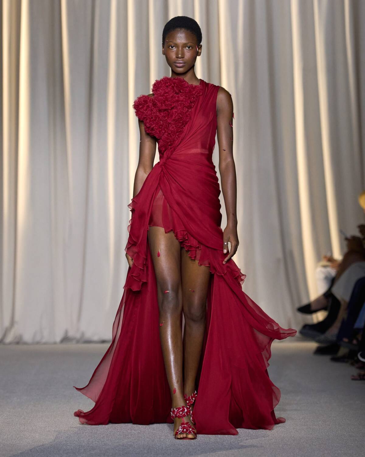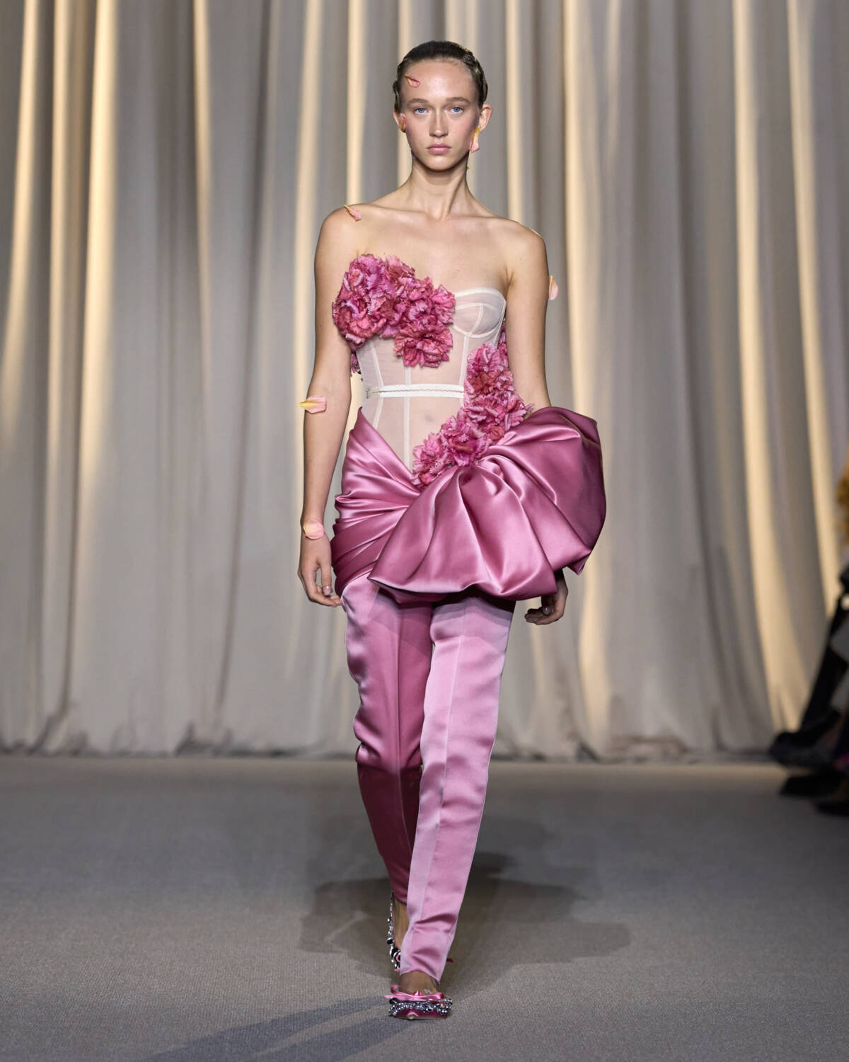 Giambattista Valli’s AW24 couture collection was like a midsummer’s night dream doused in decadence. Moseying through the Pavillon Vendôme, a conveyor belt of extravagant gowns in vivid cupcake colours – yellow, pink, red, green, white, blue – emerged, worn by models with the effortless poise of a princess. Soundtracked by a live composition by Thomas Roussel, performed by J.A. Jayant on a bamboo bansuri flute and Narendra Ranjan Gandharbra on the sitar, it was an utterly glorious outing.