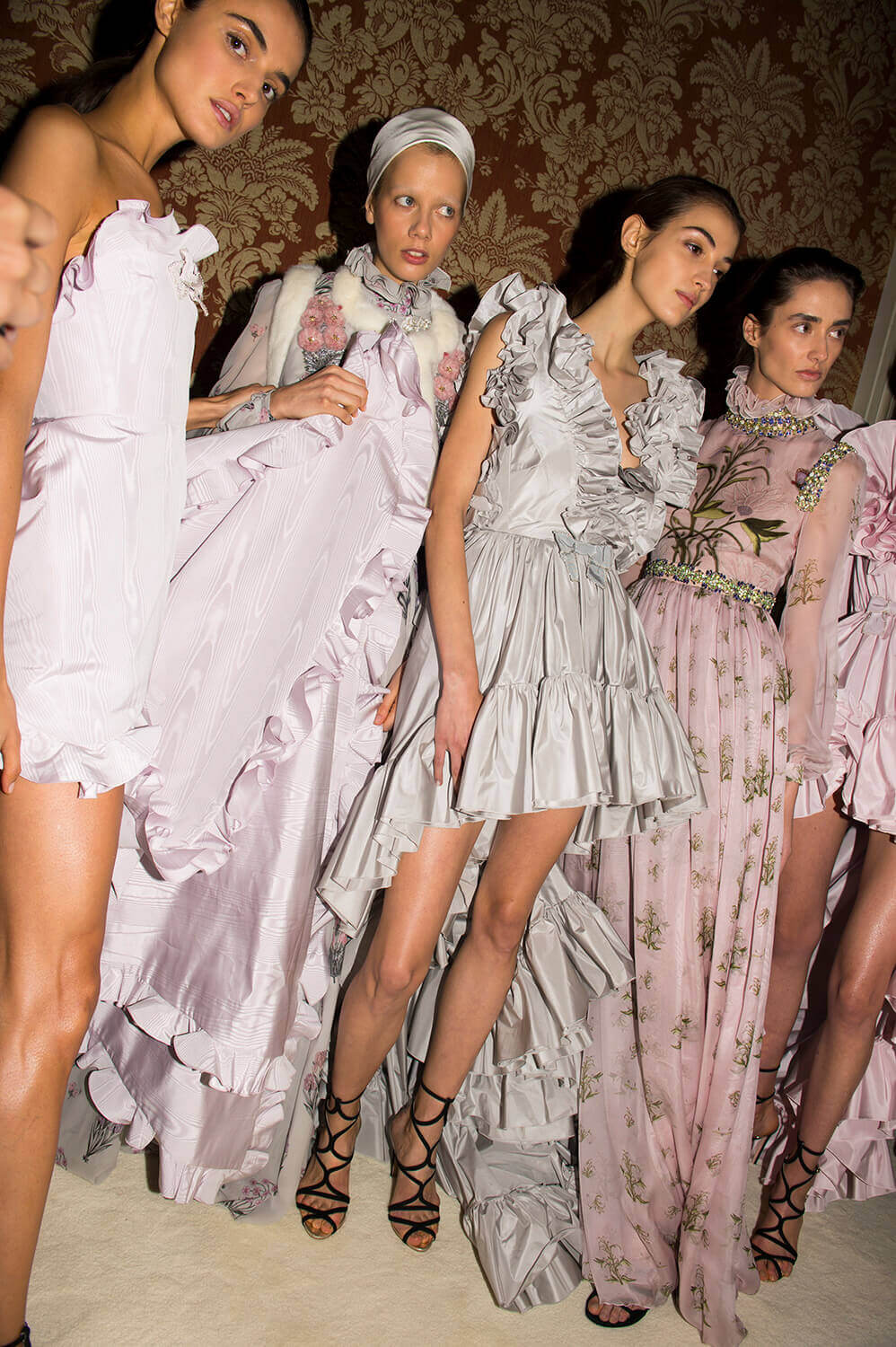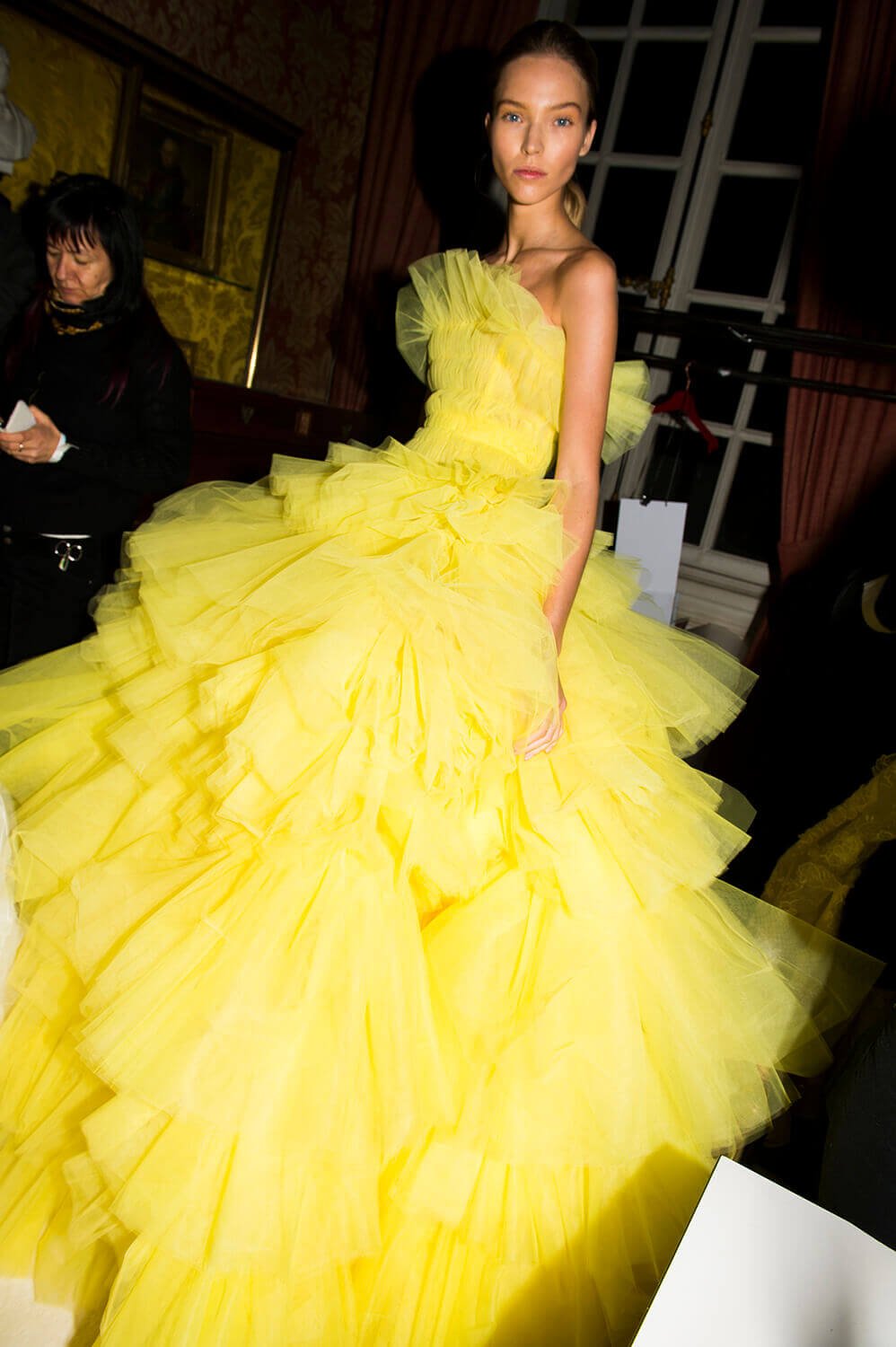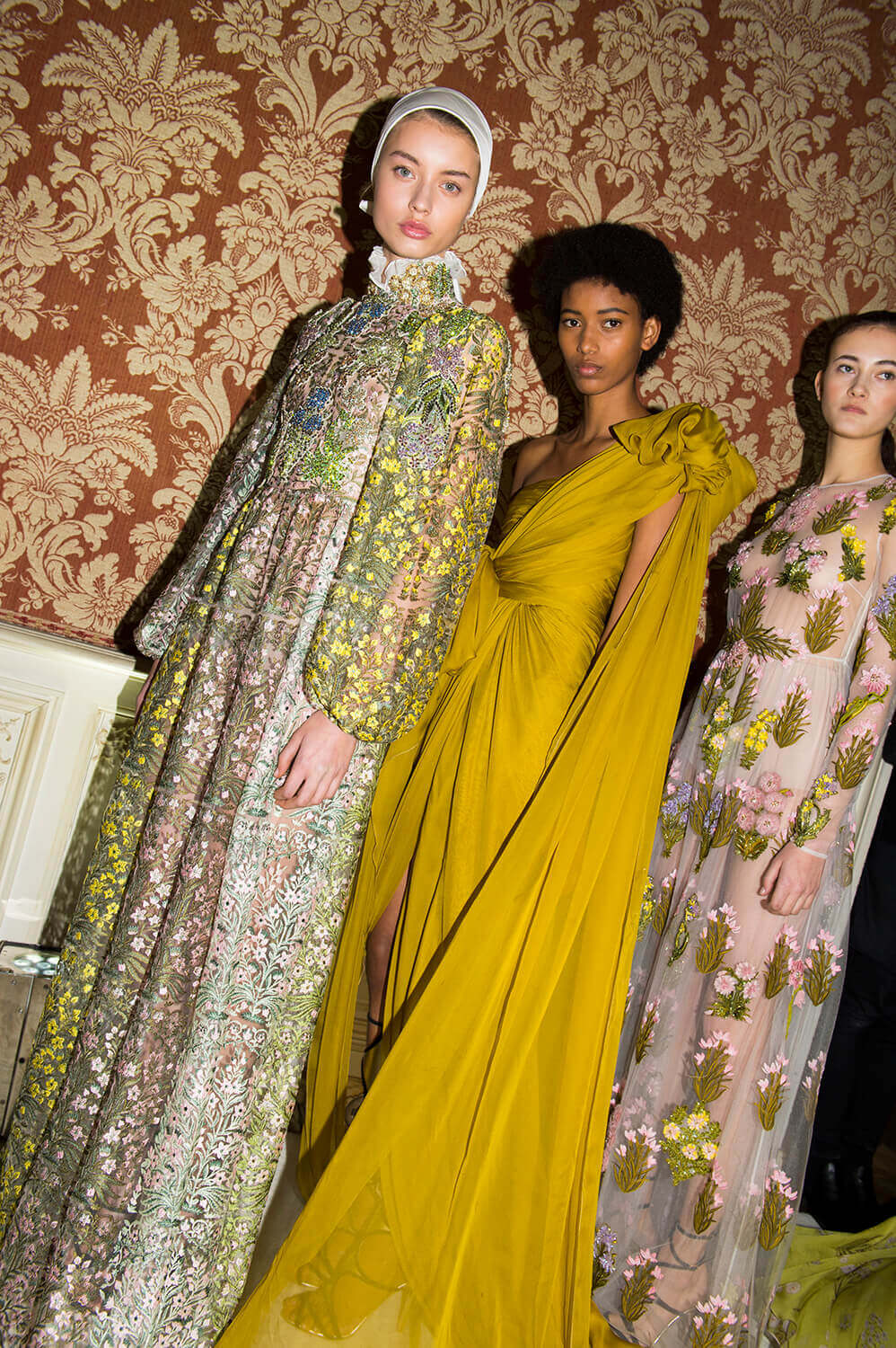 It wouldn’t be a Giambattista Valli couture show without a large explosion of tulle. And there was plenty of that here, mostly in the form of a breathtaking yellow gown which was, we reckon, about the size of the average London flat. Thus wondering if perhaps a Valli dress would make a more economically savvy living solution. A bit like sleeping in a large cloud. Not that, we should note, the gathered crowd of international glamazons have such spacial issues – this is fantasy dressing – a land where the bigger the dress, the louder their admiring coos. And here, there was plenty of frouf to go around. But Giambattista knows that man cannot survive on frouf alone, hence the selection of other beautiful goodies that glided down the catwalk – ruffled-collar dresses with crystal embellishments, shorter, almost 1960s-style, shifts, reams of exquisite floral fabrics. Getting something a bit Russian, turn-of-the-century Tsarina about it. Accessorise with large Faberge egg.