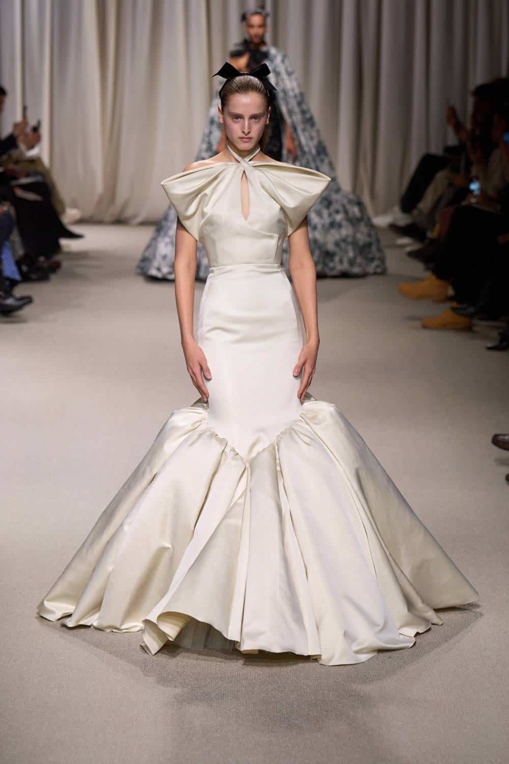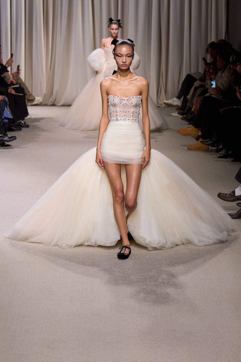 Models had their hair slicked back, topped with wide black bows and bouquets of white roses. Sharp black eyeliner signalled to attendees that the Giambattista Valli woman is not to be tussled with.