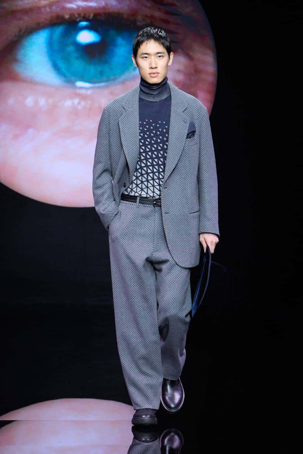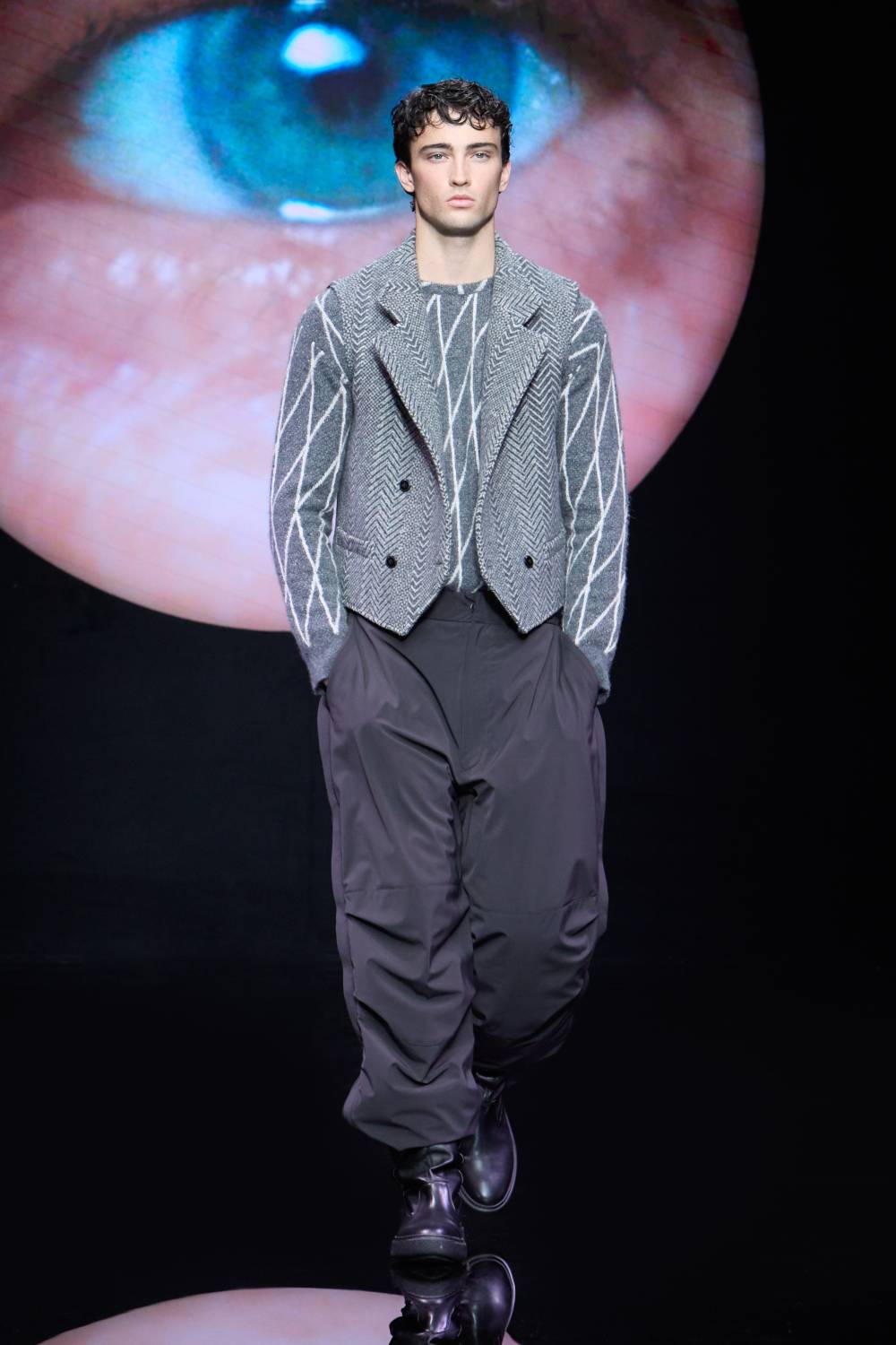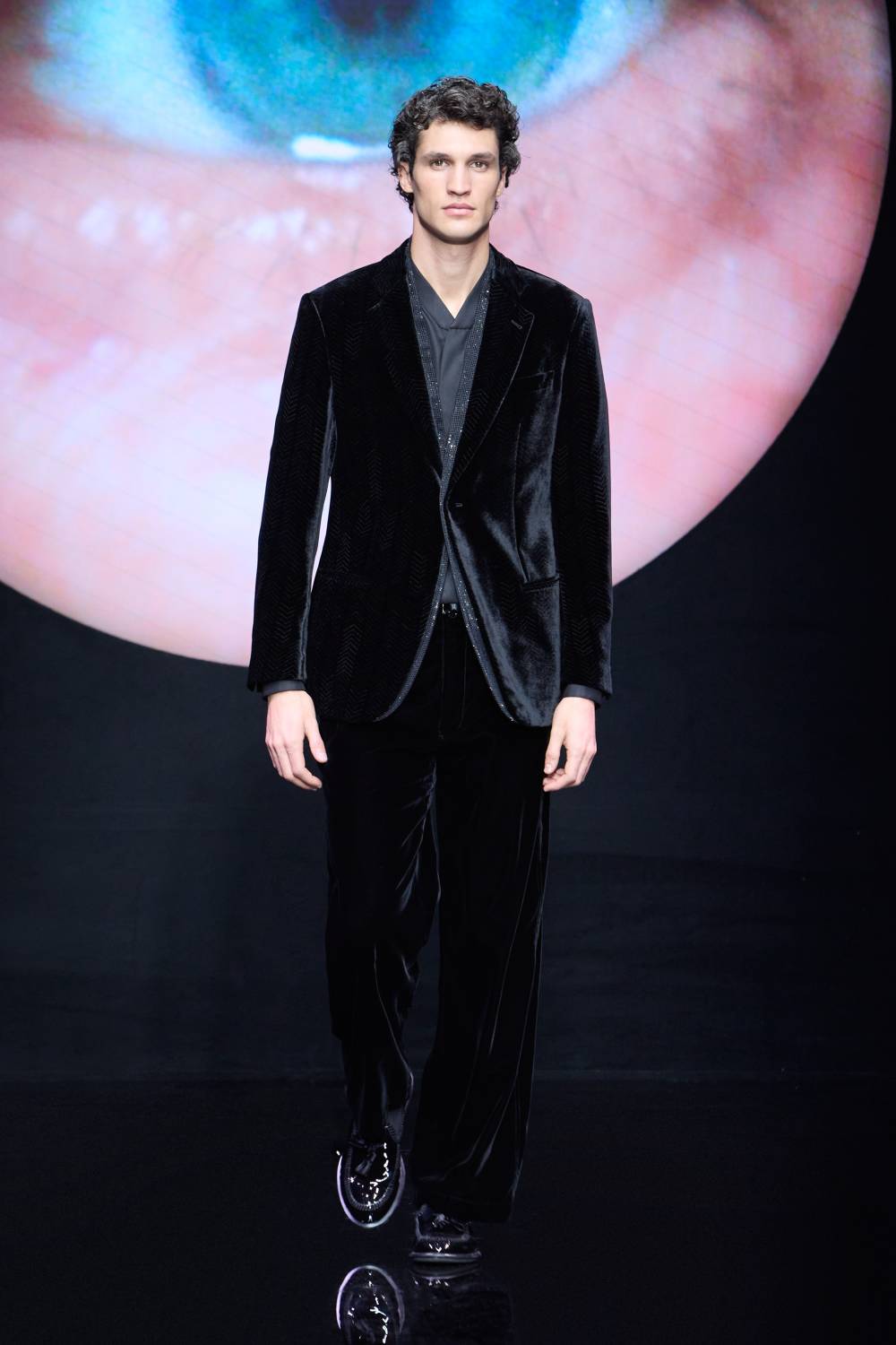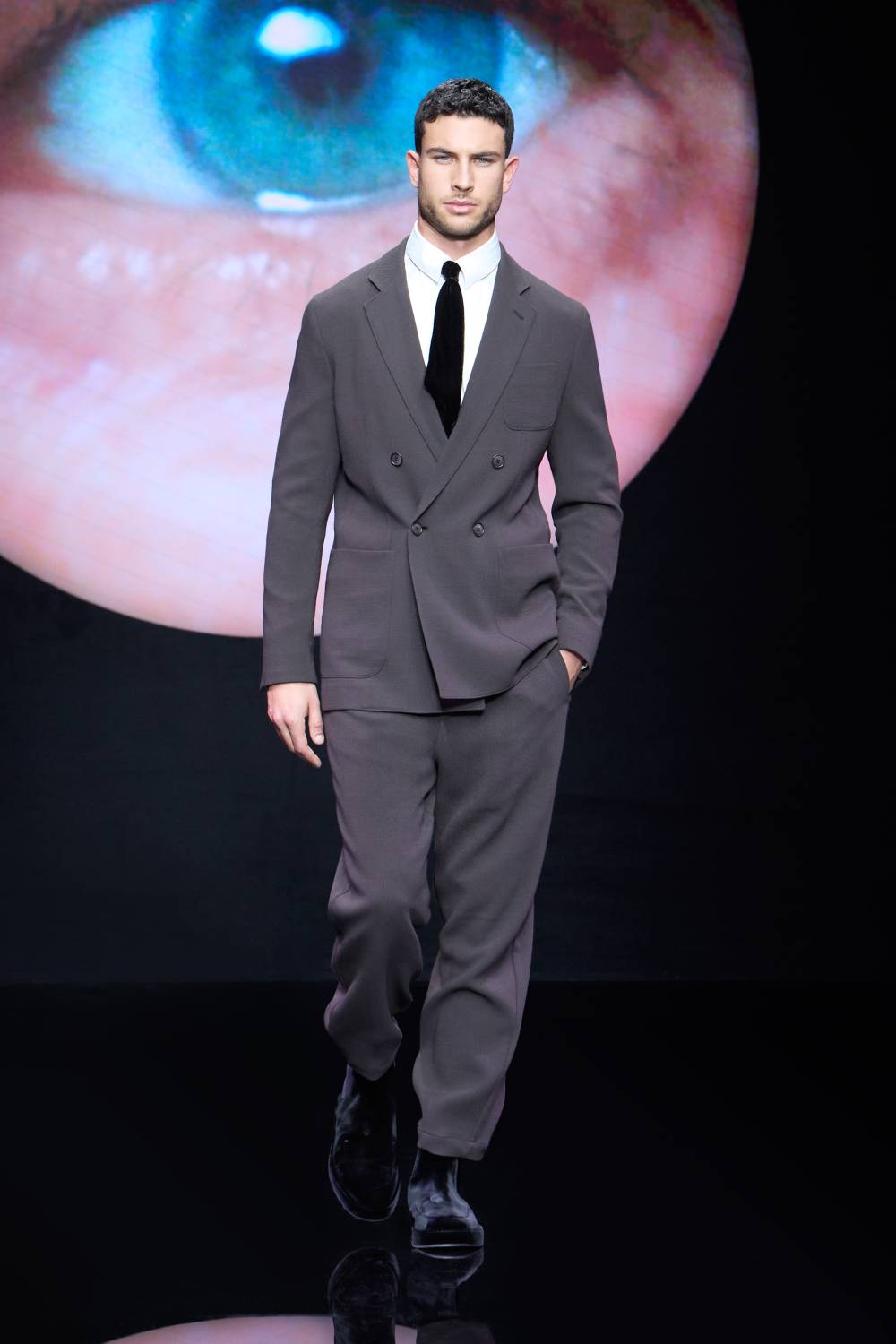 The watchful gaze of one of Mr Armani’s piercing blue eyes backdropped the designer’s latest Giorgio Armani men’s collection. The designer turns 90 this year and isn’t interested in completely reinventing his customer’s wardrobe. Instead, his clothes come laced with timeless pizazz, designed to be worn for years to come.