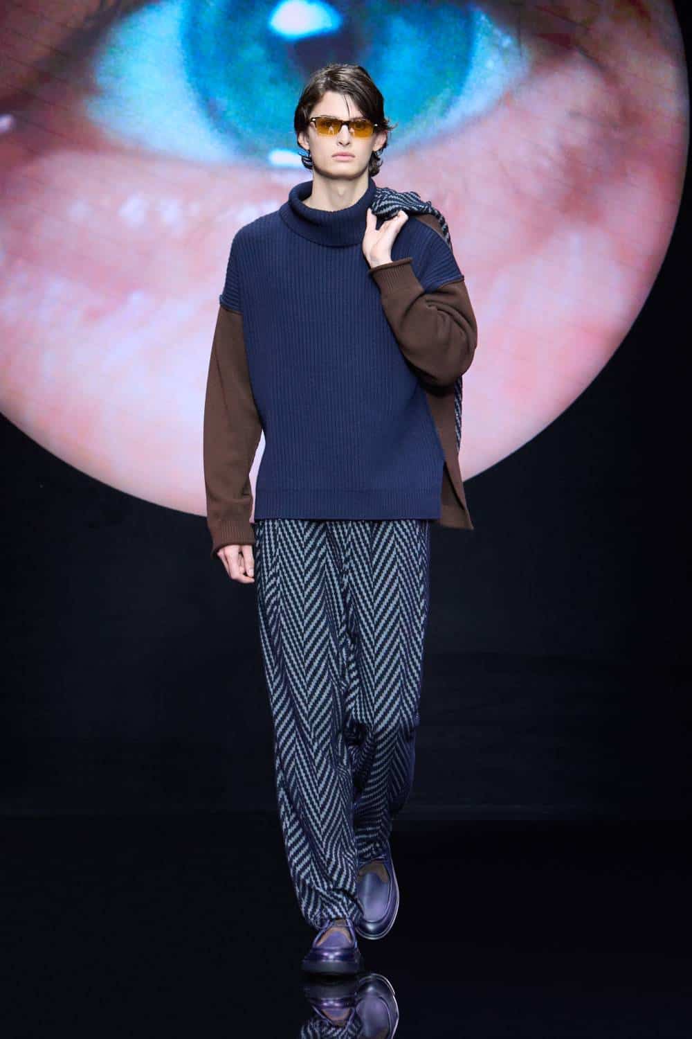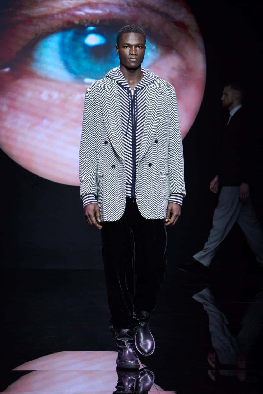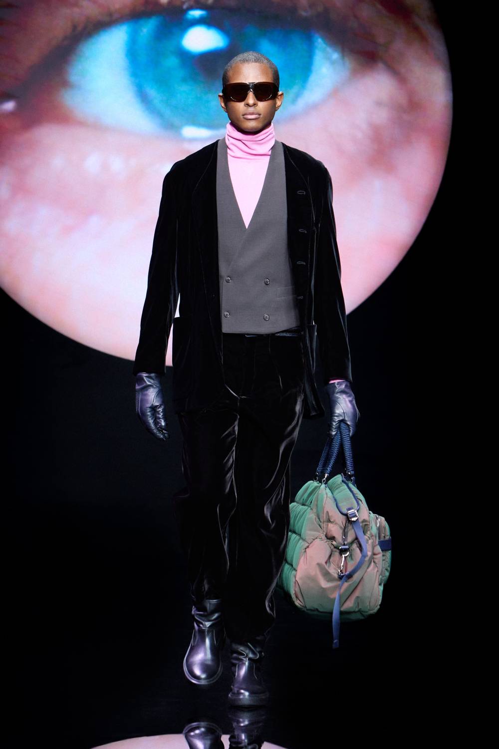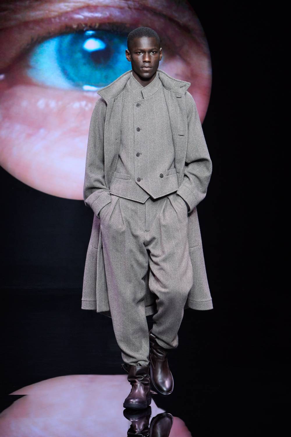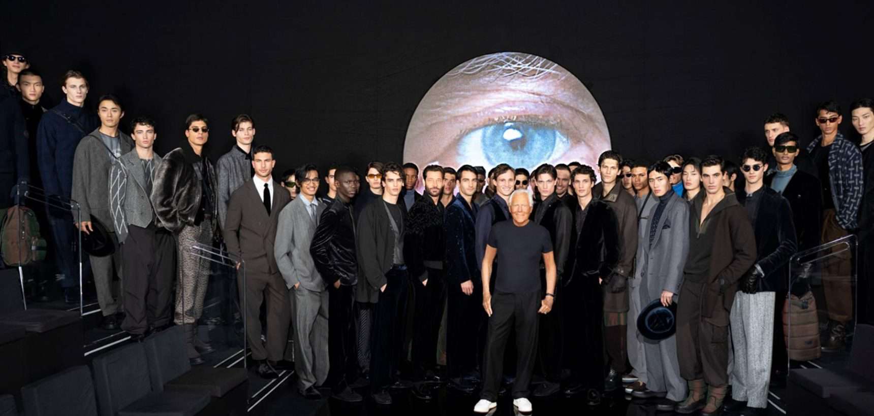 The watchful gaze of one of Mr Armani’s piercing blue eyes backdropped the designer’s latest Giorgio Armani men’s collection. The designer turns 90 this year and isn’t interested in completely reinventing his customer’s wardrobe. Instead, his clothes come laced with timeless pizazz, designed to be worn for years to come.