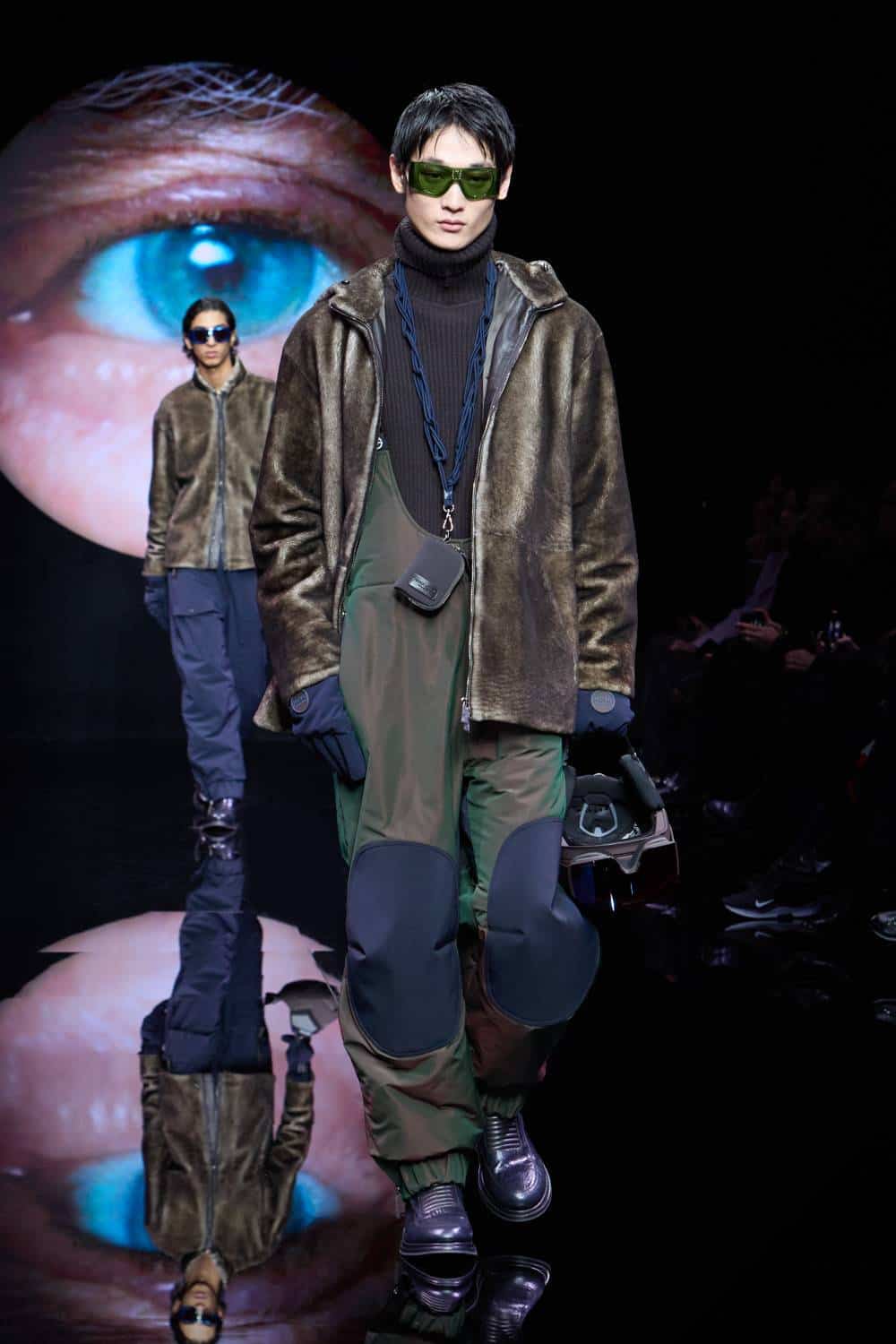 Next came a procession of Neve skiwear, were fleece trousers and iridescent-green toned puffer jackets and track pants will undoubtedly win over loyal slope-goers and gorp core bros alike. In signature Armani style, the designer closed things out with gentlemanly eveningwear, which saw snug waistcoats, navy suit jackets and handsome slippers frosted with sequins. In Giorgio Armani, you don’t have to be the loudest one in the room to make a statement.