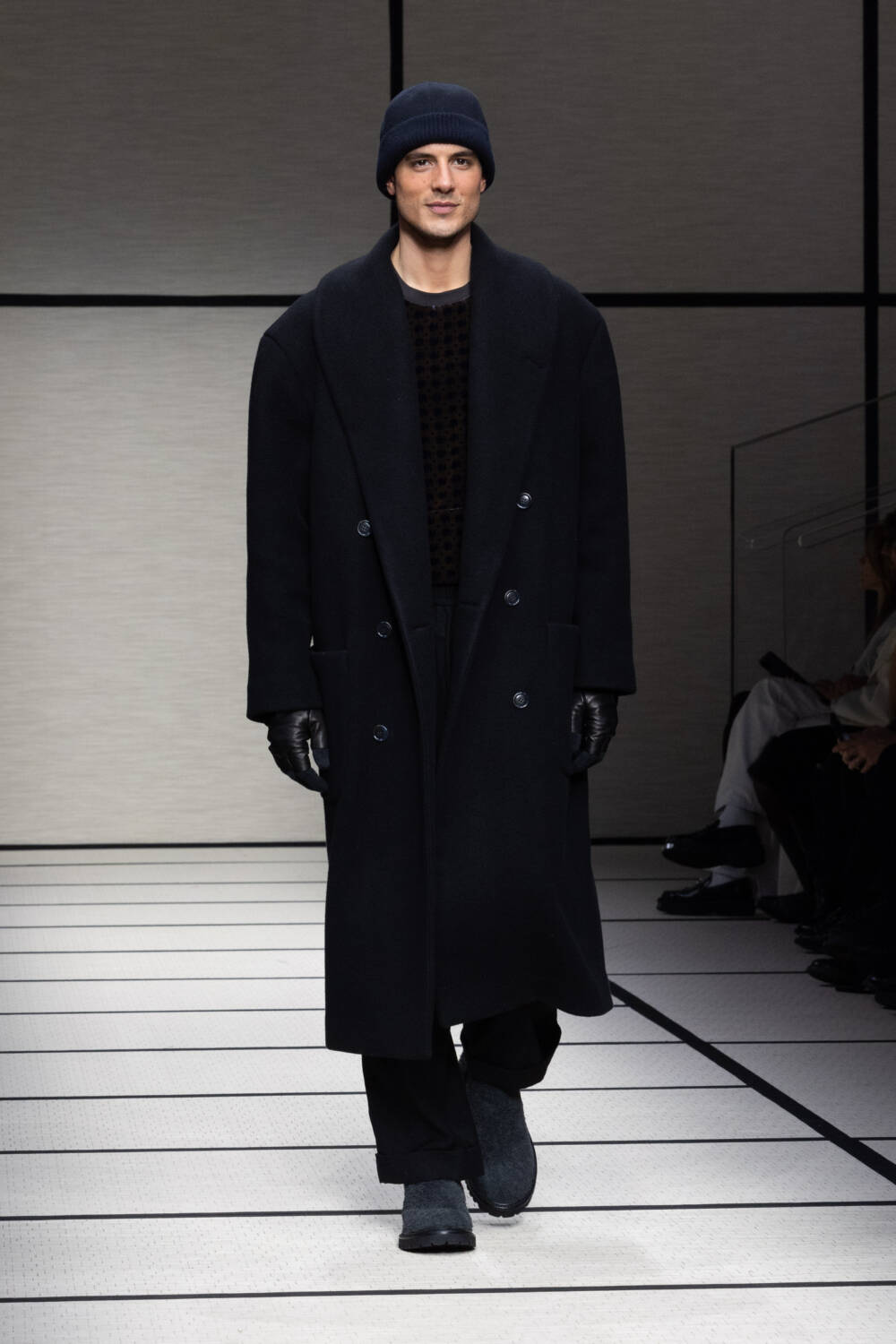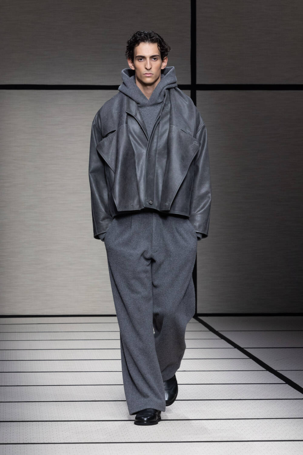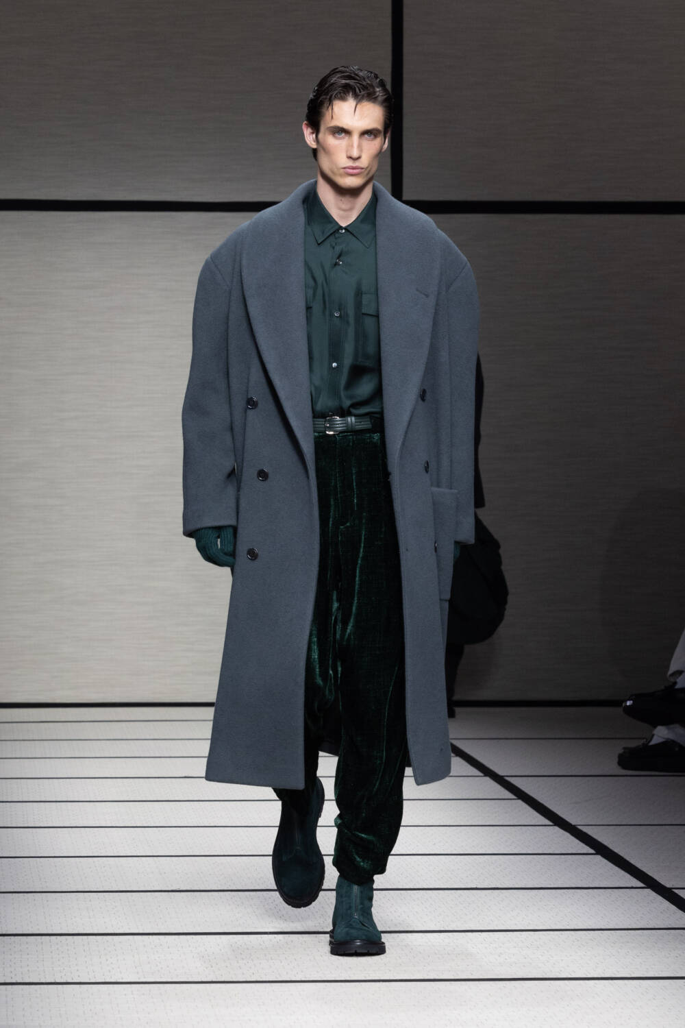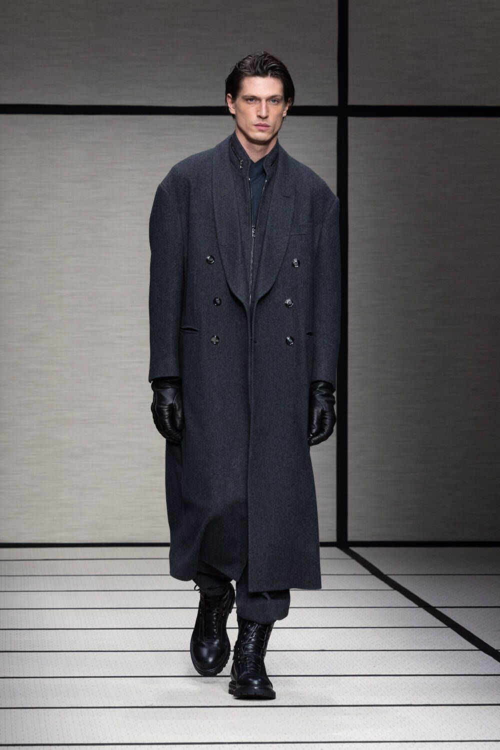 This season, Mr Armani was led by the idea of “elegance to live in”. It’s something that’s always been engrained in the Giorgio Armani DNA; he is the man, after all, who liberated the suit over 40 years ago. Here there was a focus on loose silhouettes that were still formal in tone. Woollen trousers were cut wide, cocooning overcoats were oversized and rounded at the shoulder and supple grey cashmere knits were layered for maximum comfort.