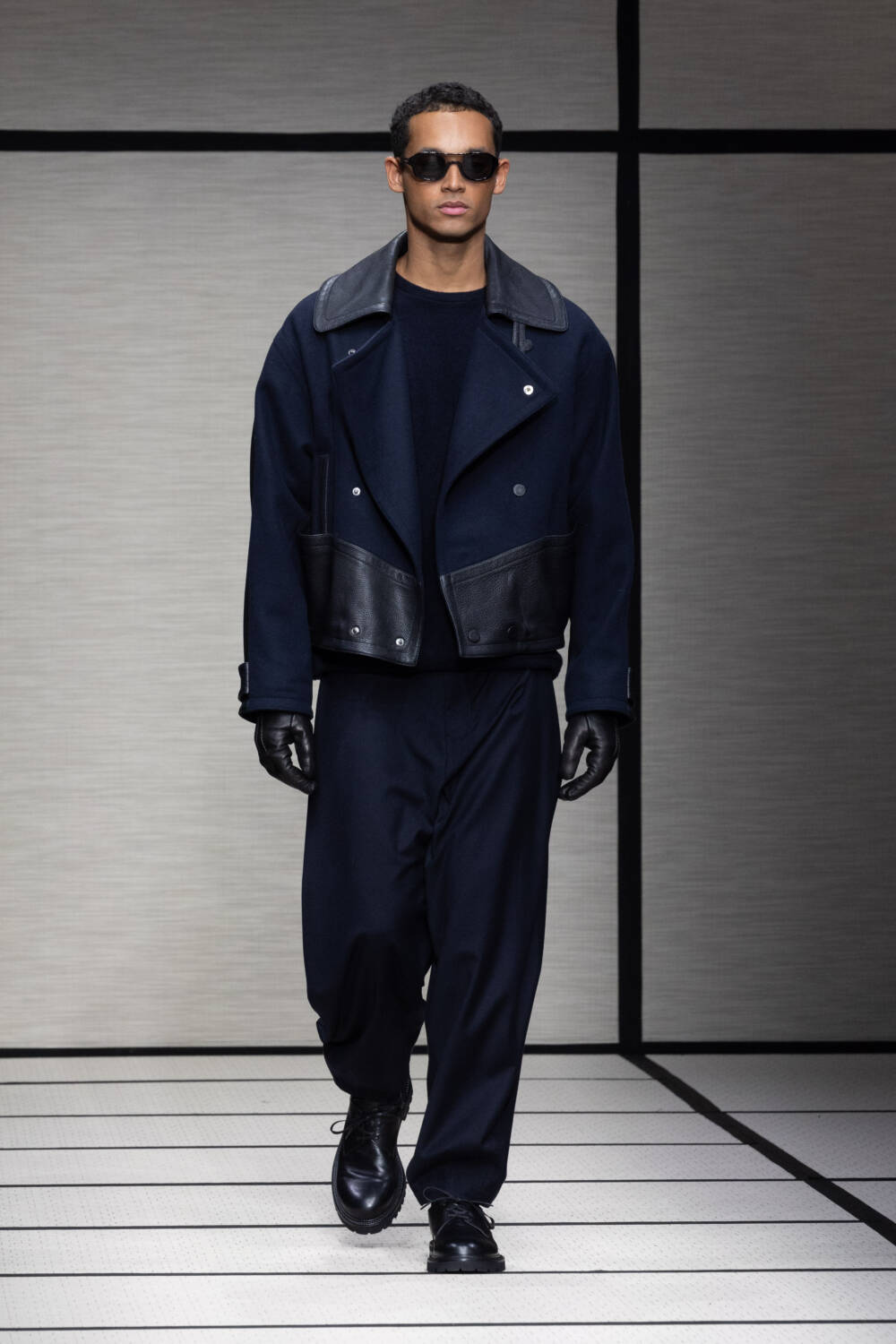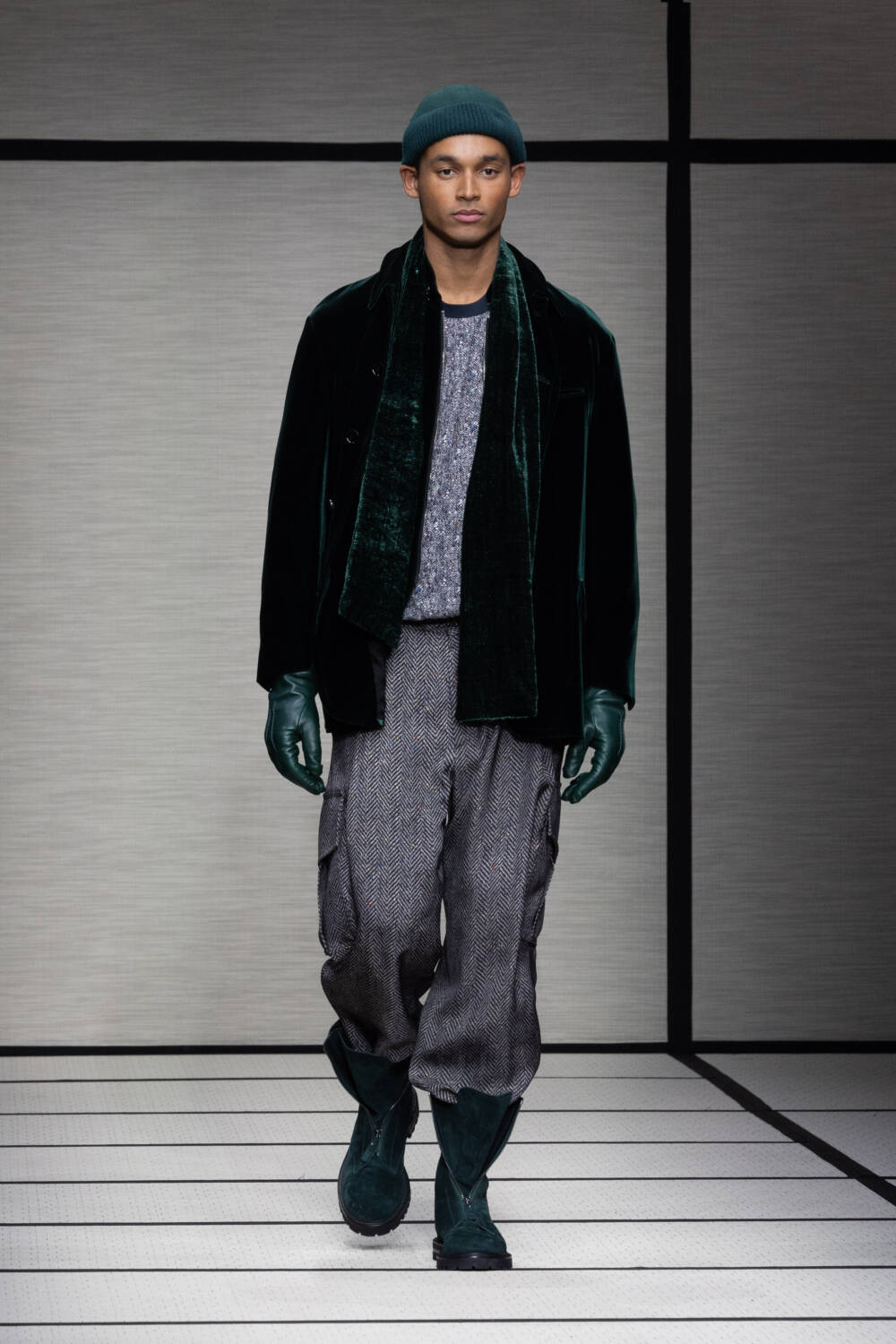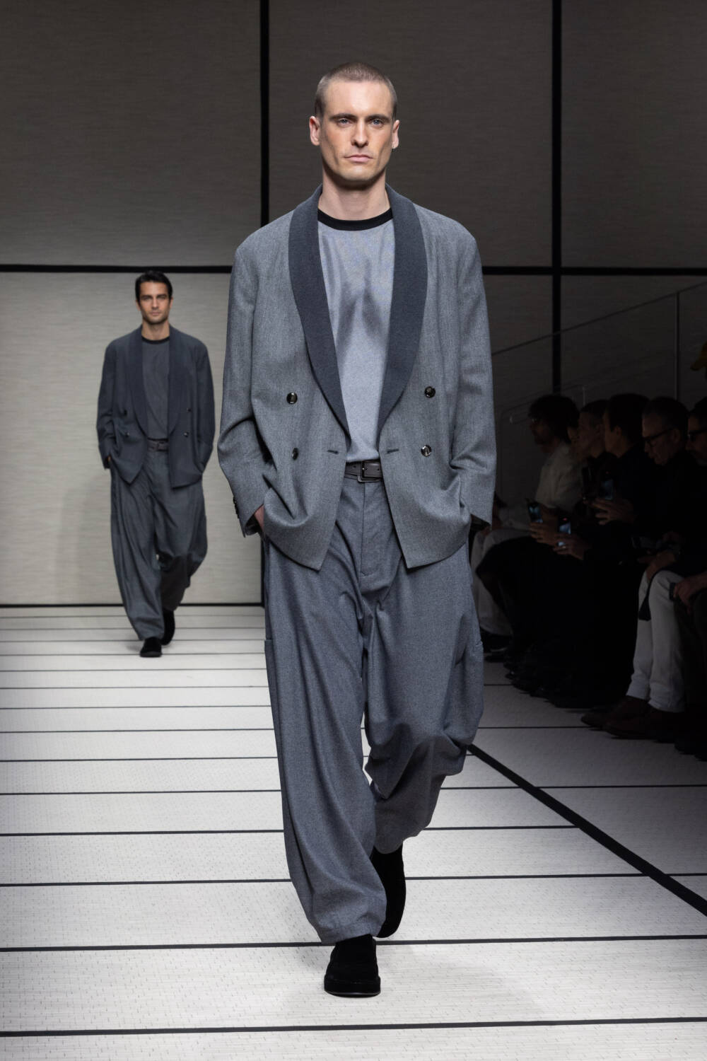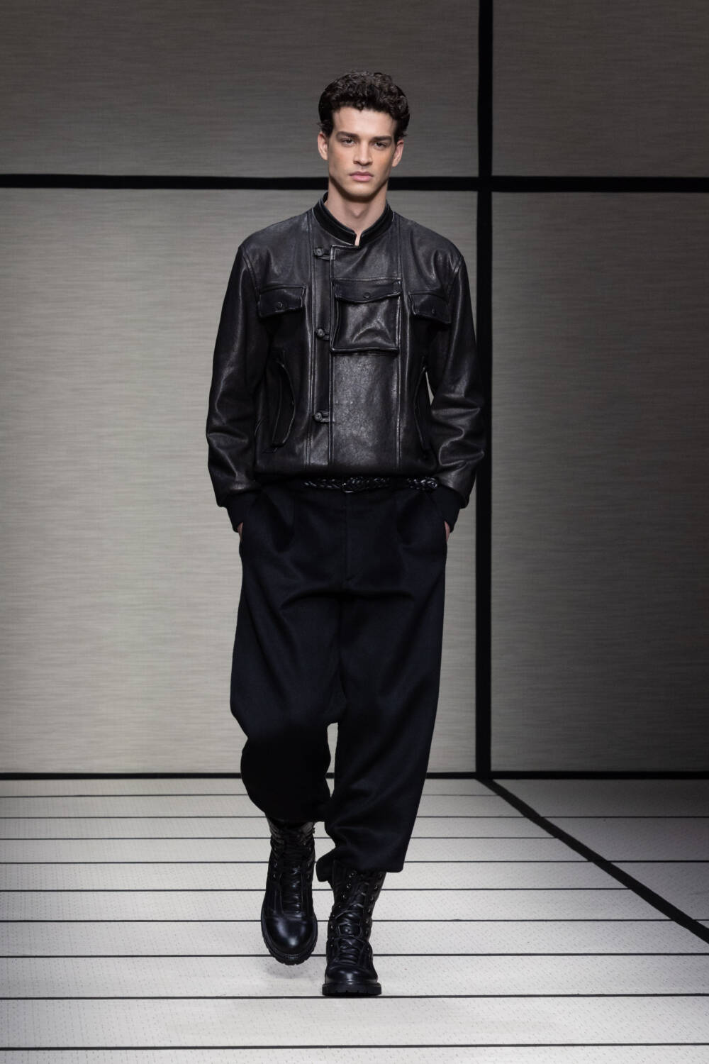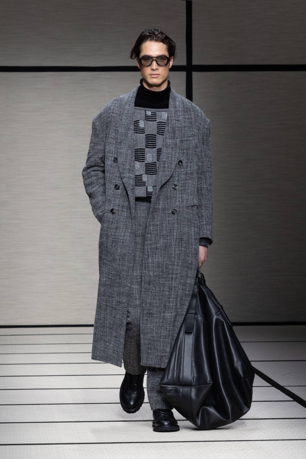 This season, Mr Armani was led by the idea of “elegance to live in”. It’s something that’s always been engrained in the Giorgio Armani DNA; he is the man, after all, who liberated the suit over 40 years ago. Here there was a focus on loose silhouettes that were still formal in tone. Woollen trousers were cut wide, cocooning overcoats were oversized and rounded at the shoulder and supple grey cashmere knits were layered for maximum comfort.