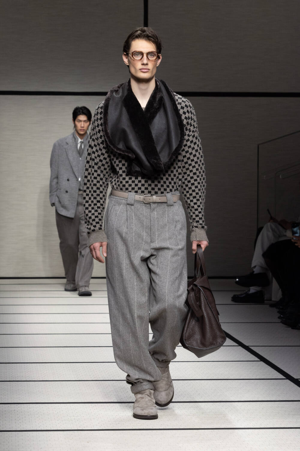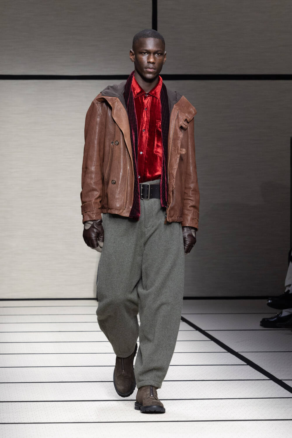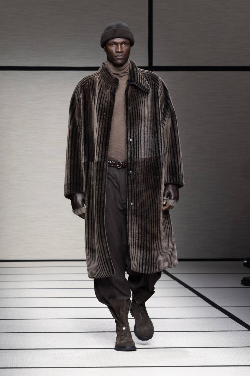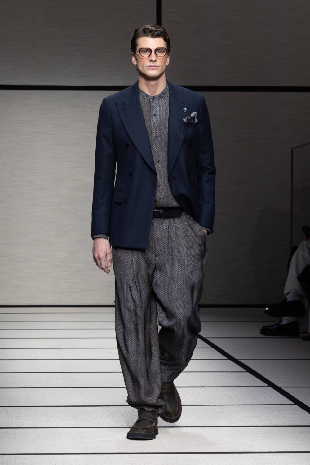 This season, Mr Armani was led by the idea of “elegance to live in”. It’s something that’s always been engrained in the Giorgio Armani DNA; he is the man, after all, who liberated the suit over 40 years ago. Here there was a focus on loose silhouettes that were still formal in tone. Woollen trousers were cut wide, cocooning overcoats were oversized and rounded at the shoulder and supple grey cashmere knits were layered for maximum comfort.