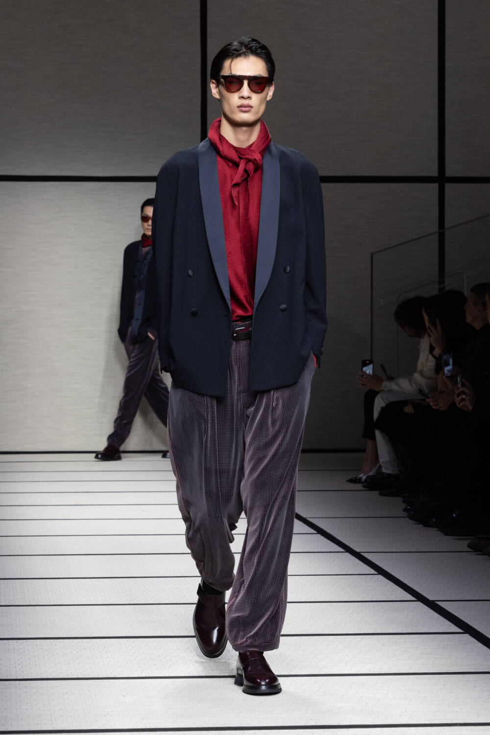 Primary reds and blues perforated a mostly muted palette, which included long-line beige suit jackets and inky velvet twinsets. With an interlude of metallic Armani Neve range, the latter part of the collection moved into more glamorous territory, while still maintaining a relaxed mood when it came to silhouette. It was a handsome wardrobe to swear by.