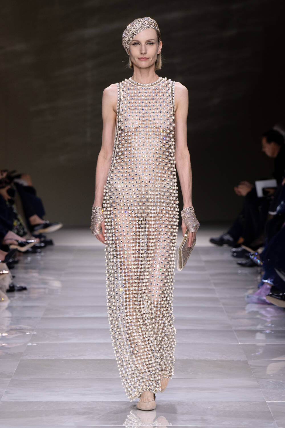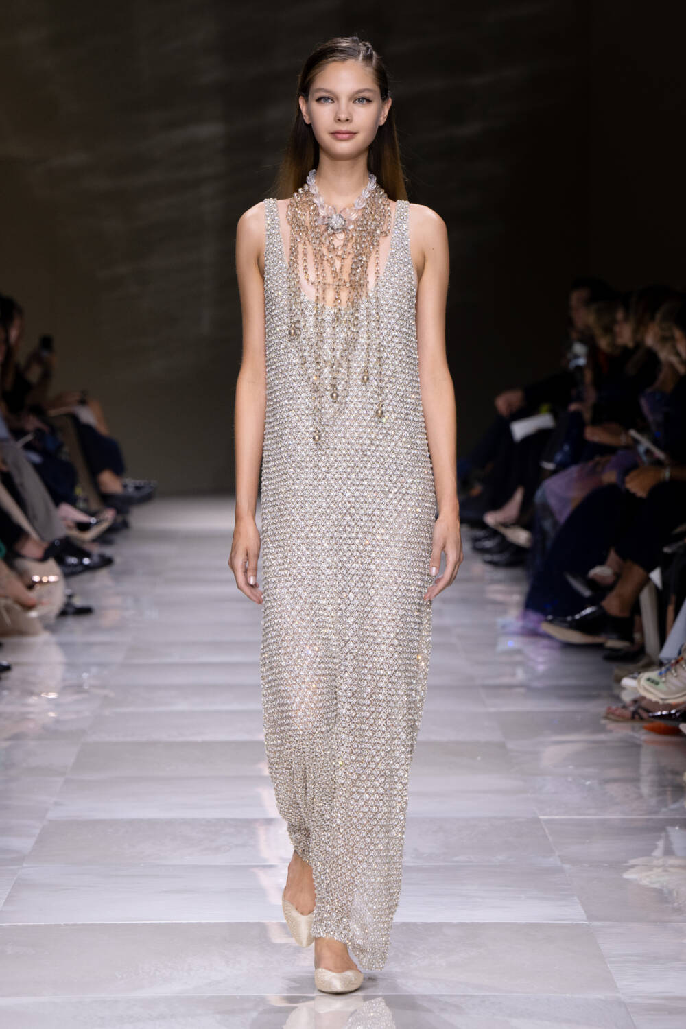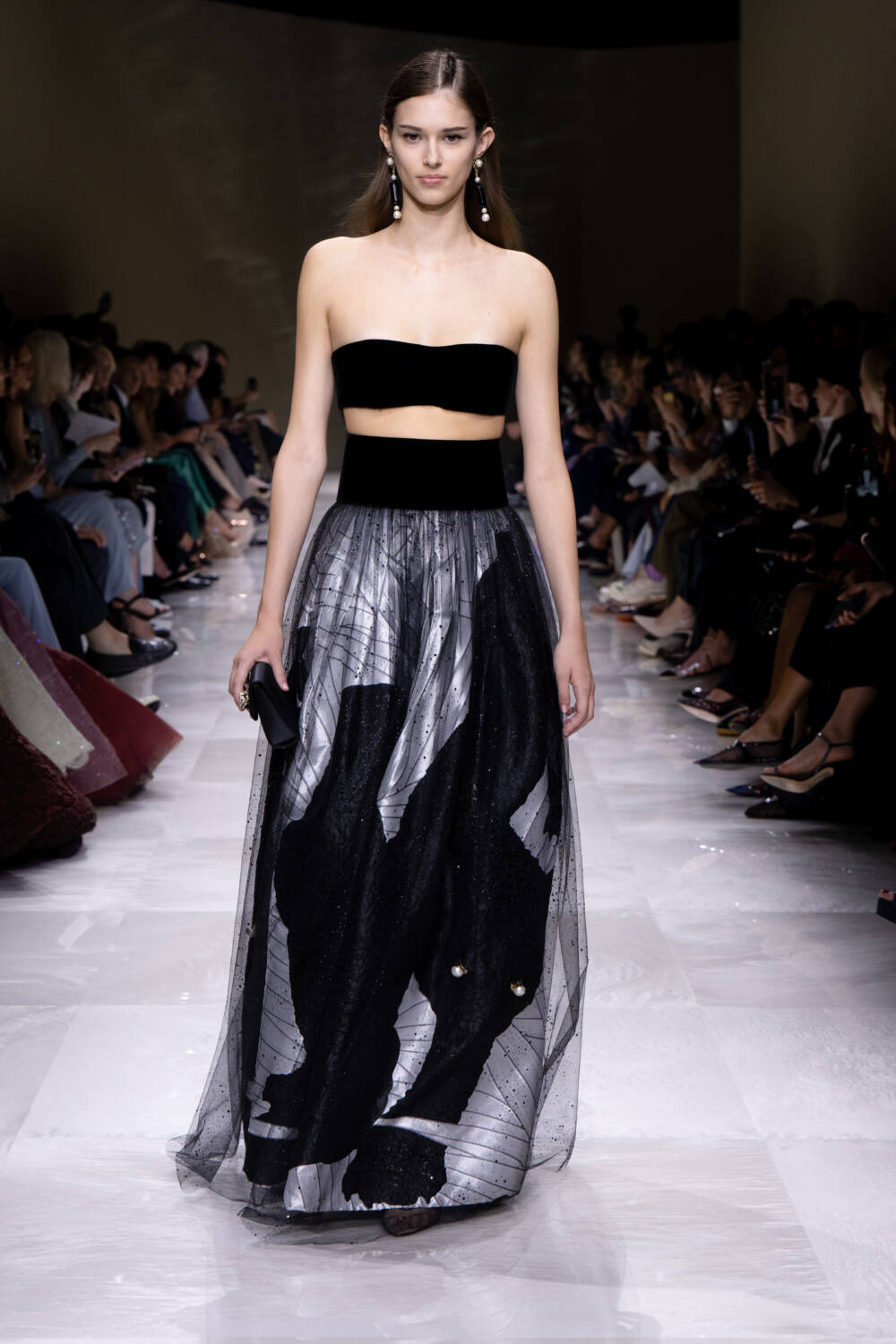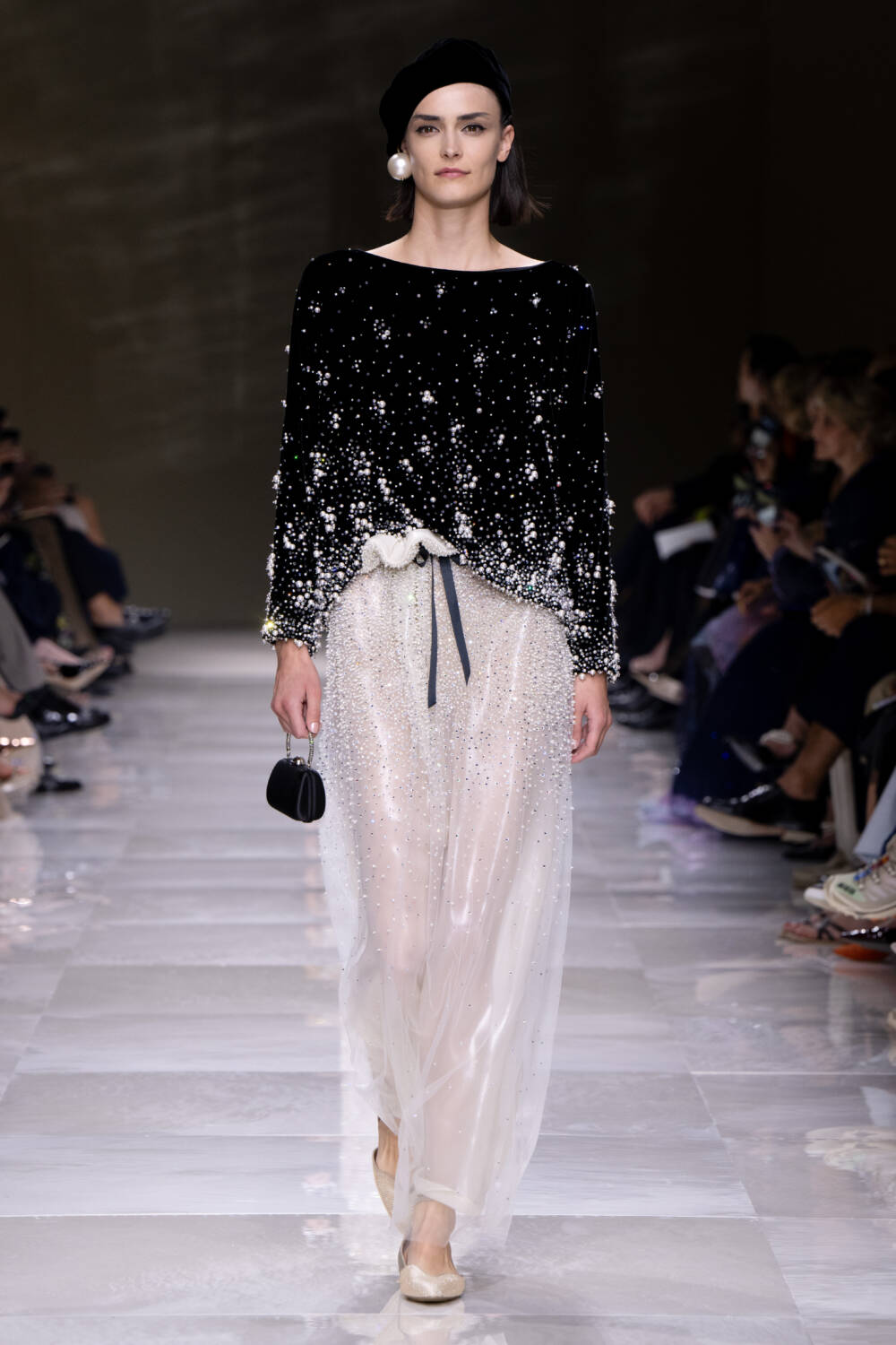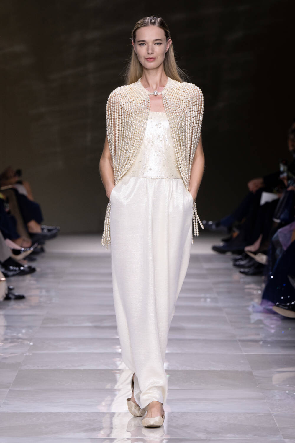 Calling the collection Pearls, and finding its point of departure in the natural stone, Giorgio Armani Privé AW24 was an opulent affair. Paying heed to a widespread “need for serenity” the pearl was the perfect muse for the storied designer, who was attracted to the jewel due to its cultural associations with “the moon, water, wisdom, purity and love”. What he imagined gave birth to a procession of subtly alluring women walking in silk trousers that flowed beneath sculpted blazers or wraparound jackets with precise shoulders like liquid gold. Tops and skirts were just as fluid. Floor-length dresses traced the women’s figures with an enchanting lightness so that with every step, her movements, however subtle, could be seen.
