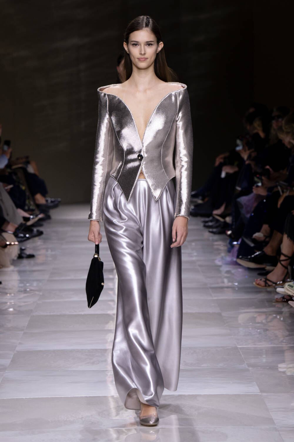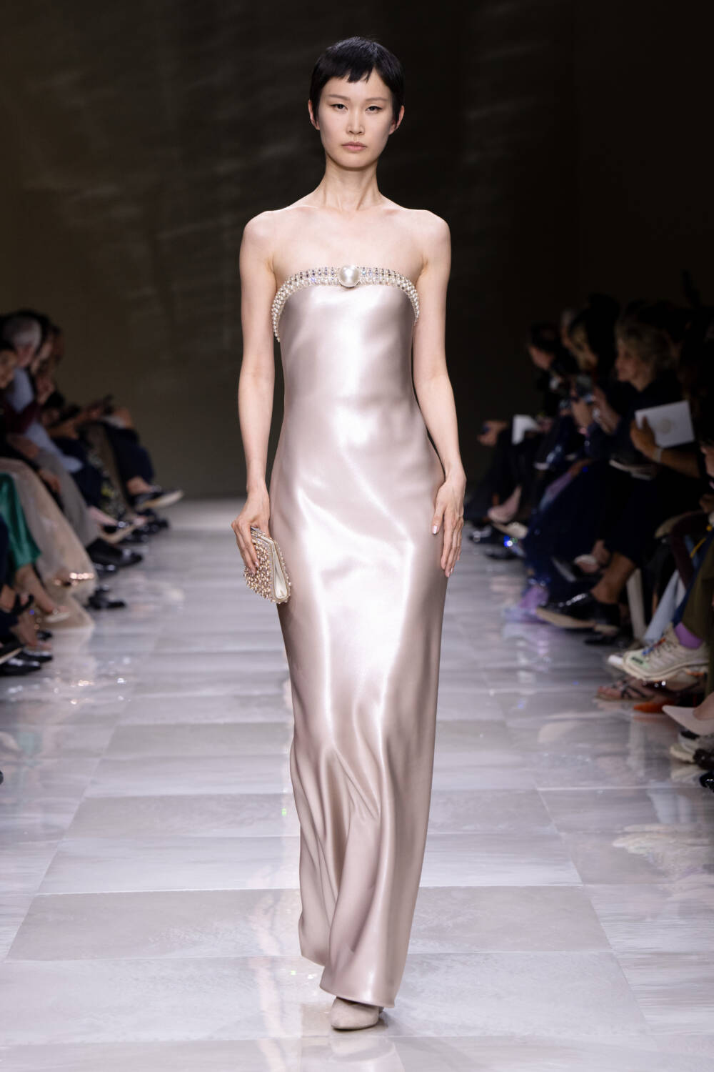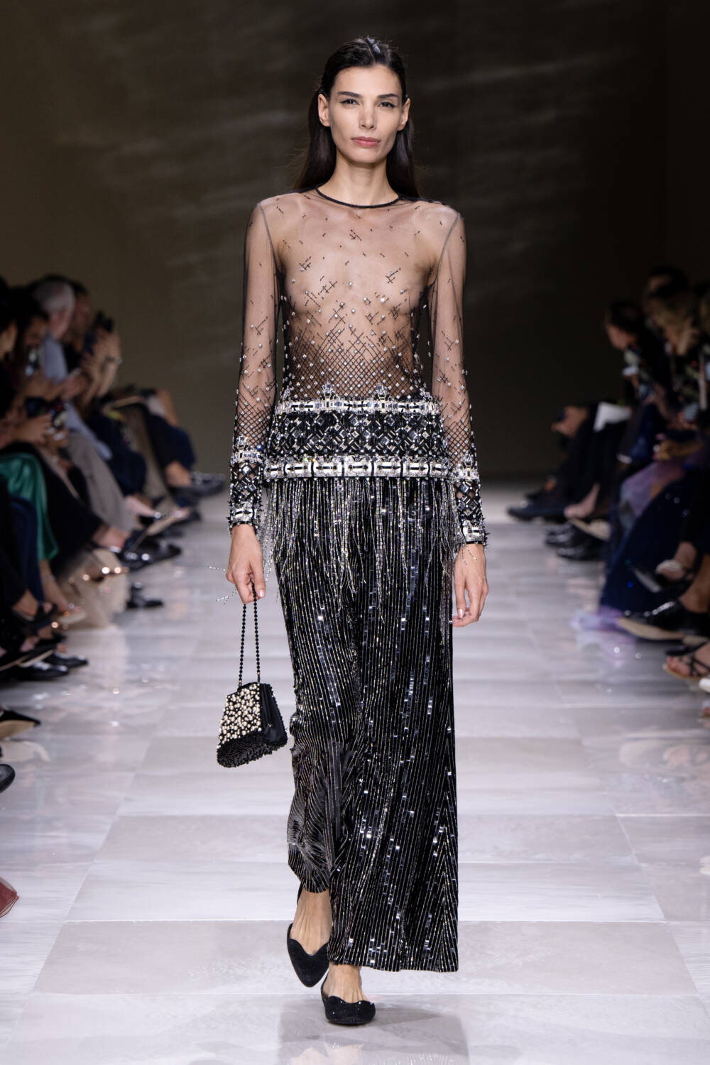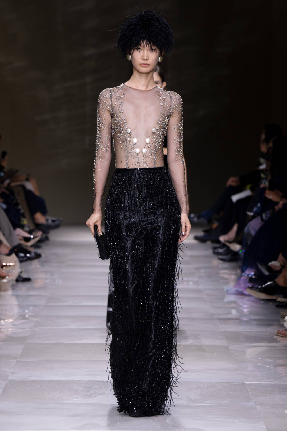Calling the collection Pearls, and finding its point of departure in the natural stone, Giorgio Armani Privé AW24 was an opulent affair. Paying heed to a widespread “need for serenity” the pearl was the perfect muse for the storied designer, who was attracted to the jewel due to its cultural associations with “the moon, water, wisdom, purity and love”. What he imagined gave birth to a procession of subtly alluring women walking in silk trousers that flowed beneath sculpted blazers or wraparound jackets with precise shoulders like liquid gold. Tops and skirts were just as fluid. Floor-length dresses traced the women’s figures with an enchanting lightness so that with every step, her movements, however subtle, could be seen.