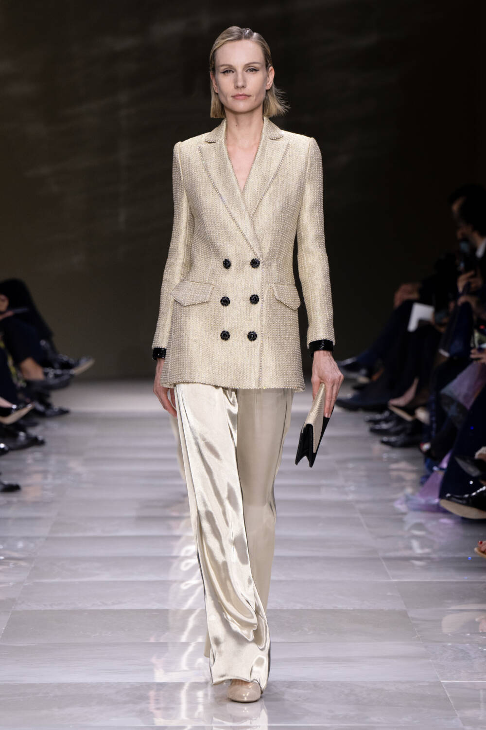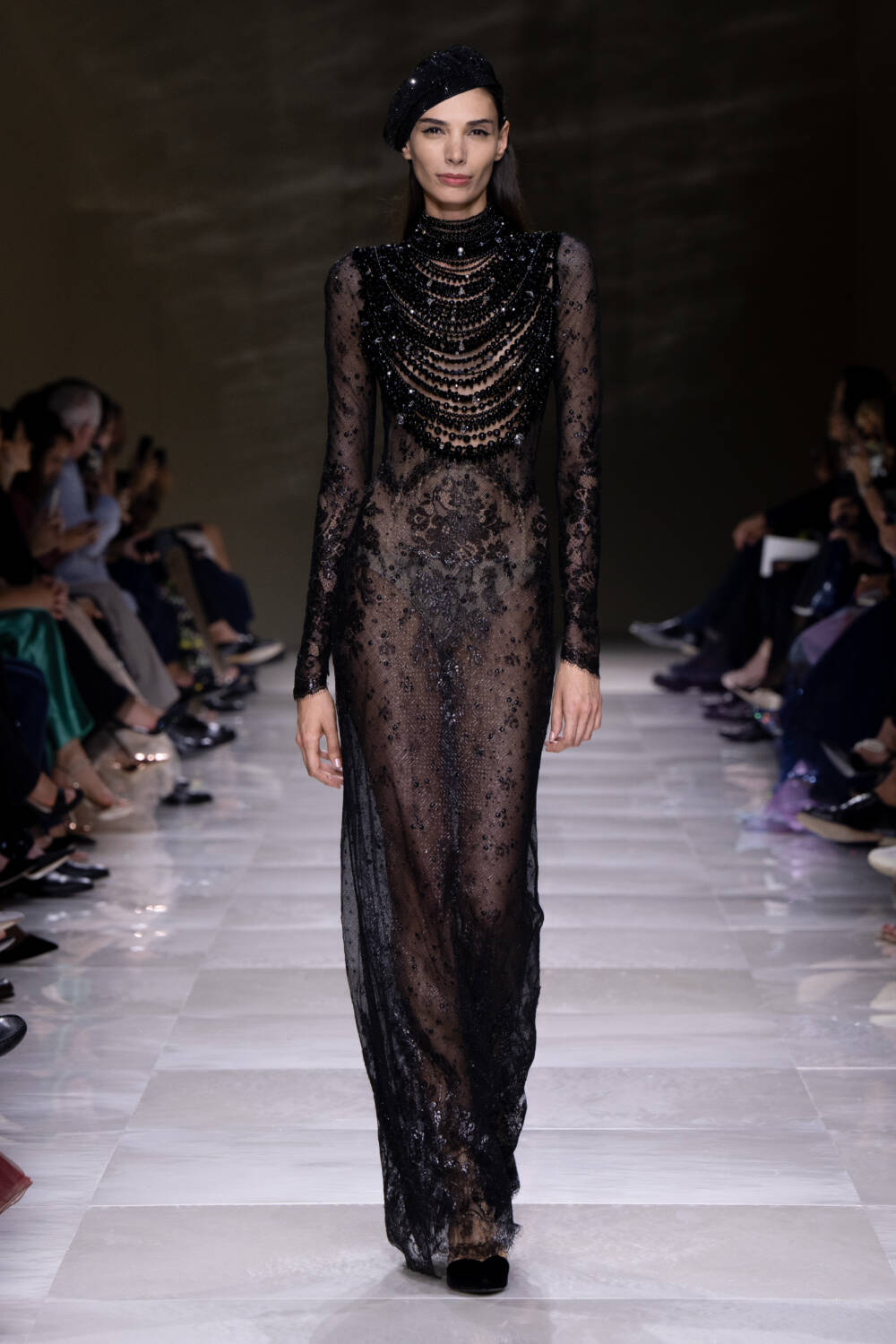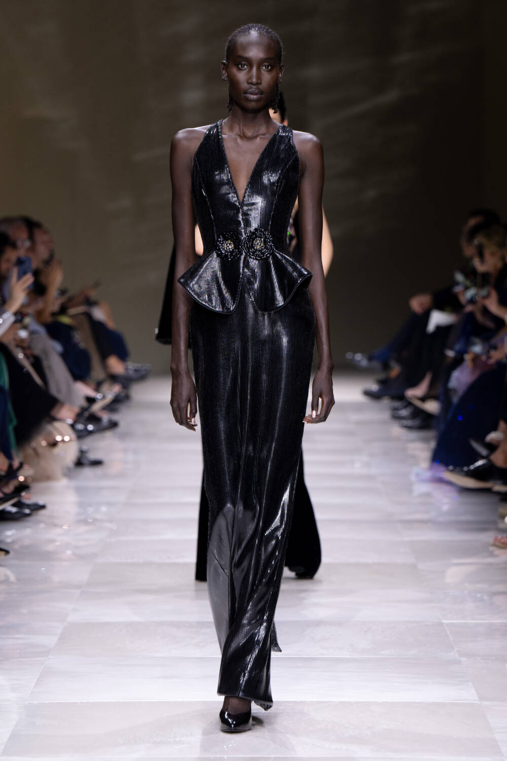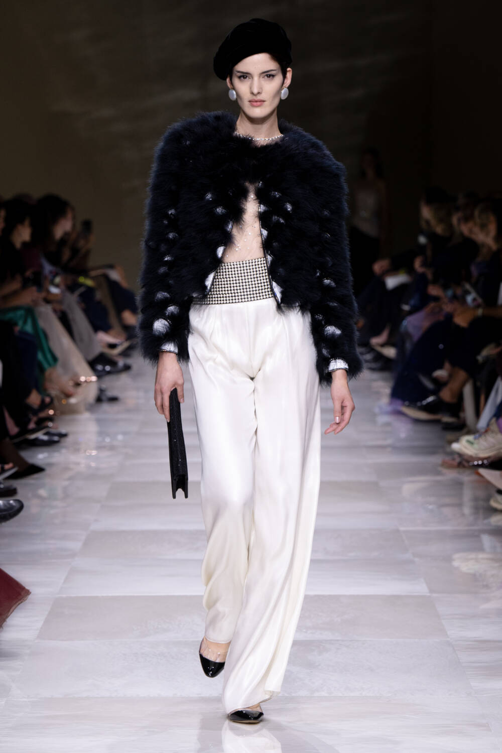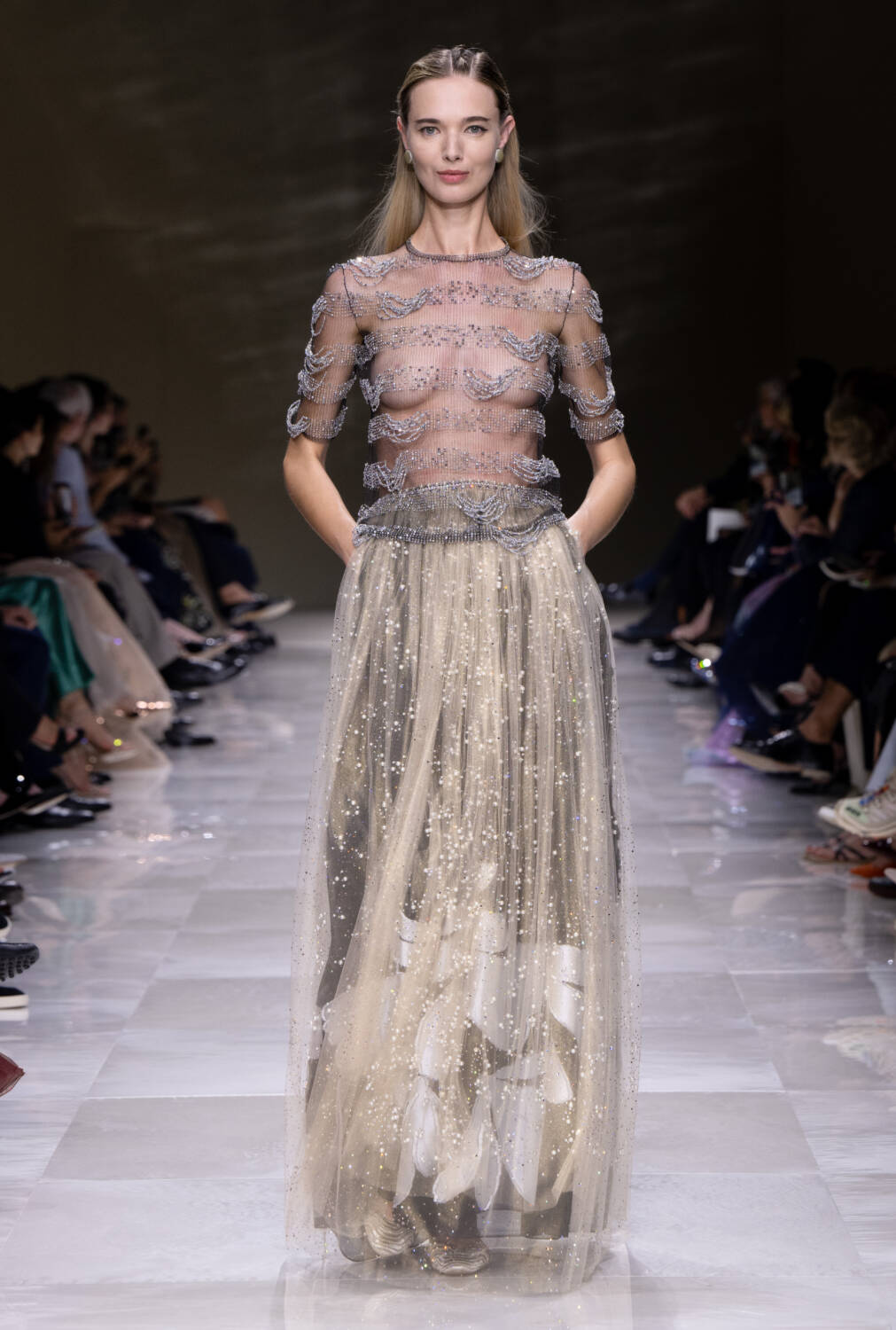 Calling the collection Pearls, and finding its point of departure in the natural stone, Giorgio Armani Privé AW24 was an opulent affair. Paying heed to a widespread “need for serenity” the pearl was the perfect muse for the storied designer, who was attracted to the jewel due to its cultural associations with “the moon, water, wisdom, purity and love”. What he imagined gave birth to a procession of subtly alluring women walking in silk trousers that flowed beneath sculpted blazers or wraparound jackets with precise shoulders like liquid gold. Tops and skirts were just as fluid. Floor-length dresses traced the women’s figures with an enchanting lightness so that with every step, her movements, however subtle, could be seen.