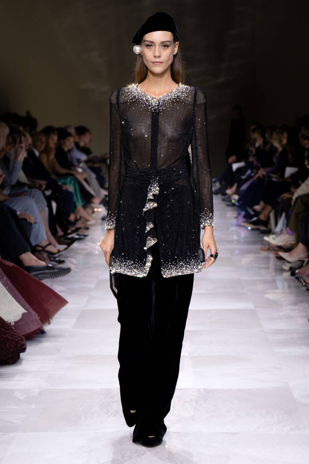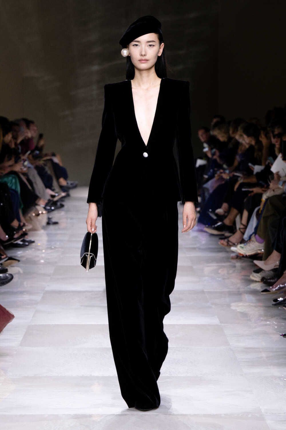 At one point, a series of tuxedo jackets, trousers and slouchy off-the-shoulder tops were cut from deep, black velvet so spellbinding you wanted to reach out and stroke it. Trousers in translucent silk jacquard possessed a quality only comparable to whispers – soft and tender, yet impalpable.