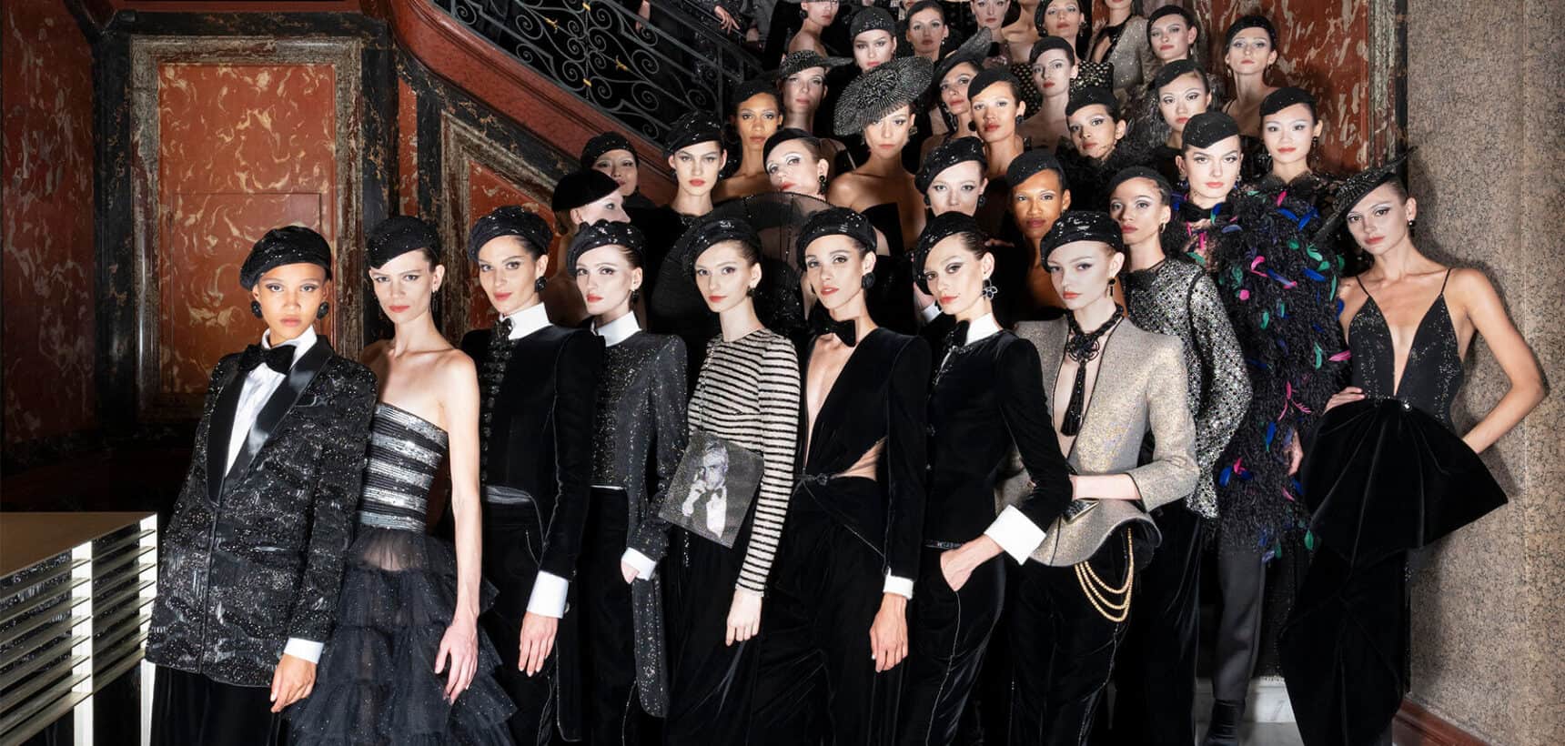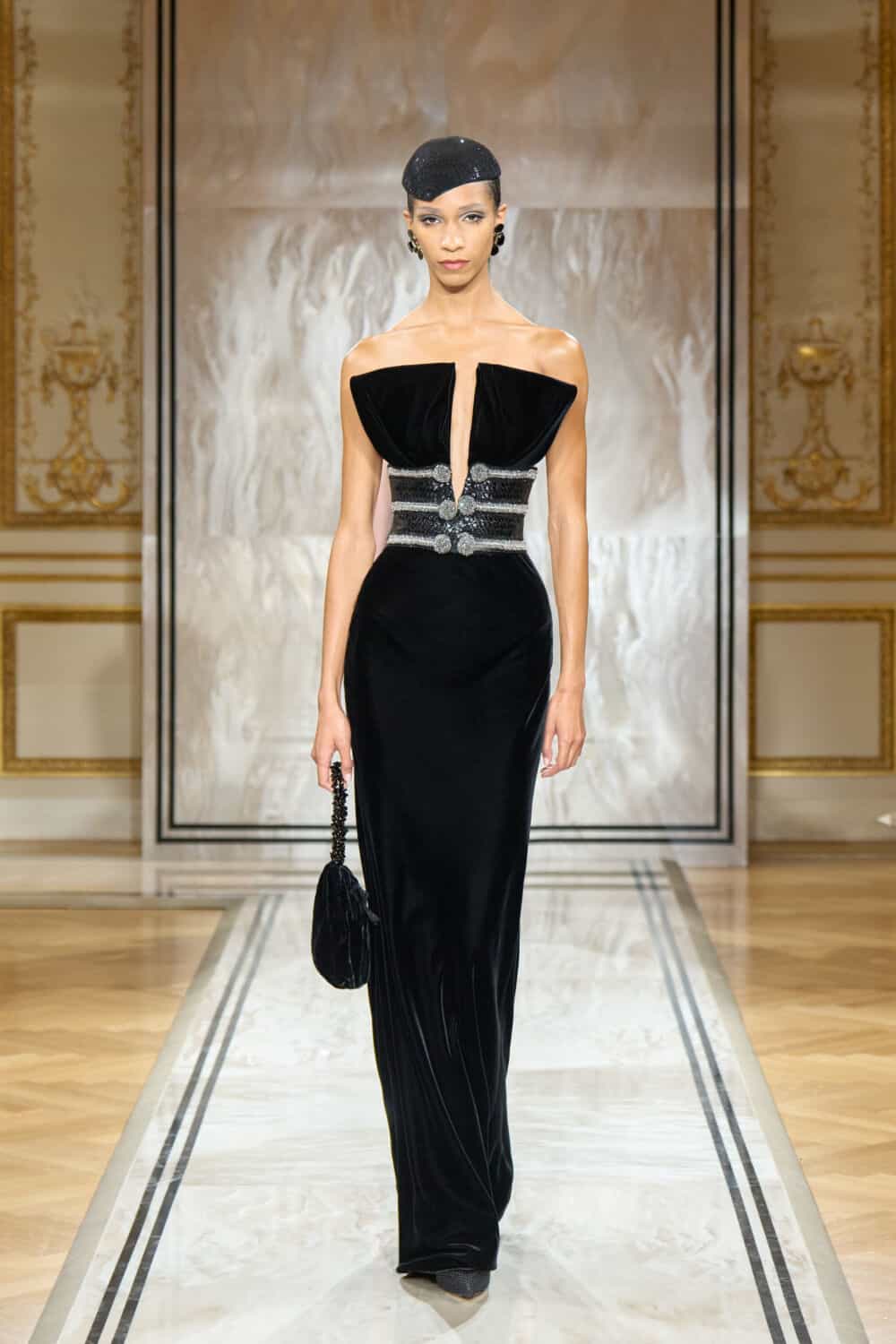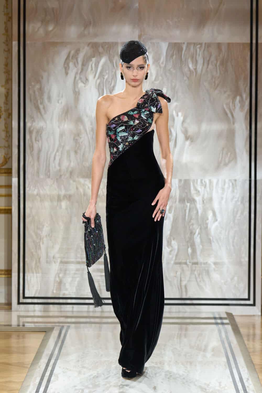 Born from black – in colour, in texture, in attitude – Giorgio Armani’s AW25 Privé collection unfurled like a sumptuous nocturne. The designer himself may have been notably absent, recuperating in Milan after an illness, but his unmistakable hand was still all over the show, guiding it with the kind of quiet confidence only he can muster.