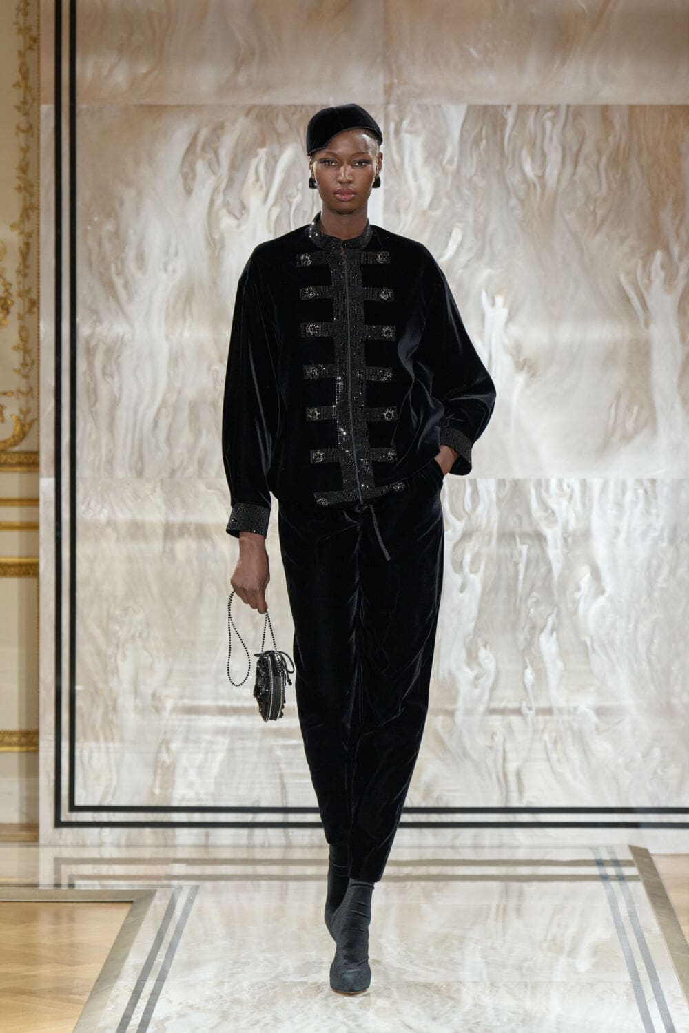 From the start, there was an undercurrent of romantic drama. Glistening brocade tops and gossamer gowns in jewel-box hues – sapphire, emerald, the occasional deep garnet – floated down the runway with a Parisian sort of ease. Before long, this gave way to a cavalcade of sharply tailored tuxedos, tailcoats, blazers and bow ties – all in black – each cut to flirt between the masculine and the feminine in that wonderfully nuanced way only Armani manages.