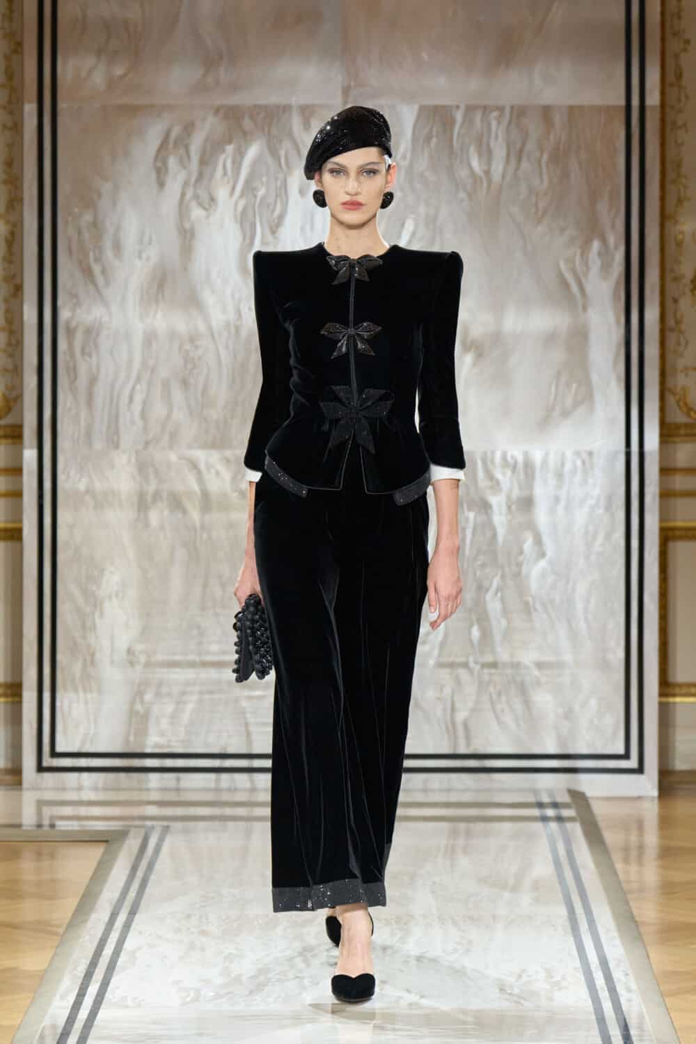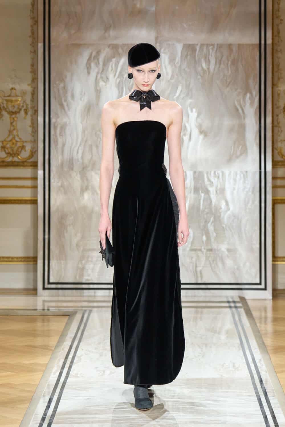 The silhouettes shimmered with a tangible luminosity too, thanks to sumptuous velvets and metallic silks that seemed to catch every last drop of light. Evening gowns dripped with pavé crystals or were crowned with oversized bows, sheer plastrons and cuffs that hugged the wrist like jewellery. Meanwhile little flashes of gold linings winked from beneath hems and lapels, adding a playful whisper of excess.